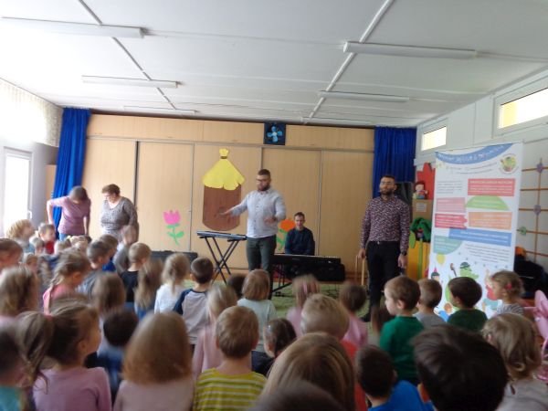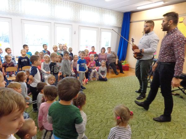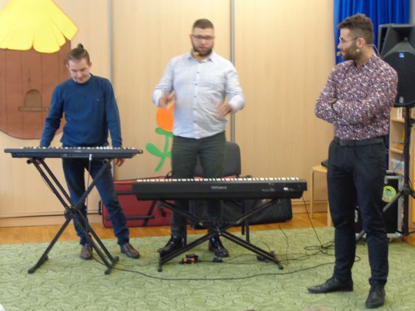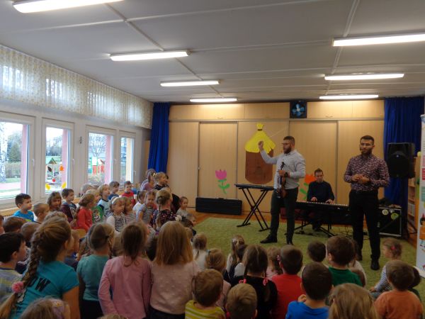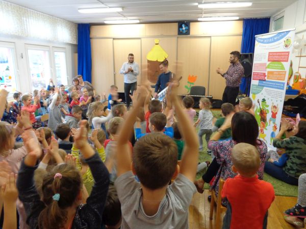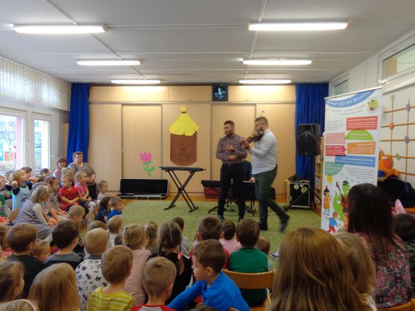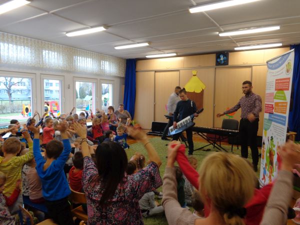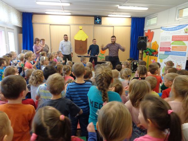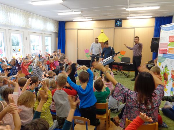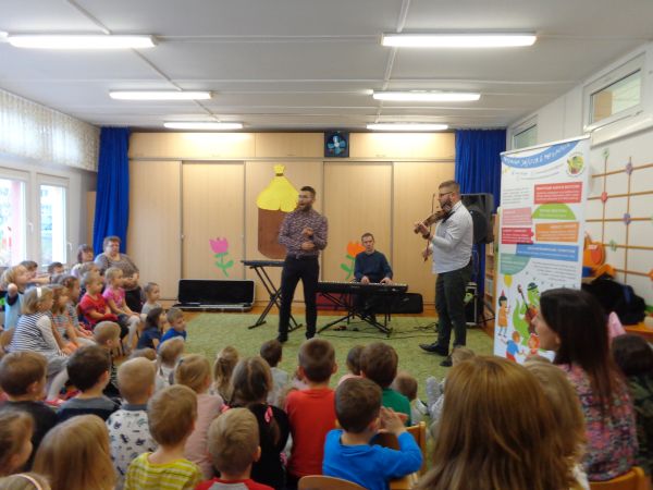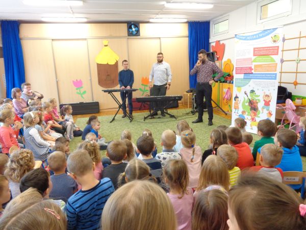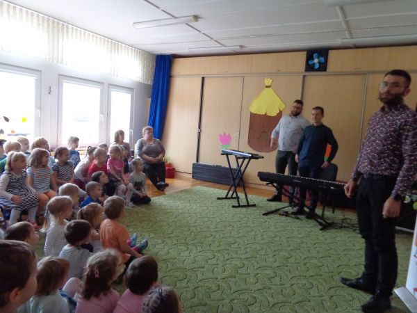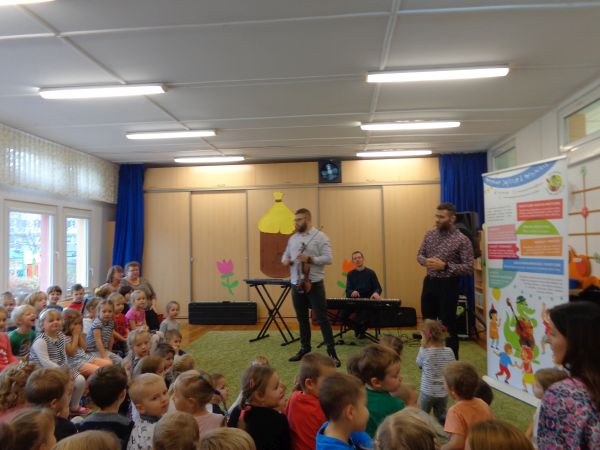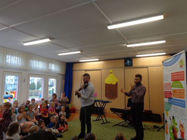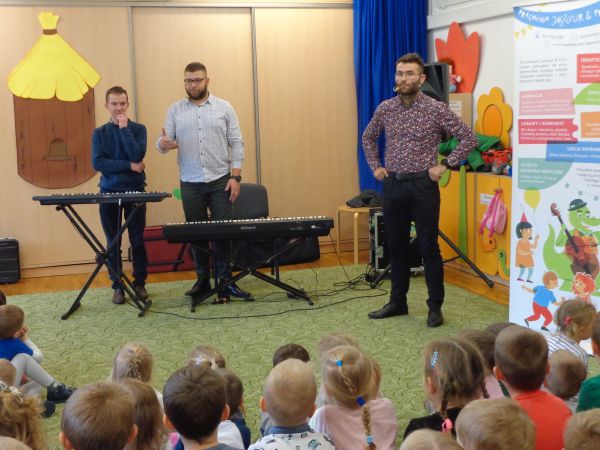 22.11.2018r. nasze przedszkole odwiedziła grupa "Jaszczur&Przyjaciele", która zaprezentowała audycję muzyczną. Dzieci mogły aktywnie uczestniczyć w audycji, odgadywały muzyczne zagadki, śpiewały piosenki. Zobaczyły, jak gra się na różnych instrumentach, poznały m.in. pianino oraz syntezator. Wszystko to w radosnej atmosferze. Mamy nadzieję, że spotkamy się jeszcze nie raz.