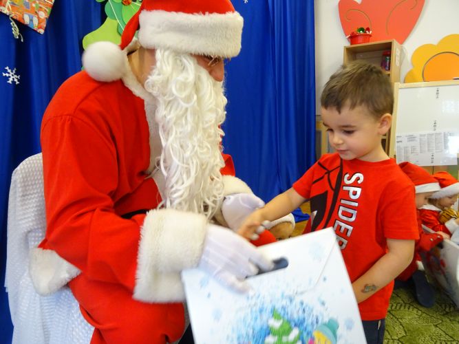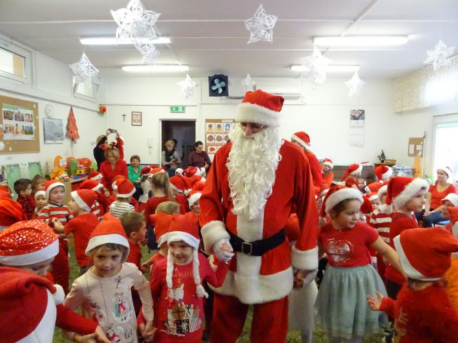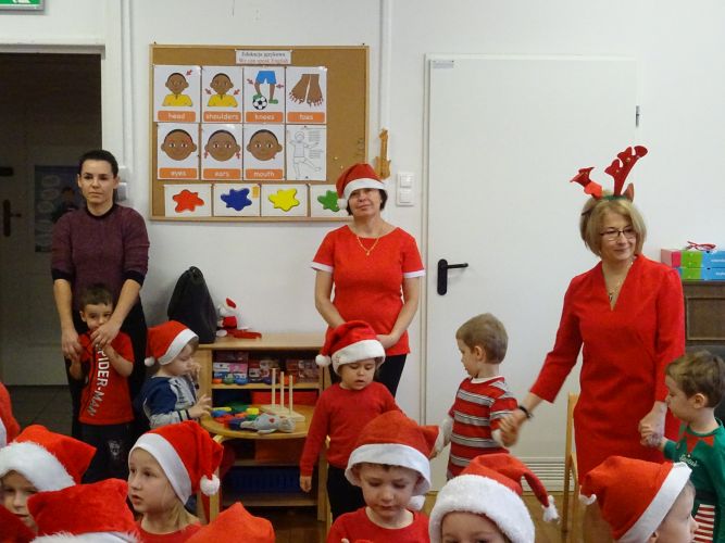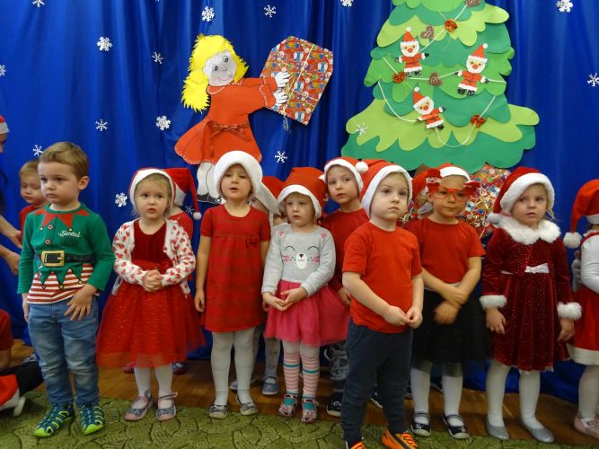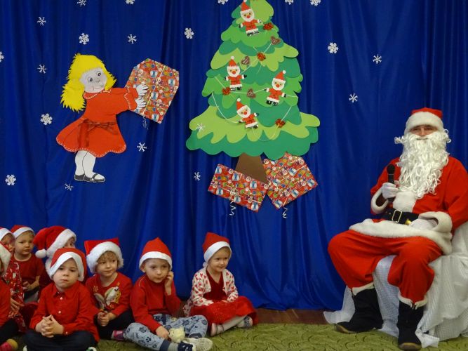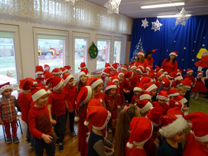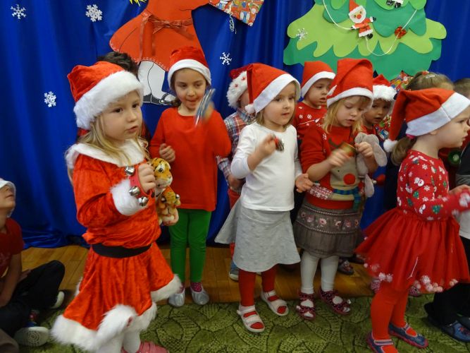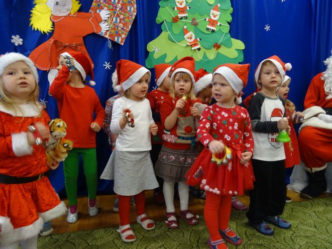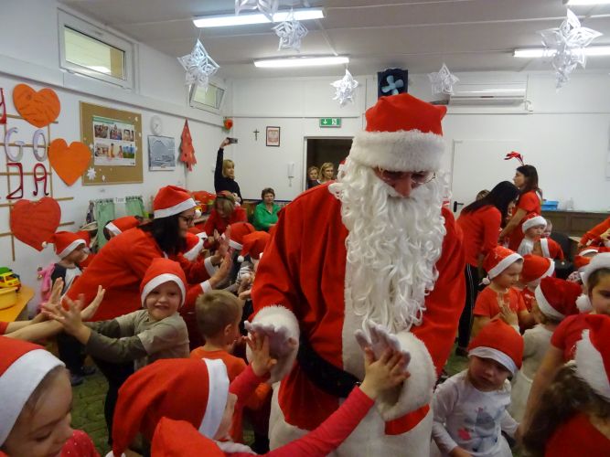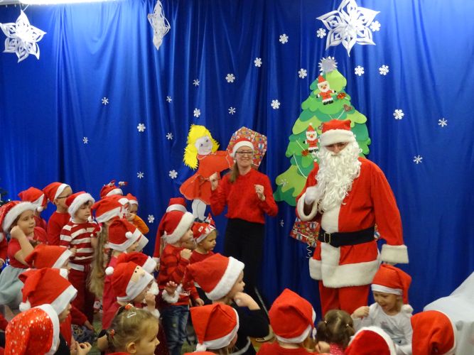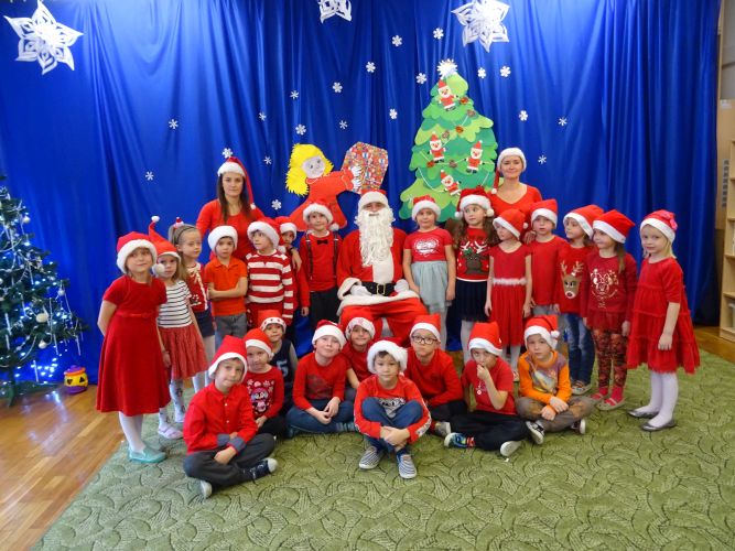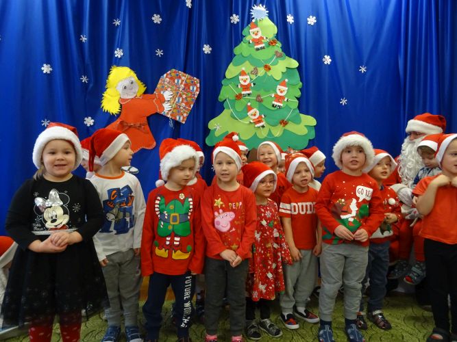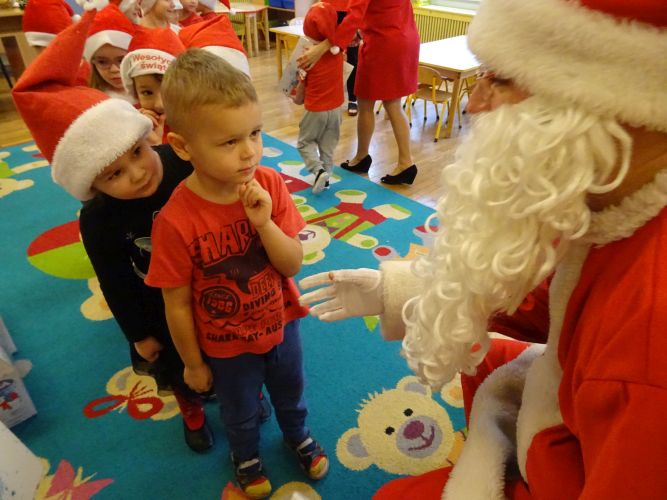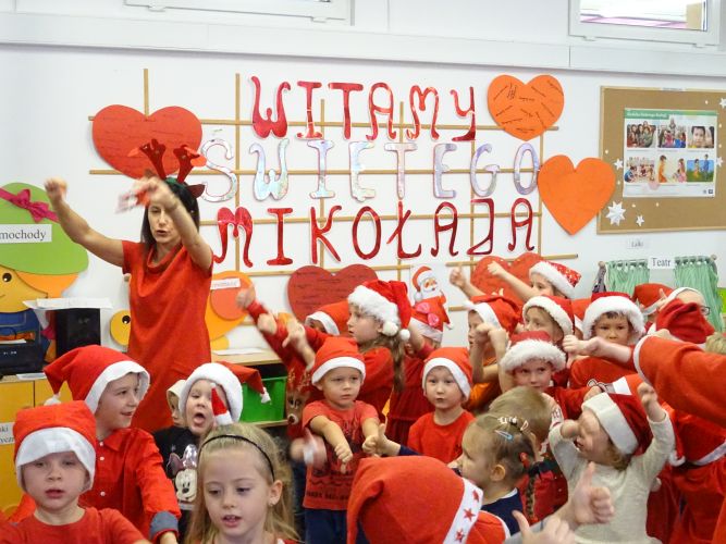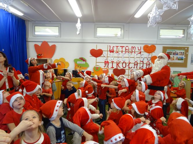 Święty Mikołaj każdego roku odwiedza dzieci w każdym miejscu na całym świecie. 6.12.2018 r. z workiem pełnym prezentów przybył również do naszego przedszkola. Oczekując upragnionego Gościa dzieci zrealizowały kilka zabaw,które opierały się na koncepcji inteligencji wielorakich Howarda Gardnera. Zanim dzieci przybyły na salę, gdzie miały spotkać się z wyczekiwanym gościem w swoich salach rozmawiały o krainie, z której przybywa Mikołaj, oglądały zdjęcia, mapę, globus, co sprzyjało rozwijaniu inteligencji przyrodniczej; omówiły datę przybycia Mikołaja, nazywały cyfry, rozwiązywały krzyżówki matematyczne, przez co rozwijały inteligencję logiczno-matematyczną; układały puzzle przedstawiające Świętego Mikołaja, przez co rozwijały inteligencję przestrzenną. W sali grupy "Pszczoły" zachęcane przez kolegów z grupy "Misie" dzieci odczytały napis "Witamy Świętego Mikołaja" i zostały zapoznane z adresem Mikołaja w Rovaniemi w Finlandii, co sprzyjało rozwijaniu inteligencji lingwistycznej; zatańczyły wspólnie z Mikołajem taniec "Labado", by rozwijać inteligencję kinestetyczną; ćwiczyły koncentrację, wykonywały ruchy naprzemienne przy muzyce wg kinezjologii edukacyjnej P.Dennisona, by pogłębiać rozwój inteligencji interpersonalnej; zaprezentowały piosenki w "Koncercie dla Mikołaja", tańczyły do melodii świątecznych, przez co rozwijały inteligencję muzyczną; uczestniczyły w zabawie wg instrukcji słownej "Śnieżne kule" przy muzyce z wykorzystaniem kartek papieru, co wspierało rozwój inteligencji wizualno - przestrzennej, ruchowej oraz językowej. Wszystkie dzieci aktywnie uczestniczyły z zabawach przygotowanych przez kolegów z grupy „Misie”. Po zakończonej zabawie dzieci nadsłuchiwały dźwięku dzwoneczków, które słychać było już z daleka i świadczyło o tym, że do przedszkola zbliża się Święty Mikołaj. Przedszkolaki były bardzo szczęśliwe, rozpromienione, a kiedy znalazły się blisko św. Mikołaja – niektóre z nich, trochę zawstydzone. Święty Mikołaj rozmawiał z dziećmi, zachęcał je, aby były grzeczne, słuchały rodziców i pań w przedszkolu. Na zakończenie Święty Mikołaj wszystkim przedszkolakom osobiście wręczał duże paczki, a w nich – dla każdego coś dobrego! Za prezenty dzieciaki odwdzięczyły się pięknie zaśpiewanymi piosenkami i własnoręcznie przygotowanymi pracami przedstawiającymi Mikołaja. Ten dzień na długo pozostanie w pamięci wszystkich przedszkolaków.