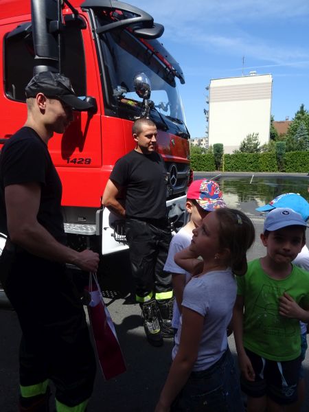 W siedzibie straży dzieci zostały przywitane przez wszystkich pełniących dyżur strażaków. Już na samym początku zademonstrowali nam swoją sprawność zjeżdżając do nas po rurze, czy przebierając się błyskawicznie w strój bojowy. Podczas spotkania zwiedzaliśmy pomieszczenia znajdujące się w jednostce oraz garaże, w których mogliśmy nie tylko obejrzeć z bliska i przymierzyć strój strażaka ale także poznać dokładnie wyposażenie samochodu strażackiego.