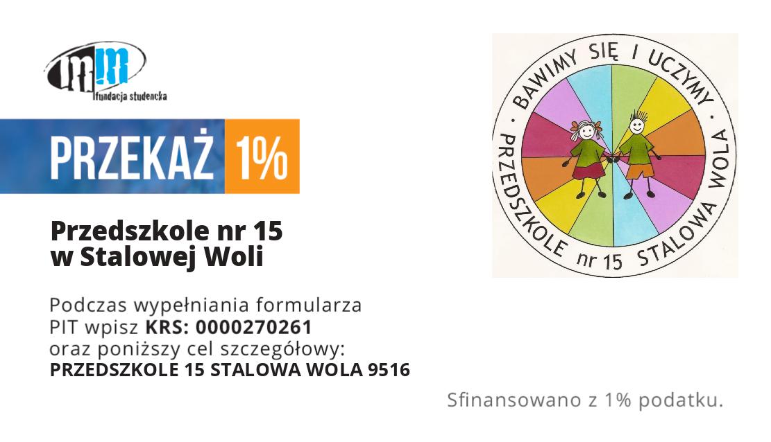 W zeznaniu podatkowym wpisać numer KRS: 0000270261 i dopisać CEL: PRZEDSZKOLE 15 STALOWA WOLA 9516. Pozyskane środki zostaną przeznaczone na sprzętu, który wzbogaci zajęcia dla dzieci.