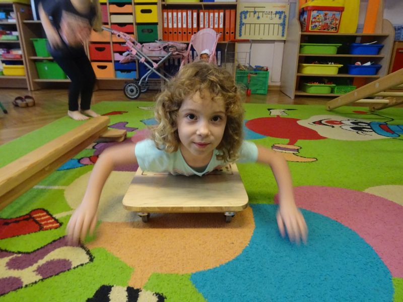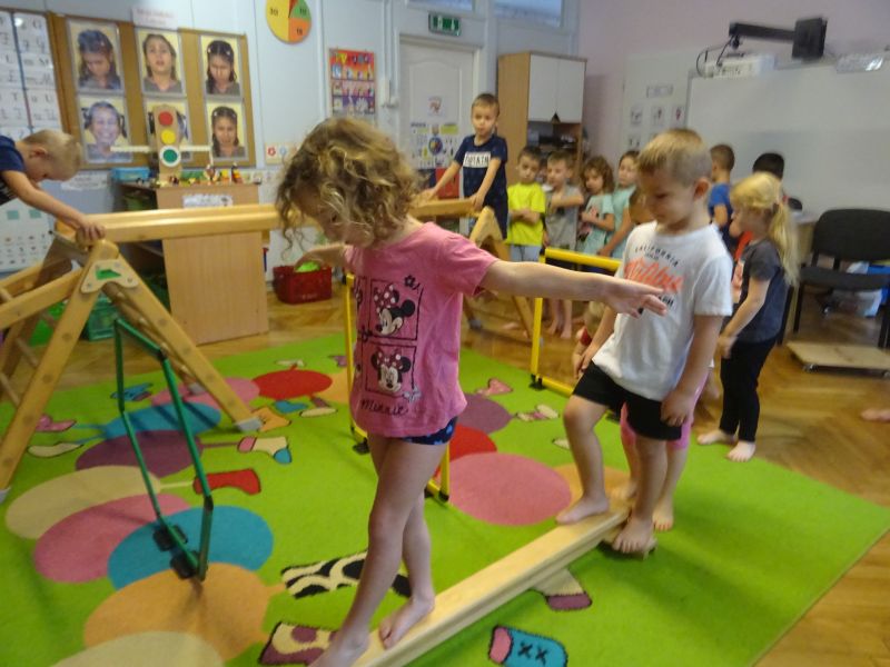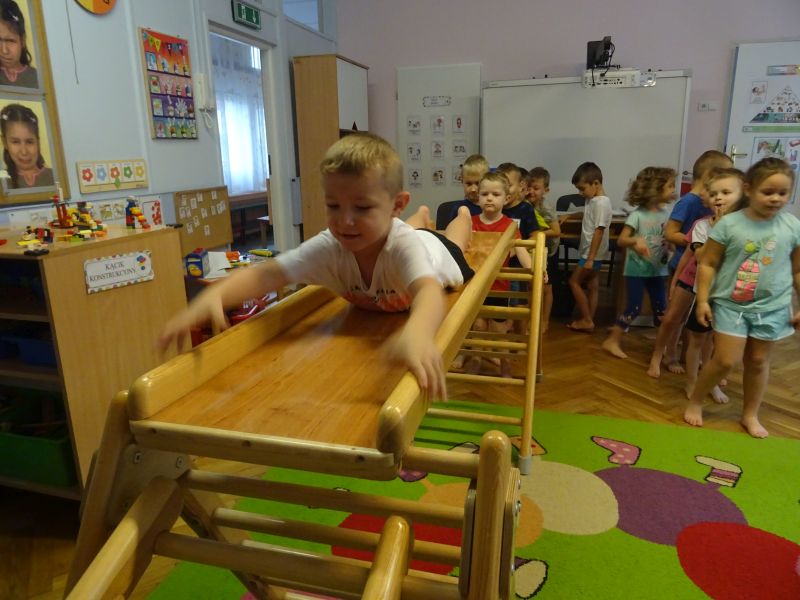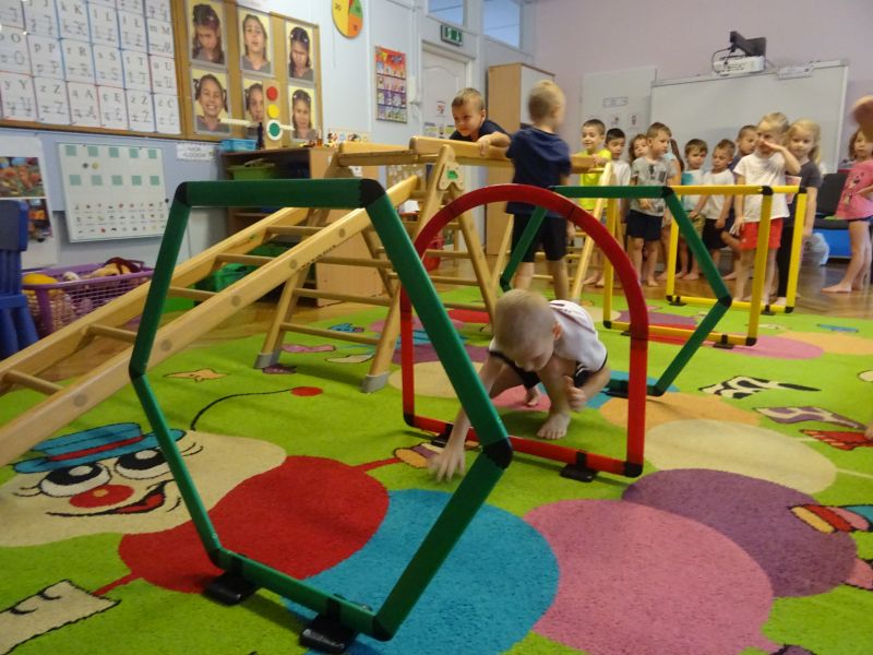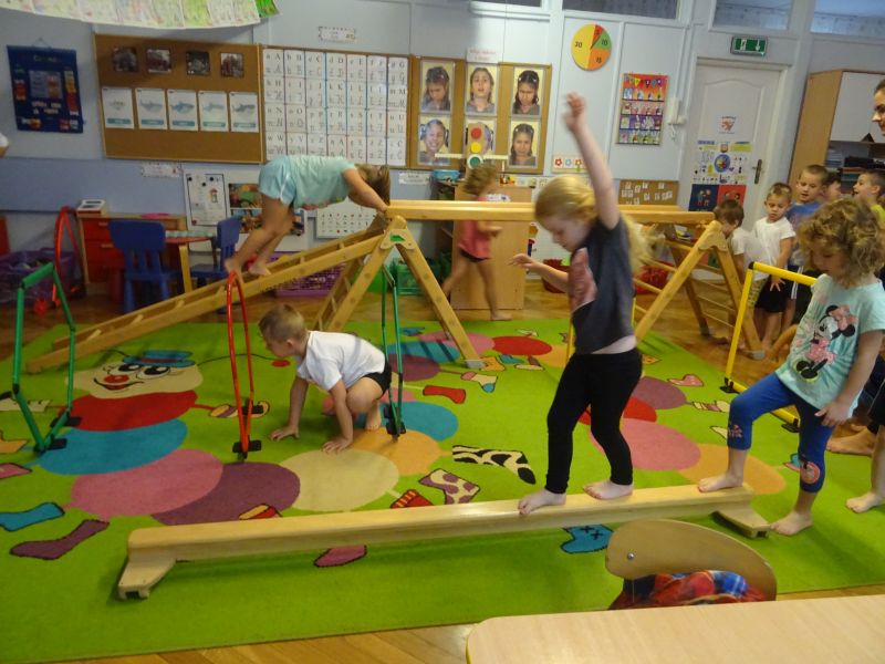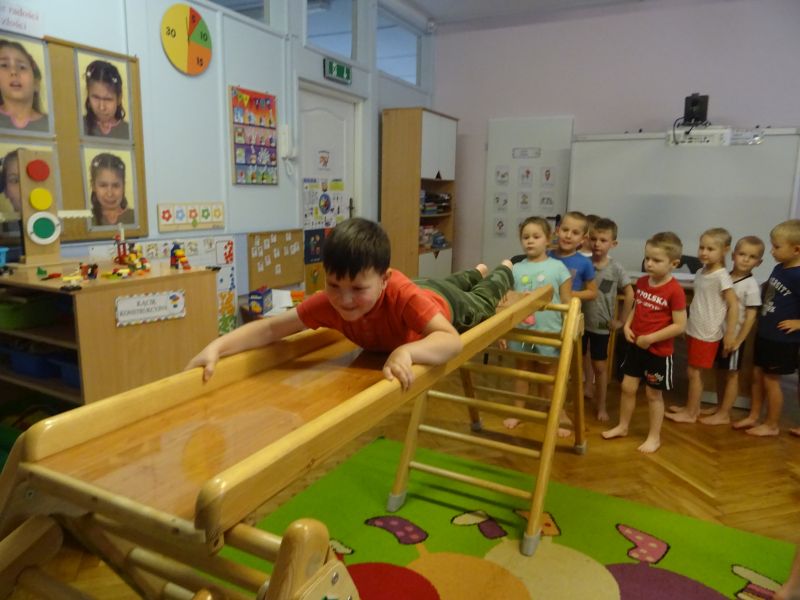 Ćwiczenia gimnastyczne umożliwiają przedszkolakom wszechstronny rozwój motoryczny. Są bardziej złożone niż ćwiczenia poranne, więc planując je, nauczyciel musi również wziąć pod uwagę umiejętności ruchowe i sprawność motoryczną poszczególnych dzieci. Ważne, by ćwiczenia pozwalały dziecku się rozwijać i dawały mu możliwość osiągania sukcesu. Dzieci bardzo chętnie uczestniczą w ćwiczeniach gimnastycznych. Podczas ćwiczeń często wykorzystywane są różnego rodzaju urządzenia jak na przykład drabinki, zjeżdżalnie oraz równoważnie. Celem zajęć był rozwój mięśni rąk i nóg oraz rozwój koordynacji ruchowej.