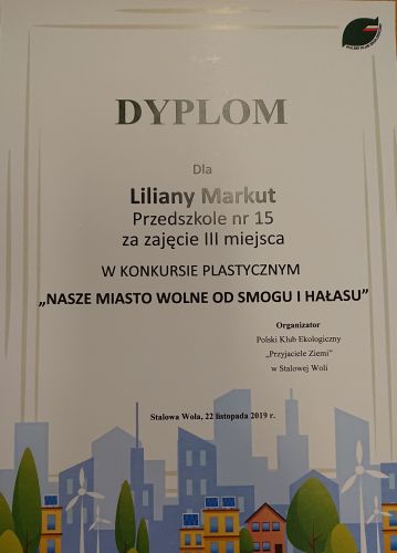 Lilianka i Alicja wzięły udział w międzyprzedszkolnym konkursie plastycznym „Nasze miasto wolne od smogu i hałasu“, którego organizatorem był Polski Klub Ekologiczny „Przyjaciele Ziemi“ w Stalowej Woli. Celem konkursu był była edukacja ekologiczna w zakresie poprawy jakości powietrza- pozytywne przekonania i postawy społeczne oparte na świadomości wpływu zanieczyszczeń na zdrowie i komfort życia oraz popularyzacja wiedzy dotyczącej ochrony powietrza w najbliższym otoczeniu. Lilianka Markut zajęła w konkursie III miejsce z pracą pt. „Czyste powietrze kocham“. Obie uczestniczki z naszego przedszkola zdobyły cenne nagrody w postaci wartościowych książek. Serdecznie gratulujemy i życzymy dalszych sukcesów !!! Nasze przedszkole otrzymało 6 świerków od Polskiego Klubu Ekologicznego „Przyjaciele Ziemi“ za co serdecznie dziękujemy ! Drzewka oczywiście zostały posadzone na terenie przedszkola.