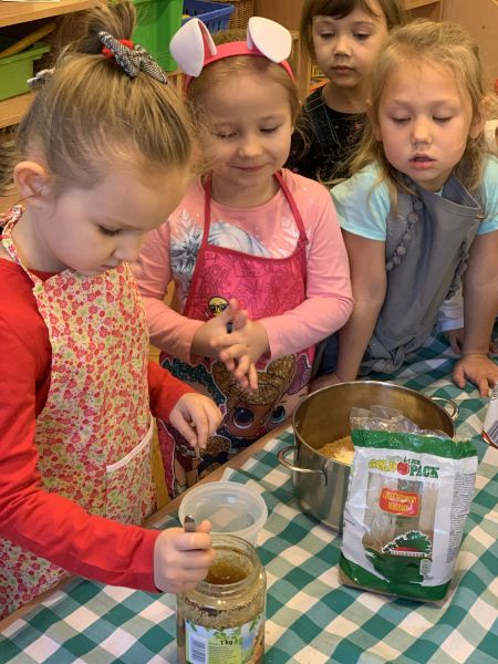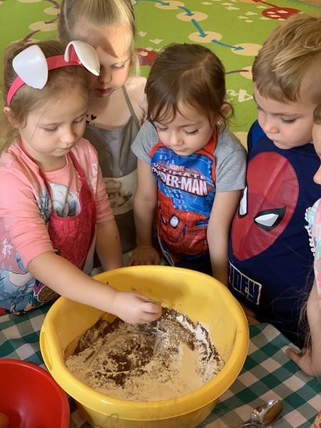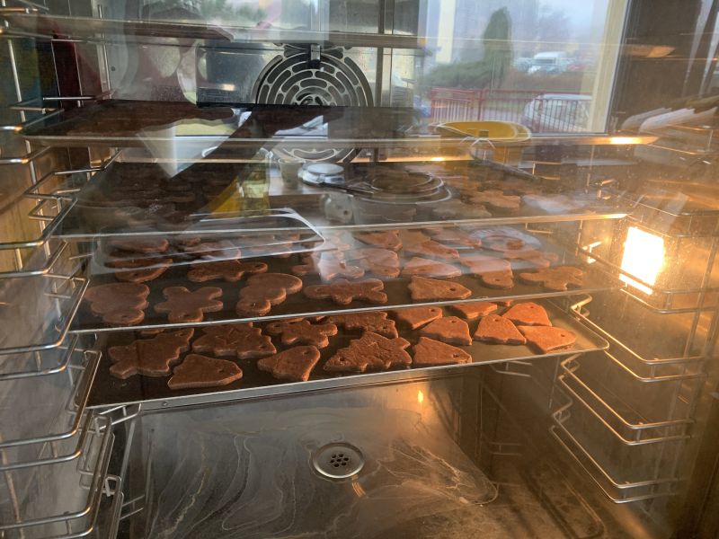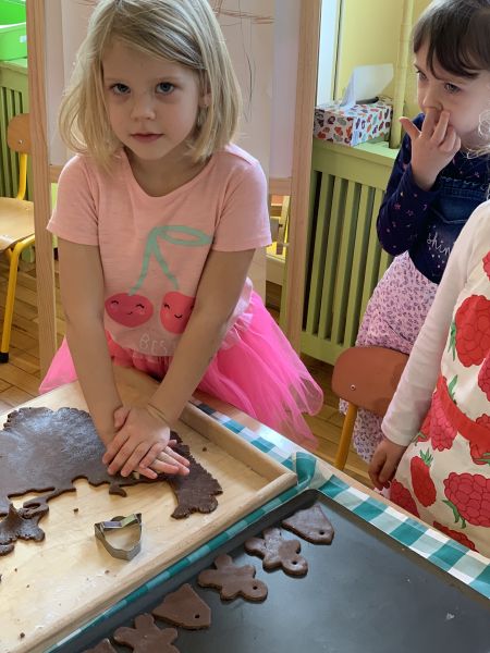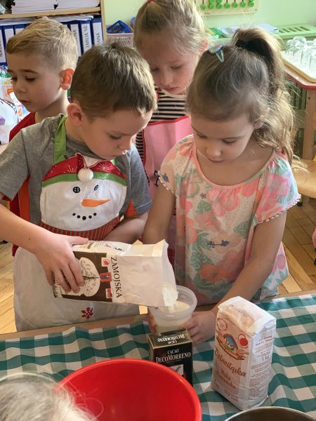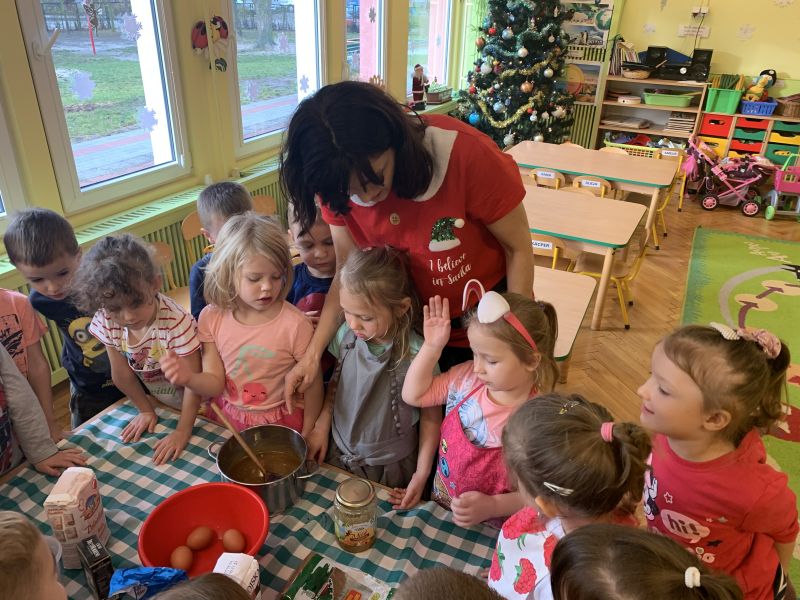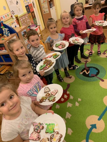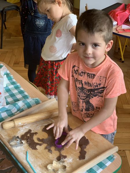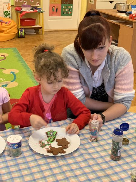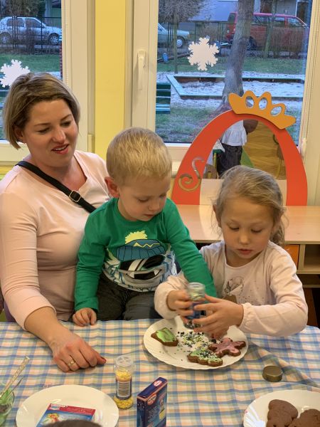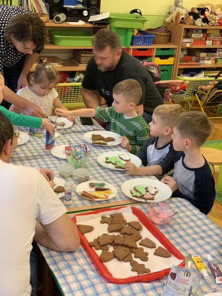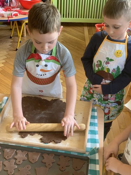W ostatnim tygodniu przedświątecznym w grupie Biedronki, w ramach przygotowań do Świąt Bożego Narodzenia, dzieci poznawały związane z nimi polskie zwyczaje i tradycje. We czwartek w ramach zajęć warsztatowych odbyło się grupowe pieczenie pierniczków ze zdrowych składników. Wykorzystując instrukcje obrazkowe i podział na grupy według planu daltońskiego, dzieci przygotowały samodzielnie ciasto piernikowe, a następnie wycinały wybrane wzory ciastek. W piątek odbyły się zajęcia otwarte dla rodziców. Zaproszeni goście wysłuchali świątecznych piosenek i pastorałek w języku polskim i angielskim oraz wzięli udział we wspólnym dekorowaniu upieczonych pierników. Kolorowe wypieki ozdobią choinki.