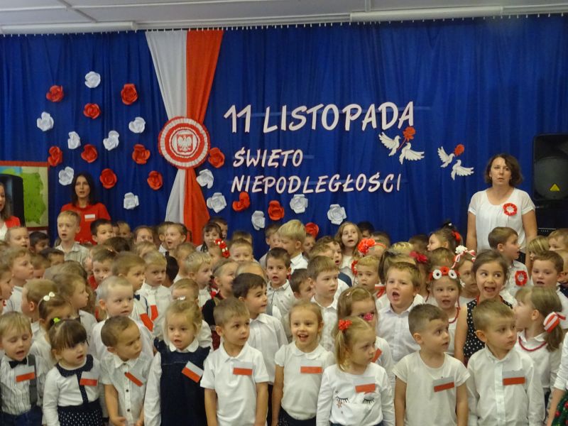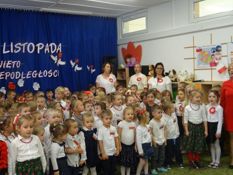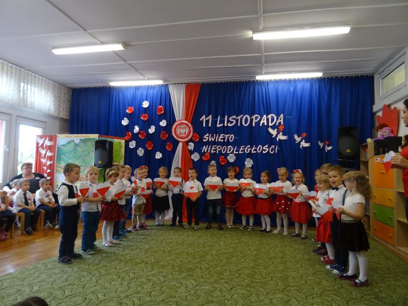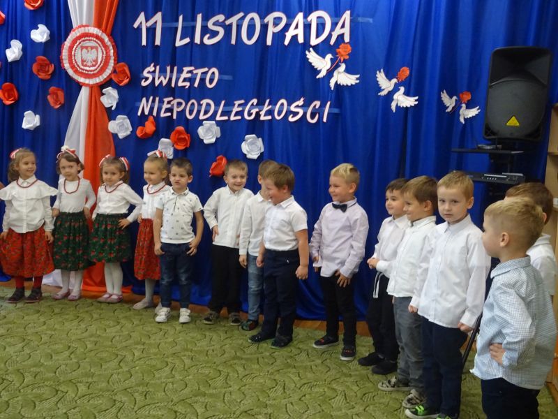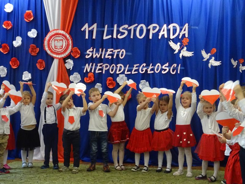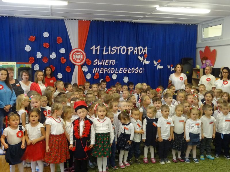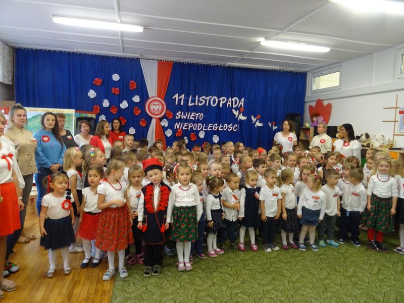 11 listopada 1918 zapisał się na zawsze na kartach historii Polski. W tym właśnie dniu po 123 latach niewoli, Polska odzyskała niepodległość. Dlatego co roku 11 listopada obchodzimy nasze święto narodowe – Święto Niepodległości. Z tej okazji 8 listopada 2019 roku wszystkie przedszkolaki świętowały ten wyjątkowy dla wszystkich Polaków dzień. Część artystyczną przygotowały dzieci z grupy „Tygrysy“. Słowem, piosenką i tańcem oddały szacunek symbolom narodowym oraz miłość do Ojczyzny. Udział przedszkolaków w takich uroczystościach to wspaniała lekcja patriotyzmu oraz kształtowanie pozytywnych postaw. W tym dniu nasze przedszkole włączyło się również do akcji MEN ,,Szkoła do hymnu” Dzieci ze wszystkich grup wraz z Panią Dyrektor, nauczycielkami i pracownikami dokładnie o 11.11 wspólnie odśpiewały pieśń Mazurka Dąbrowskiego przyłączając się tym samym do placówek oświatowych z całej Polski .