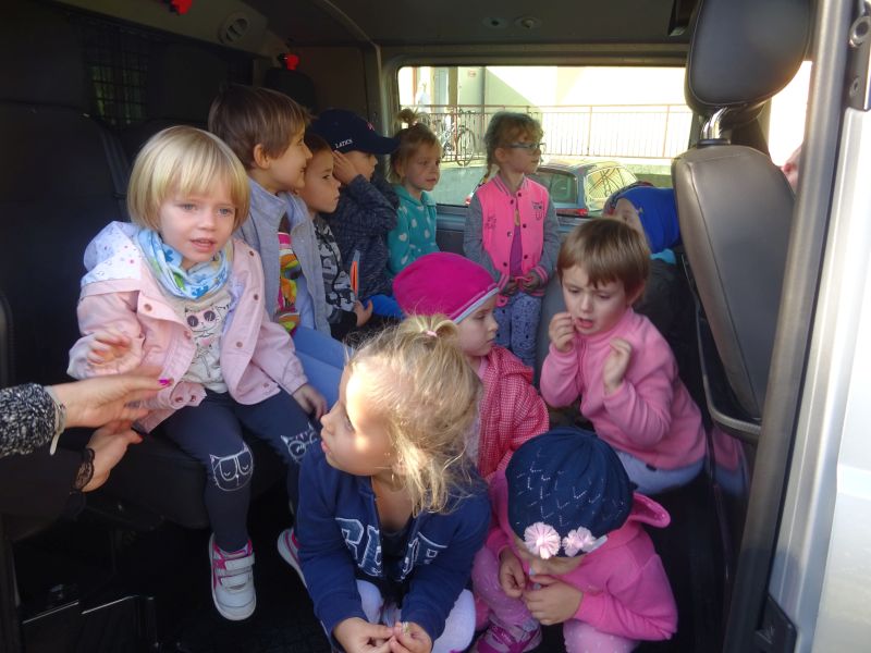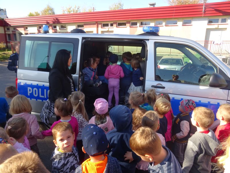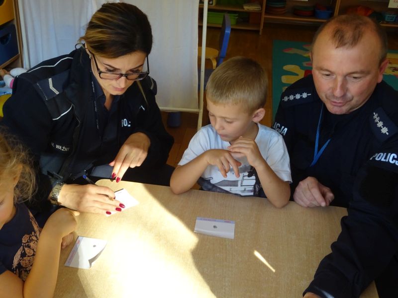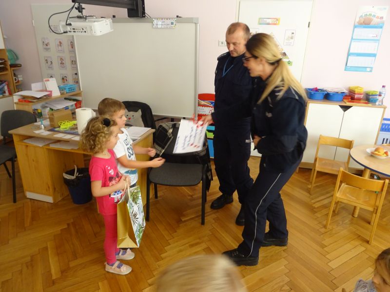 Dzieci bardzo serdecznie powitały gości i z zainteresowaniem słuchały tego, co mówi. Spotkanie przebiegło w bardzo miłej atmosferze. Policjanci przybliżyli dzieciom zasady bezpieczeństwa w domu i w przedszkolu oraz zasady bezpiecznego poruszania się po drodze. Opowiadali także o postępowaniu dzieci w różnych sytuacjach, dając im możliwość oceny - czy zachowywały się dobrze, czy też niewłaściwie. Duże zainteresowanie u dzieci wywołało umundurowanie i wyposażenie policjantów. Po zakończonej pogadance dzieci udały się do swoich sal, gdzie policjanci wykonali im „odciski palców“. Przedszkolaki miały również możliwość oglądnięcia policyjnego radiowozu.