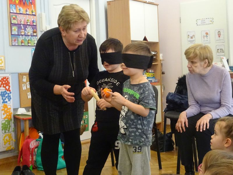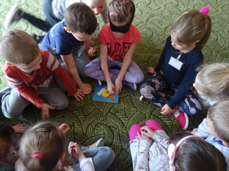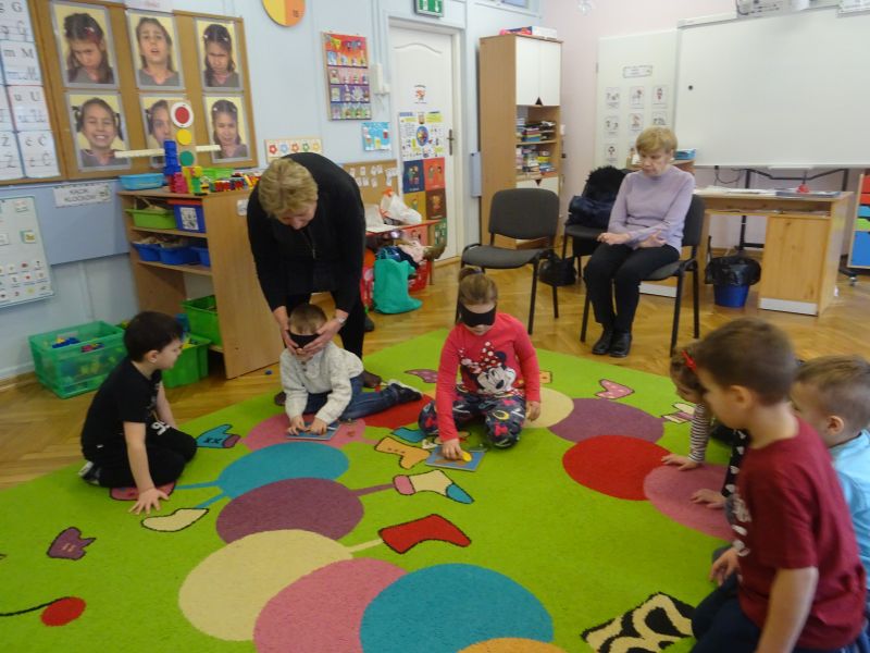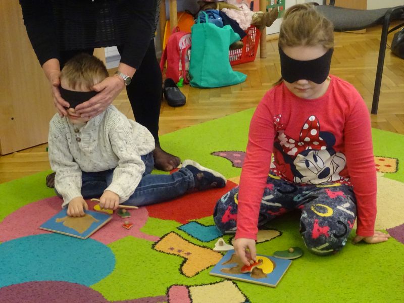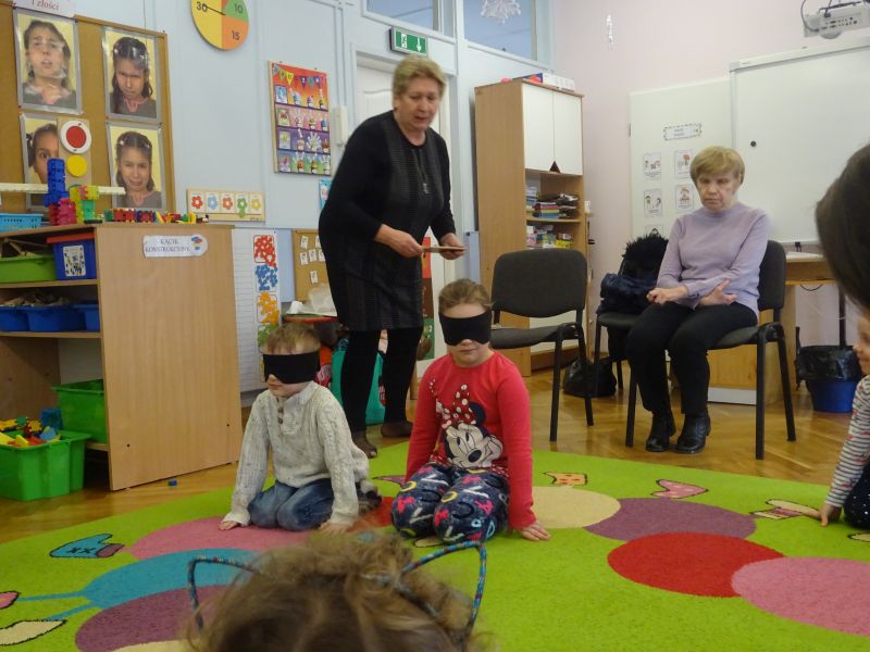 W dniu 19.02.2020 r. dzieci z grup „Plastusie“ oraz „Tygrysy“ wzięły udział w zajęciach terapeutycznych prowadzonych przez Panie z Poradni Psychologiczno-Pedagogicznej w Stalowej Woli. Celem zajęć było dostarczenie doświadczeń związanych z dysfunkcjami zmysłów i narządów, a także rozwijanie umiejętności rozumienia i niesienia pomocy osobom niepełnosprawnym.