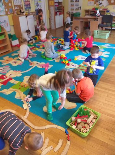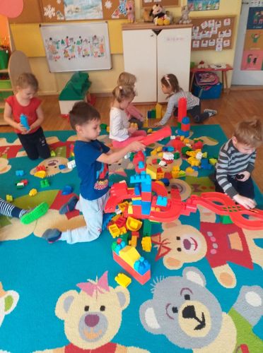 Dzieci na zajęciach popołudniowych 10.01.20120 r. przeżywały swoją przygodę z zabawkami manipulacyjno-konstrukcyjnymi z wykorzystaniem klocków o różnych kształtach, kolorach i wielkościach co sprawiało im dużą przyjemność i frajdę. Przedszkolaki budowały przemyślane budowle; tory, ulice, wieże itp. To doskonały czas na rozwijanie zdolności manualnych, budowania w pionie i w poziomie, rozwijania orientacji w przestrzeni oraz logicznego myślenia.