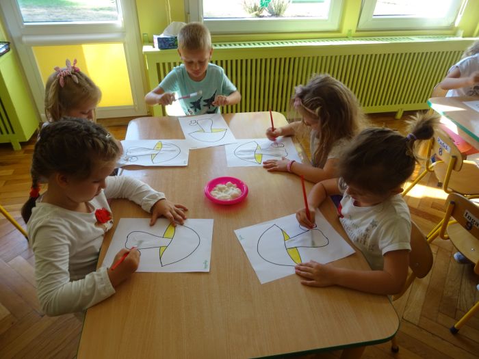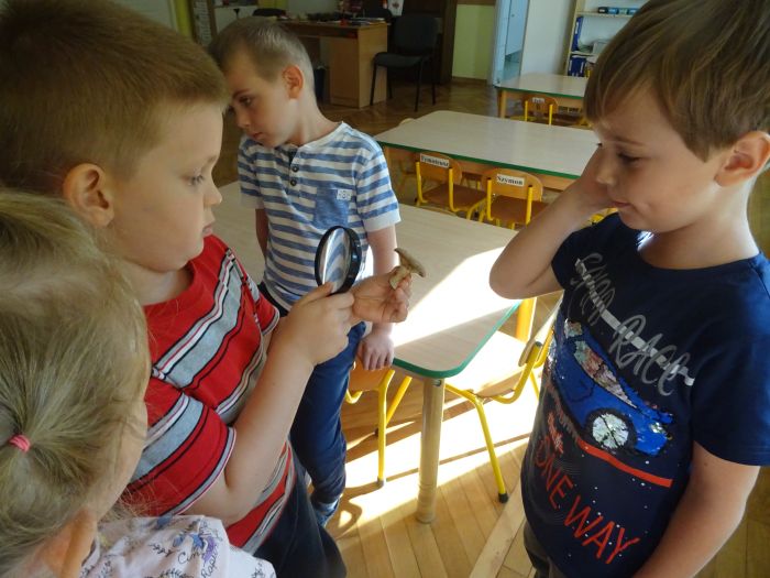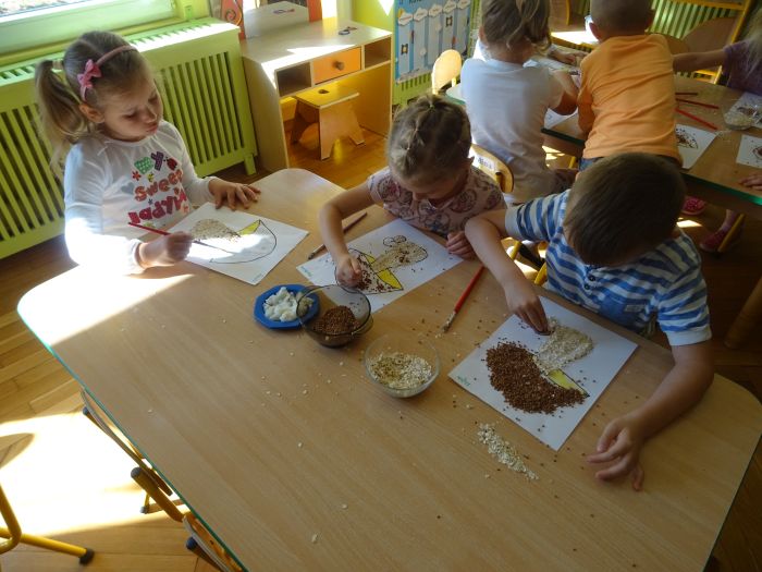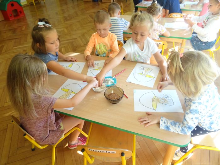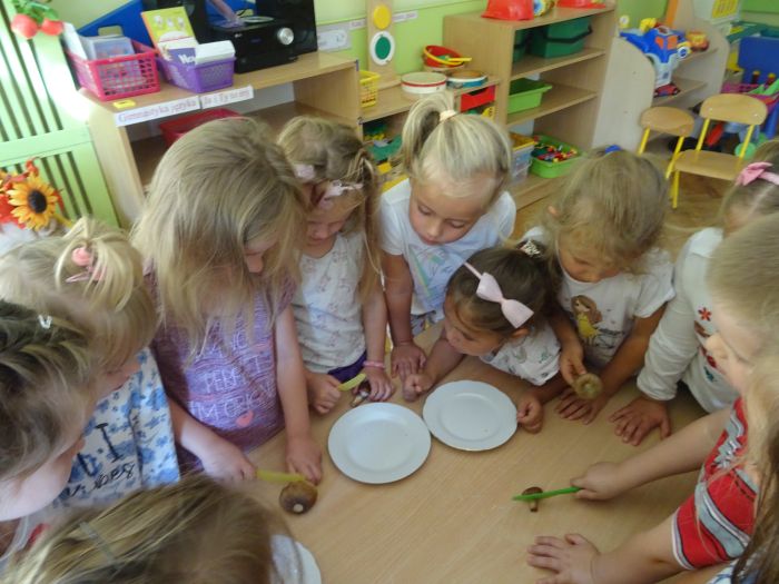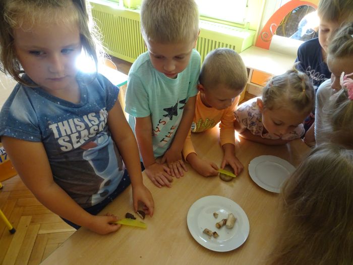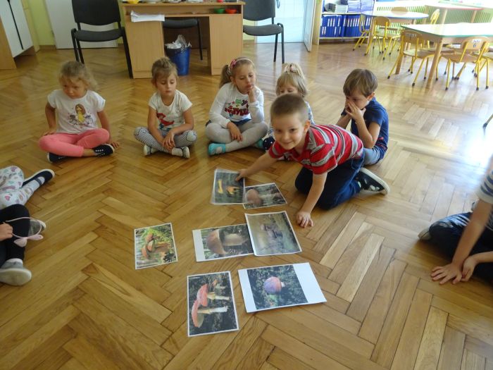 Dzieci z grupy ,,Biedronki" na zajęciach 25.09.2020 r. zapoznały się z wyglądem i środowiskiem życia grzybów na podstawie wiersza M. Buczkówny ,,Grzybobranie" oraz plakatów przedstawiających zdjęcia grzybów jadalnych i trujących. ,,Biedronki" chętnie uczestniczyły w zabawach badawczych w kąciku przyrodniczym, gdzie miały możliwość poznać budowę grzyba (borowika, maślaka i podgrzybka). Dużym zainteresowaniem cieszyło się badanie organoleptyczne zgromadzonych okazów kilku grzybów pobudzając pracę zmysłu węchu i dotyku. Dzieci dotykały, wąchały kroiły grzyby, oglądały grzyby w powiększeniu za pomocą lupy. Z kolorowych obrazków grzybów dzieci układały grzybowe rytmy rozwijając logiczne myślenie oraz spostrzegawczość. Na zakończenie zajęć ,,Biedronki" wykonały prace plastyczną pt.,,Grzyby" z wykorzystaniem materiału naturalnego. Dzieci wypełniały kontur grzyba przyklejając kaszę gryczaną, płatki owsiane oraz niewielką ilość mchu rozwijając umiejętność odwzorowywania wybranych naturalnych okazów w formie plastycznej oraz umiejętności manualne. Gotowe prace zostały wyeksponowane na tablicy korkowej w naszej szatni.