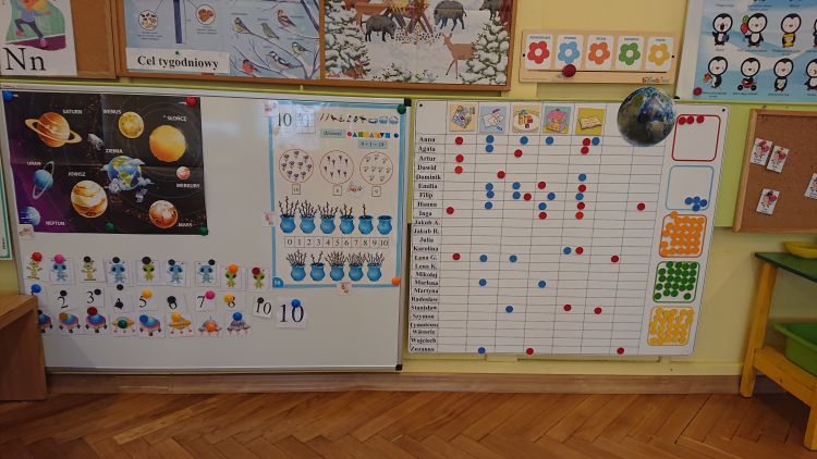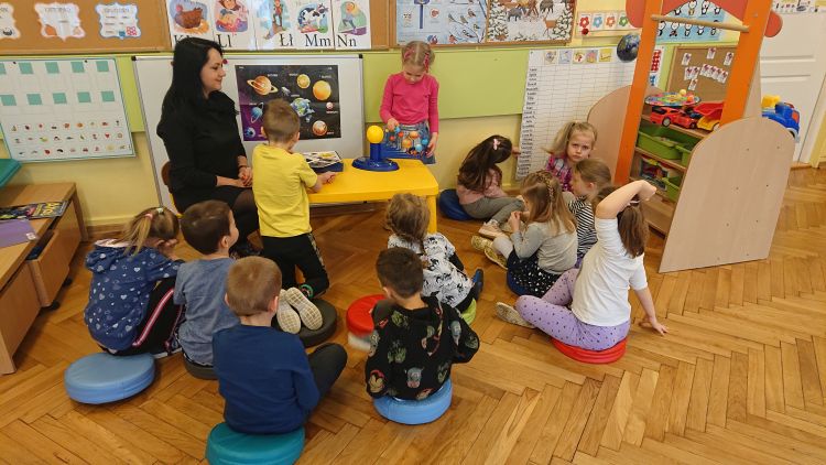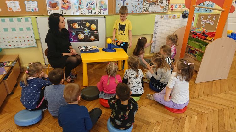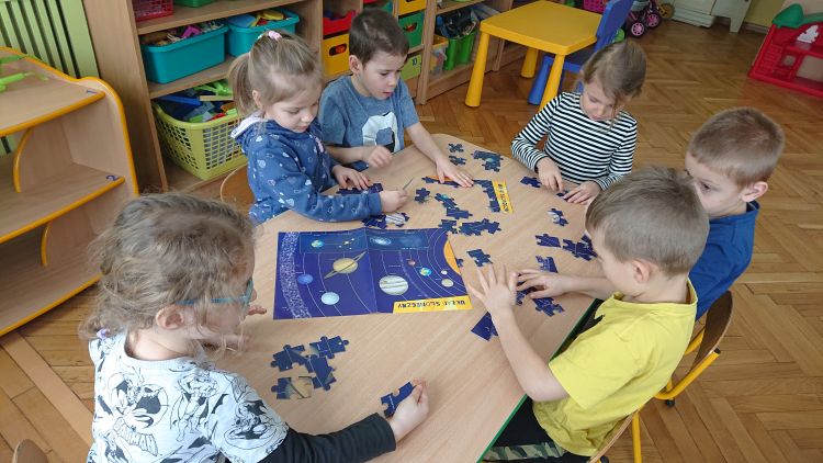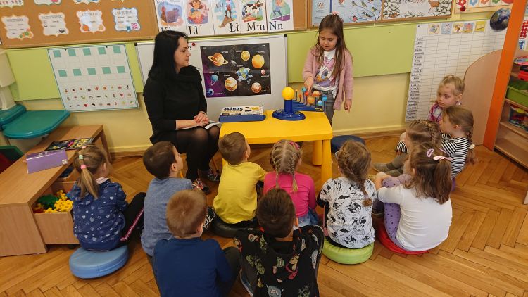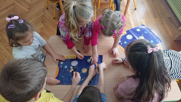 Astronomia jest jedną z najbardziej fascynujących i tajemniczych nauk, jakie istnieją ! A sam kosmos jest czymś tajemniczym i wzbudza w dzieciach niezwykłą ciekawość poznawczą. W ubiegłym tygodniu dzieci z grupy „Biedronki“ odkrywały tajemnice Układu Słonecznego i poznawały ruchy ciał niebieskich. Nauce i zabawie sprzyjał ruchomy i świecący model układu słonecznego. „Biedronki“ miały możliwość obserwowania ruchu obiegowego wszystkich planet wokół Słońca. Poznały wszystkie planety układu słonecznego, wysłuchały informacji i ciekawostek dotyczących planet i satelit układu słonecznego. Dzieci poznawały wszechświat a zajęcia zorganizowane były z wykorzystaniem daltońskiej tablicy zadań: każde dziecko samodzielnie decydowało kiedy i jakie zadanie z tablicy wykona (do wyboru było zadanie z modelem ziemi, układanie puzzli „Układ Słoneczny“ lub gra planszowa „Wyprawa na marsa“). Wszystkie przedszkolaki pracowały w grupach i natychmiast przystąpiły do wykonania zadań, których ukończenie oznaczały za pomocą magnesu w odpowiednim kolorze. Daltońska tablica jest narzędziem organizującym pracę i zabawę w ciągu dnia. Korzystając z niej dzieci uczą się samodzielności, odpowiedzialności i refleksji. Sam plan daltońskim jest wspaniałym narzędziem rozwijającym umiejętność współpracy.
