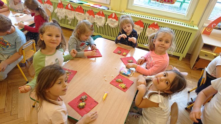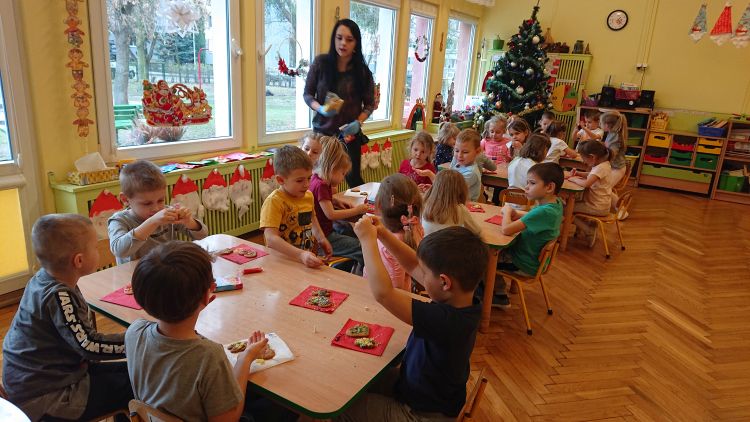 Dekorowanie świątecznych pierniczków to kolejne zajęcia mające na celu poznawanie polskich tradycji oraz radosne oczekiwanie na święta Bożego Narodzenia. Zajęcia odbyły się w dniu 17.12.2020 r. Dzieci dekorowały pierniczki według własnego pomysłu: lukrowały polewą czekoladową, ozdabiały lukrowymi pisakami, kolorową posypką lub kokosową. Niektóre dzieci dedykowały swoje pierniczki mamusiom i chętnie podpisywały np. Dla mamy, mama. Wszystkie dzieci upiększały je z wielkim zapałem i zapewne ozdobiły nimi swoje domowe choinki. Zajęcia spotkały się z wielką radością ze strony dzieci. Było pysznie - nie obyło się bez próbowania słodkości.