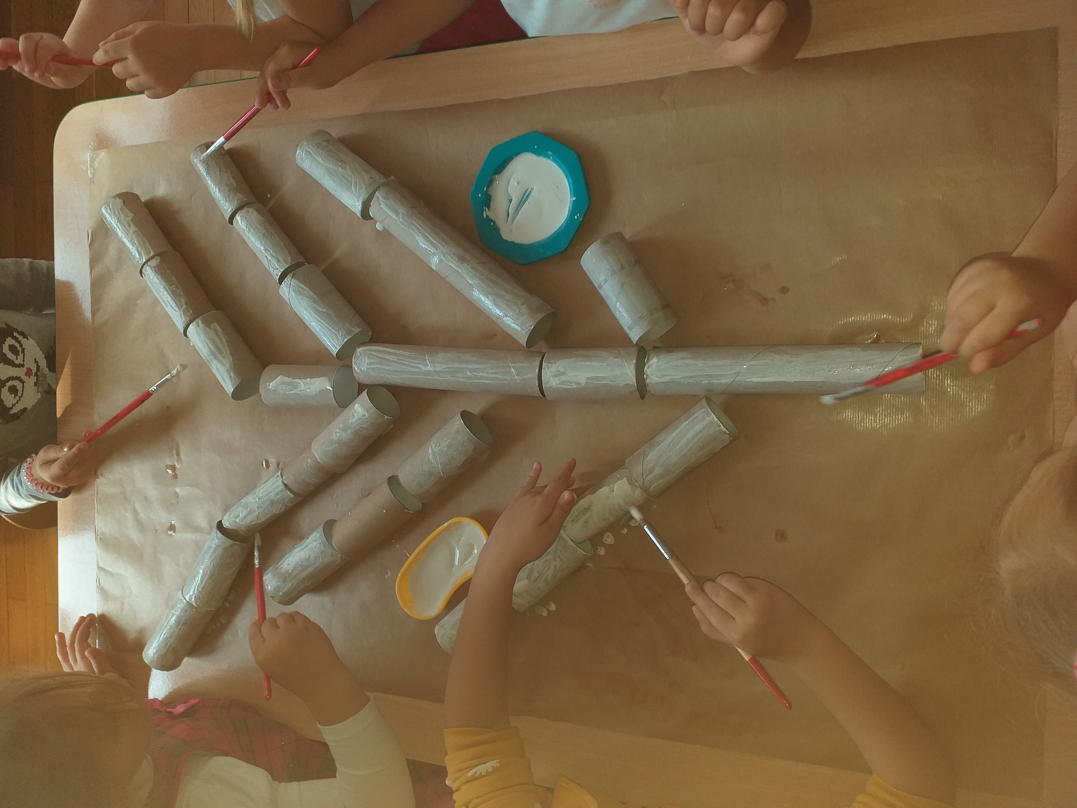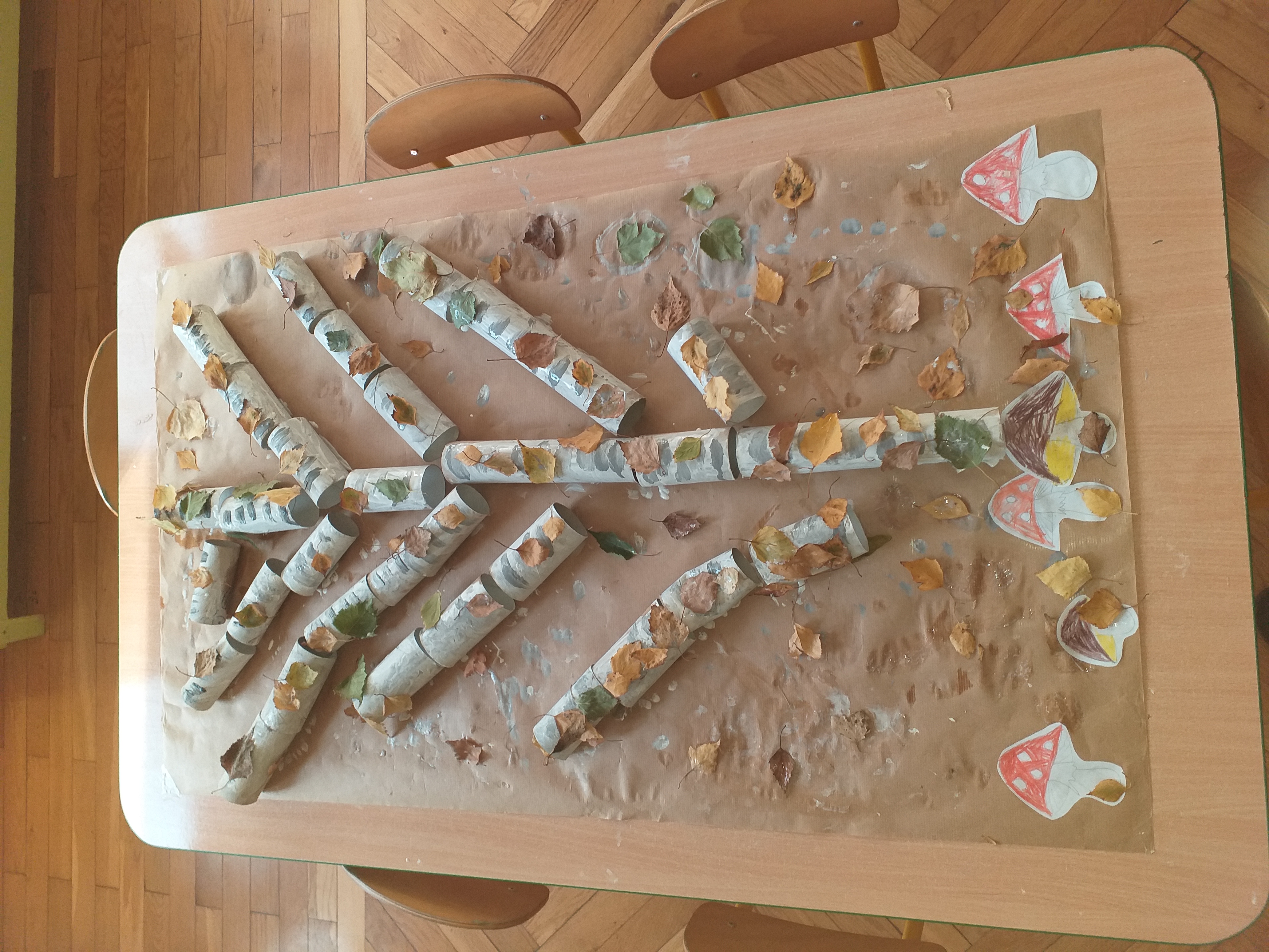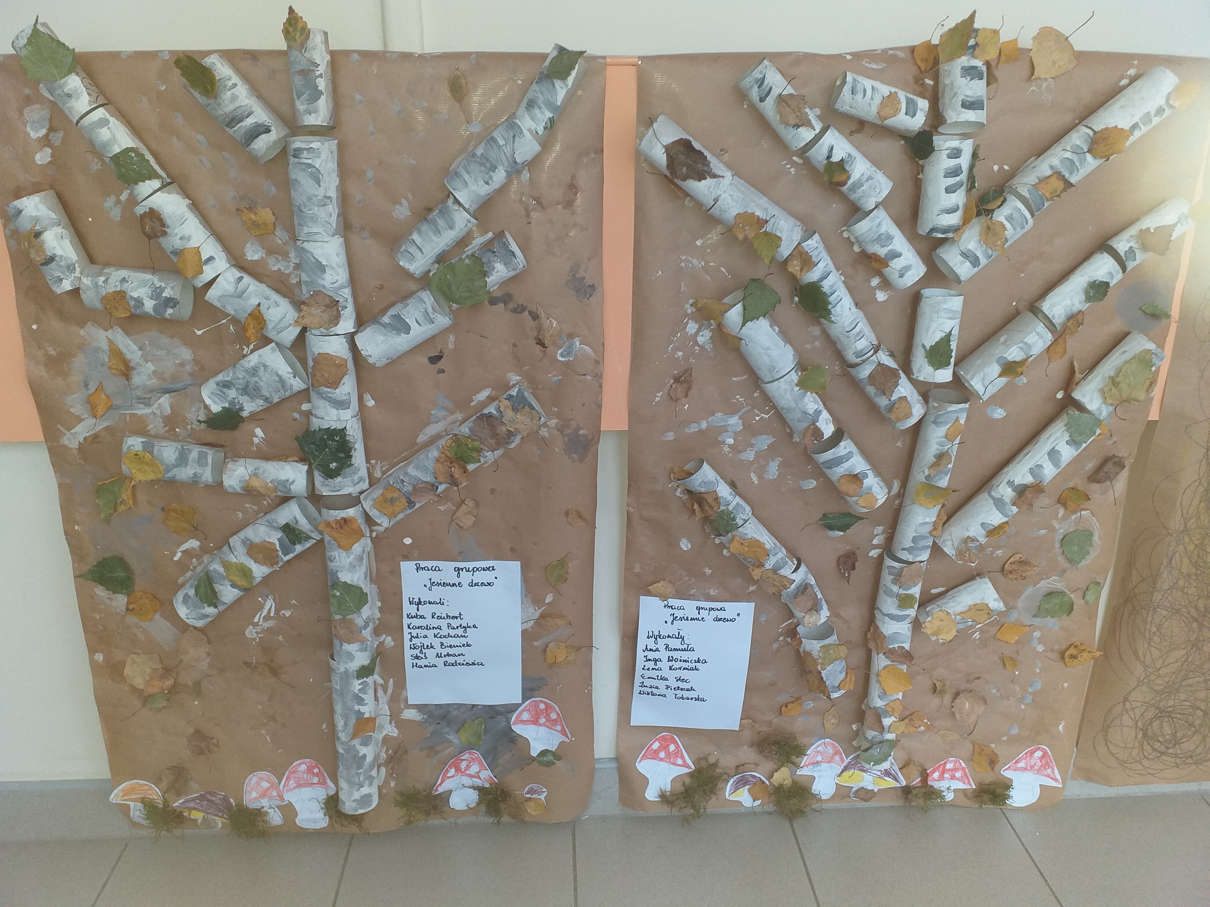 W związku ze zbliżającym się ,,Światowym Dniem Drzewa" grupa ,,Biedronki" na zajęciach plastycznych 09.10.2020 r. wykonała pracę ,,Jesienne drzewa" wykorzystując zgromadzony wcześniej materiał naturalny. Dzieci rozwijając swoją wyobraźnię na arkuszach brązowego papieru przyklejały rolki po papierze toaletowym i ręczniku papierowym tworząc pień i gałęzie drzewa. Następnie białą i czarną farbą pokrywały swoje drzewa tworząc brzozę. Kolejnym etapem było przyklejanie zasuszonych liści brzozy uzbieranych przez przedszkolaki w naszym ogrodzie oraz pokolorowanie i powycinanie muchomorów i prawdziwków wykonanych w czasie zajęć porannych. ,,Biedronki" uzupełniły swoją pracę mchem, który również został znaleziony w ogrodzie przedszkolnym. Dzieci wykonały pracę plastyczną w dwóch zespołach kształtując umiejętność pracy w grupach, a także wzmacniając integrację grupy. Praca ,,Jesienne drzewo" sprawiała dzieciom dużo radości, swobody działania, mogły rozwijać swoją kreatywność, pomysłowość, wyobraźnię twórczą utrwalając przy tym oznaki nowej pory roku.