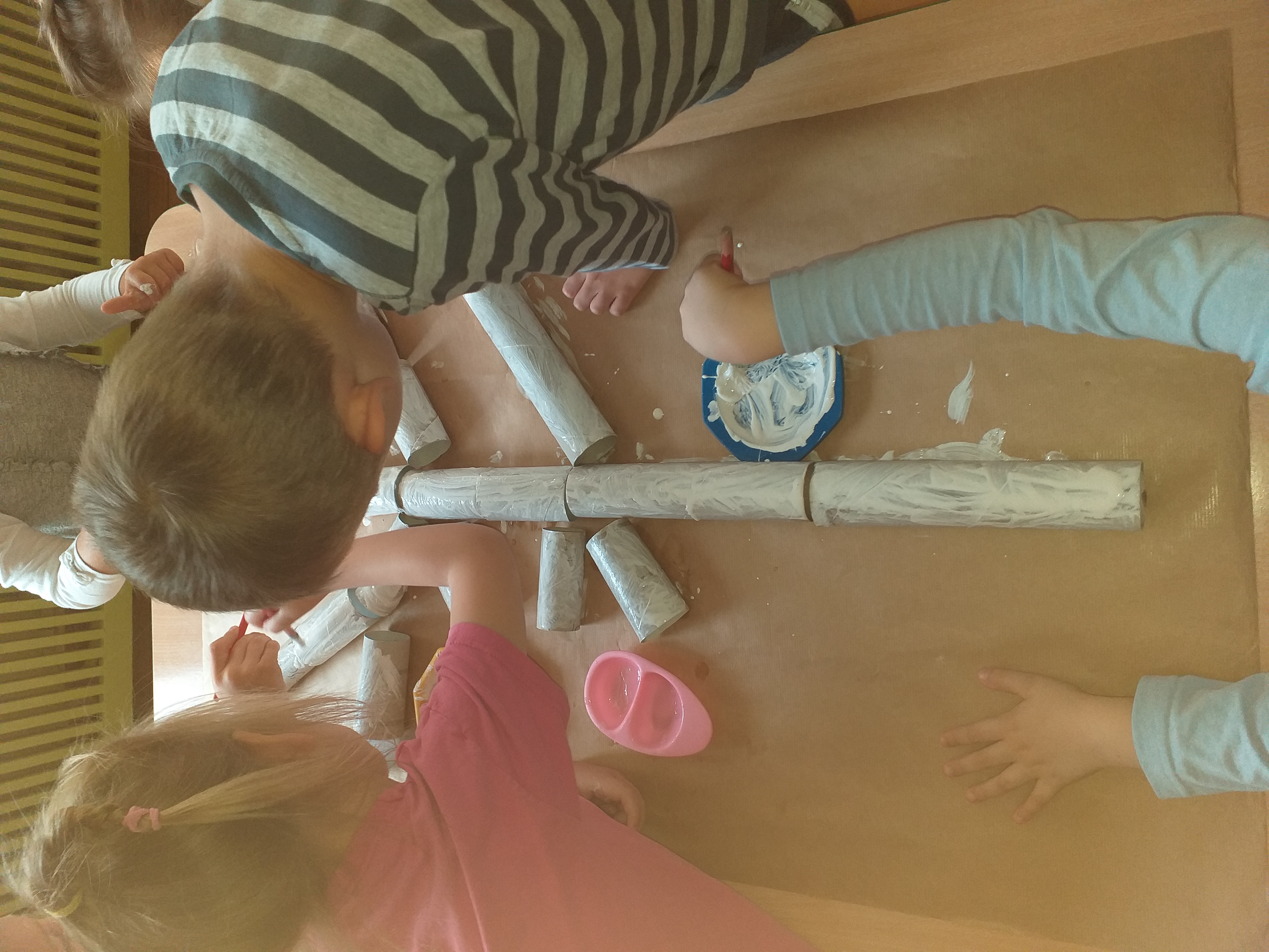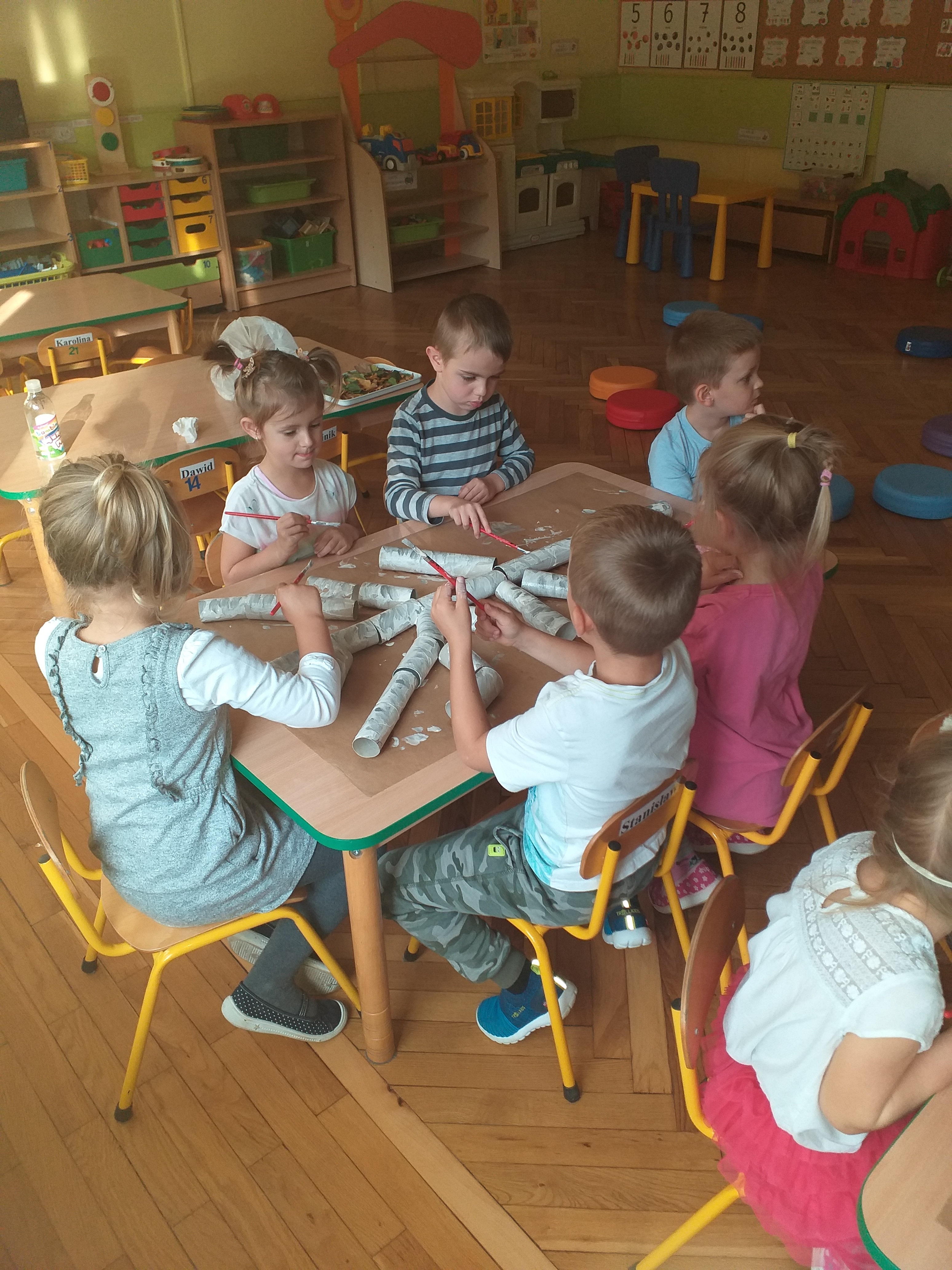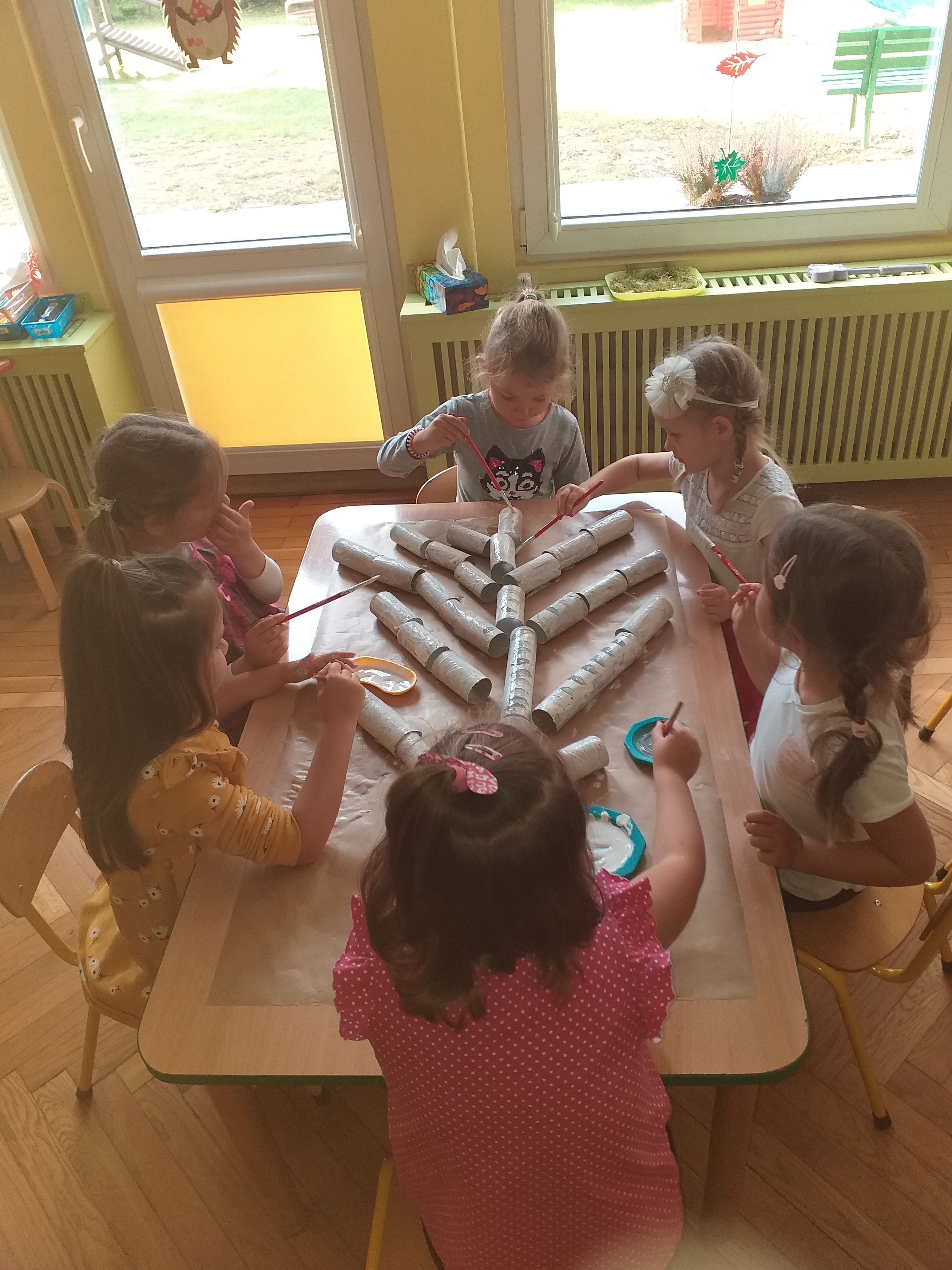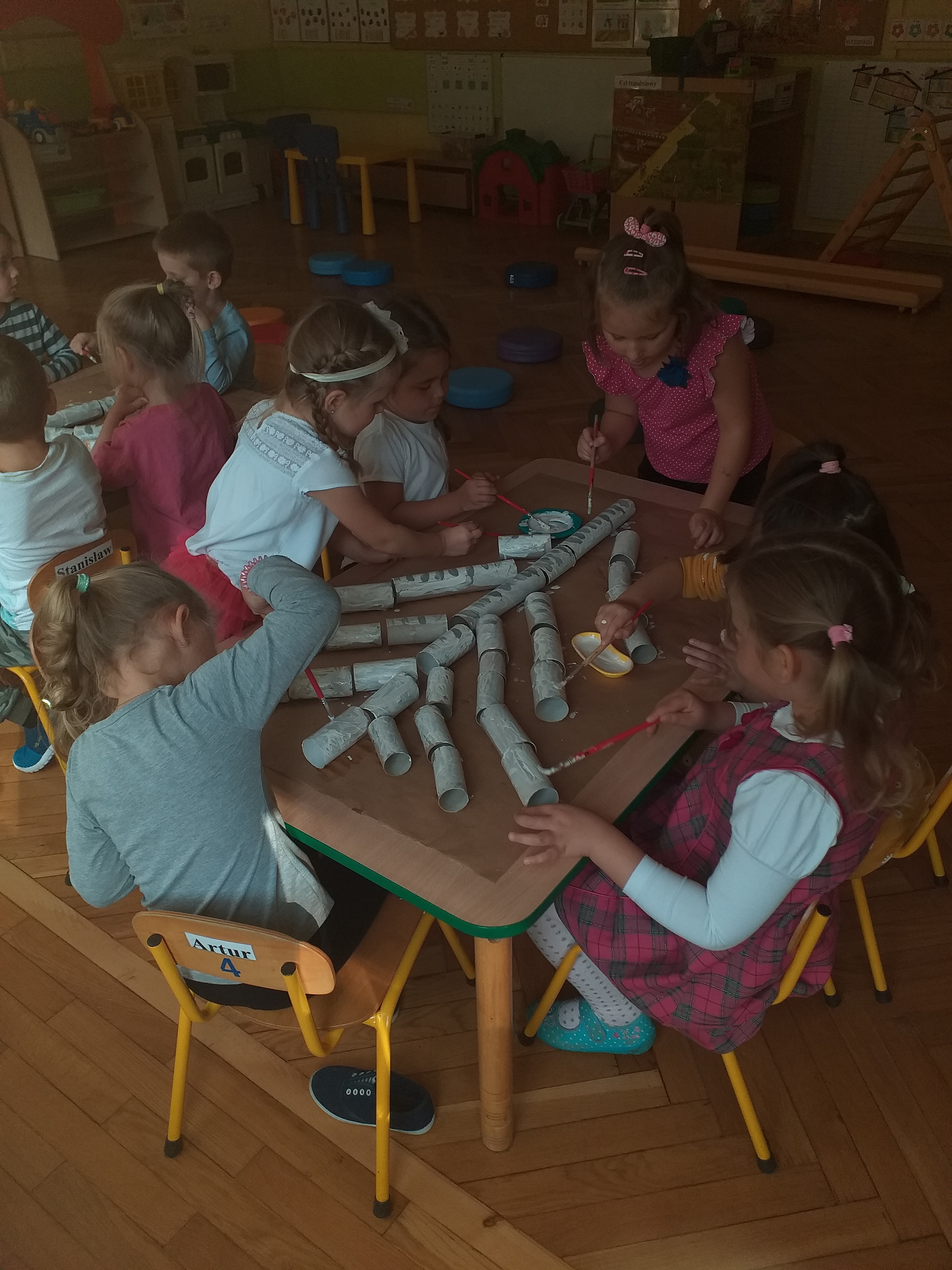 W związku ze zbliżającym się ,,Światowym Dniem Drzewa" grupa ,,Biedronki" na zajęciach plastycznych 09.10.2020 r. wykonała pracę ,,Jesienne drzewa" wykorzystując zgromadzony wcześniej materiał naturalny. Dzieci rozwijając swoją wyobraźnię na arkuszach brązowego papieru przyklejały rolki po papierze toaletowym i ręczniku papierowym tworząc pień i gałęzie drzewa. Następnie białą i czarną farbą pokrywały swoje drzewa tworząc brzozę. Kolejnym etapem było przyklejanie zasuszonych liści brzozy uzbieranych przez przedszkolaki w naszym ogrodzie oraz pokolorowanie i powycinanie muchomorów i prawdziwków wykonanych w czasie zajęć porannych. ,,Biedronki" uzupełniły swoją pracę mchem, który również został znaleziony w ogrodzie przedszkolnym. Dzieci wykonały pracę plastyczną w dwóch zespołach kształtując umiejętność pracy w grupach, a także wzmacniając integrację grupy. Praca ,,Jesienne drzewo" sprawiała dzieciom dużo radości, swobody działania, mogły rozwijać swoją kreatywność, pomysłowość, wyobraźnię twórczą utrwalając przy tym oznaki nowej pory roku.