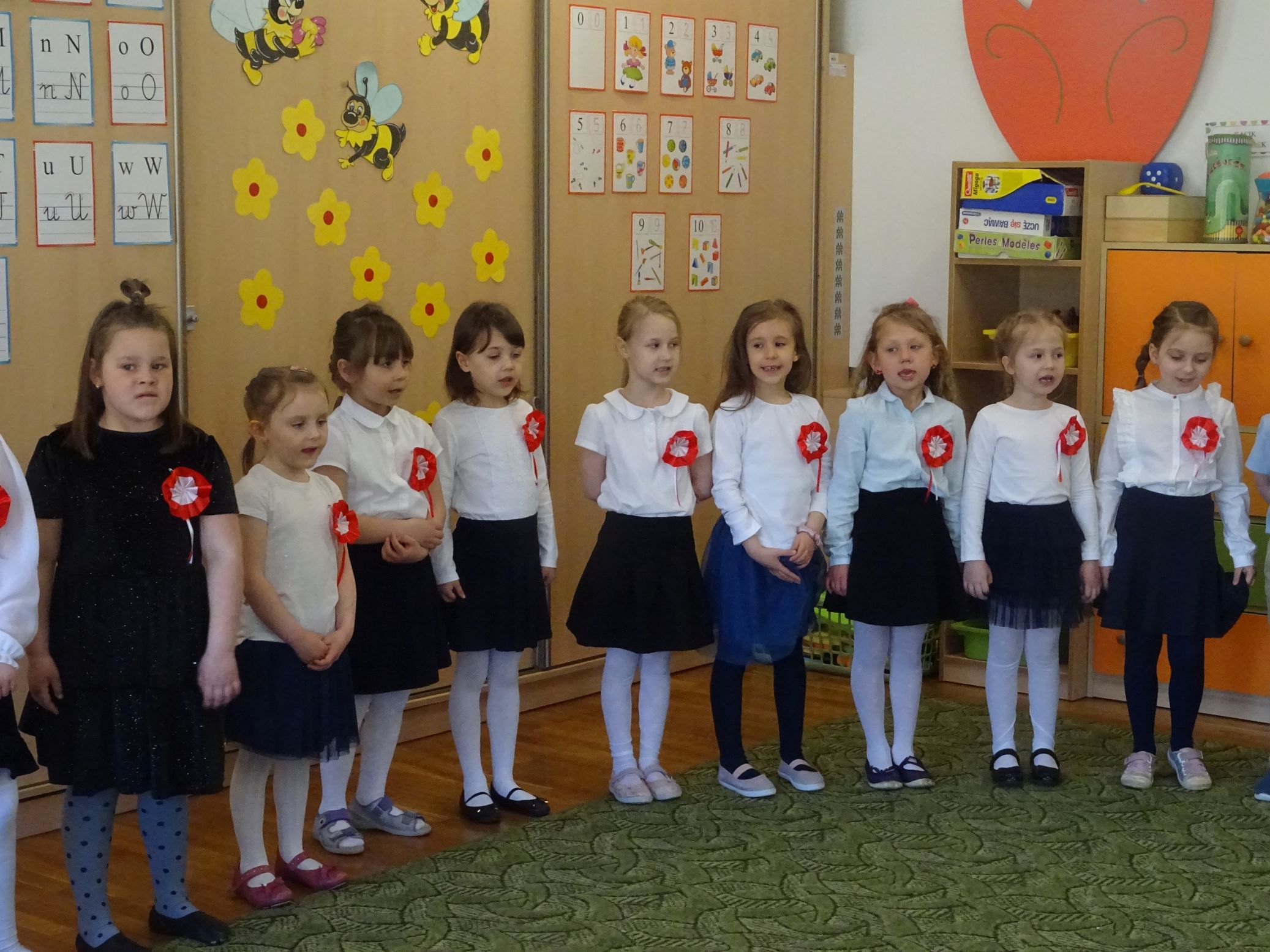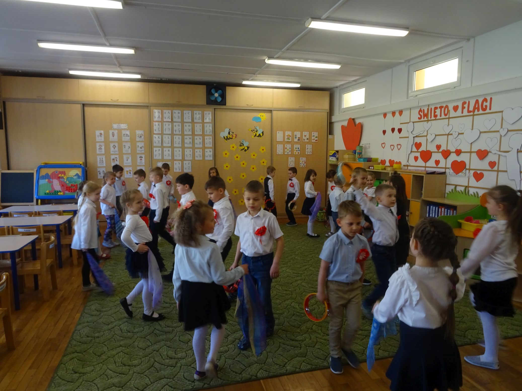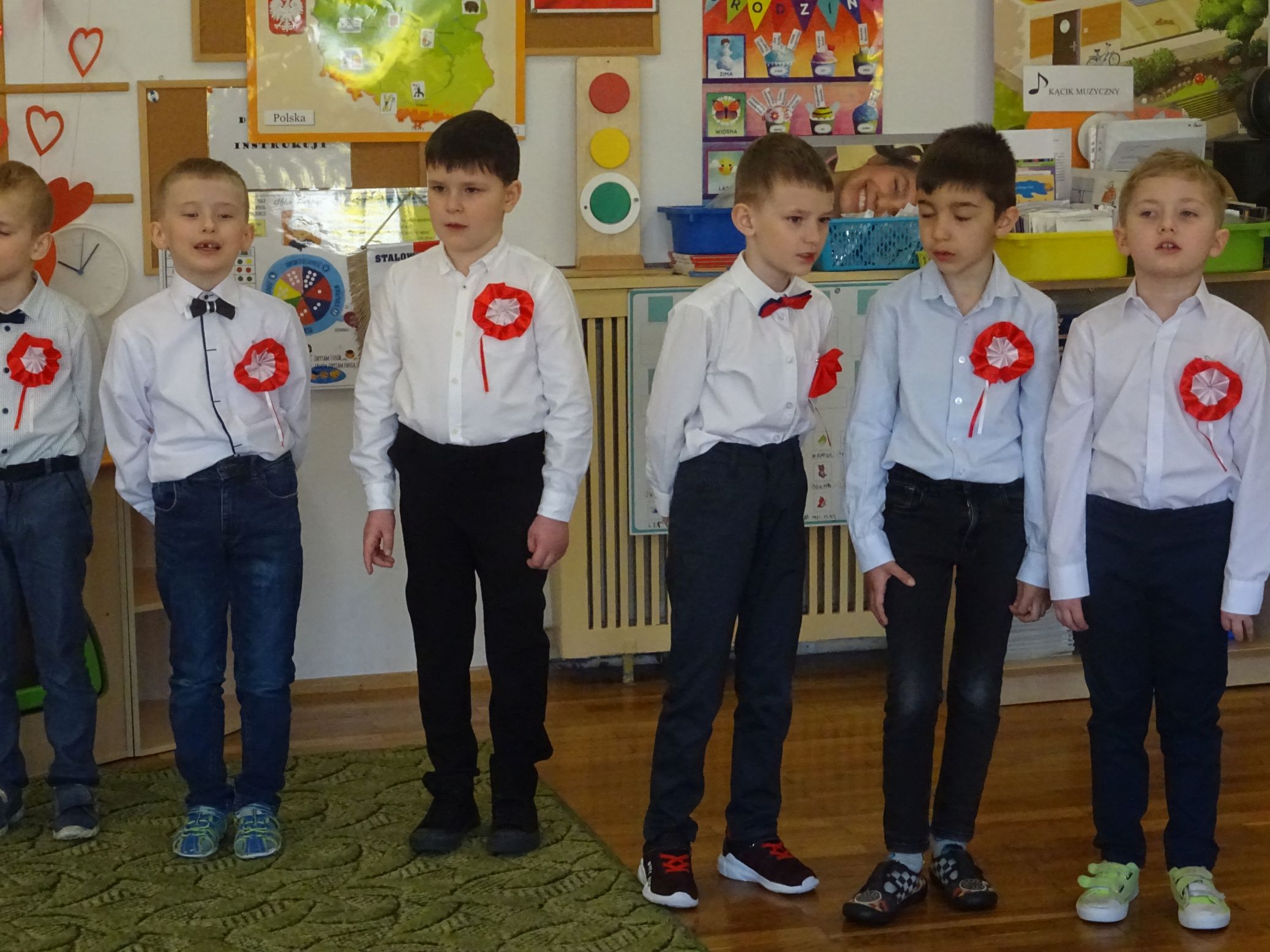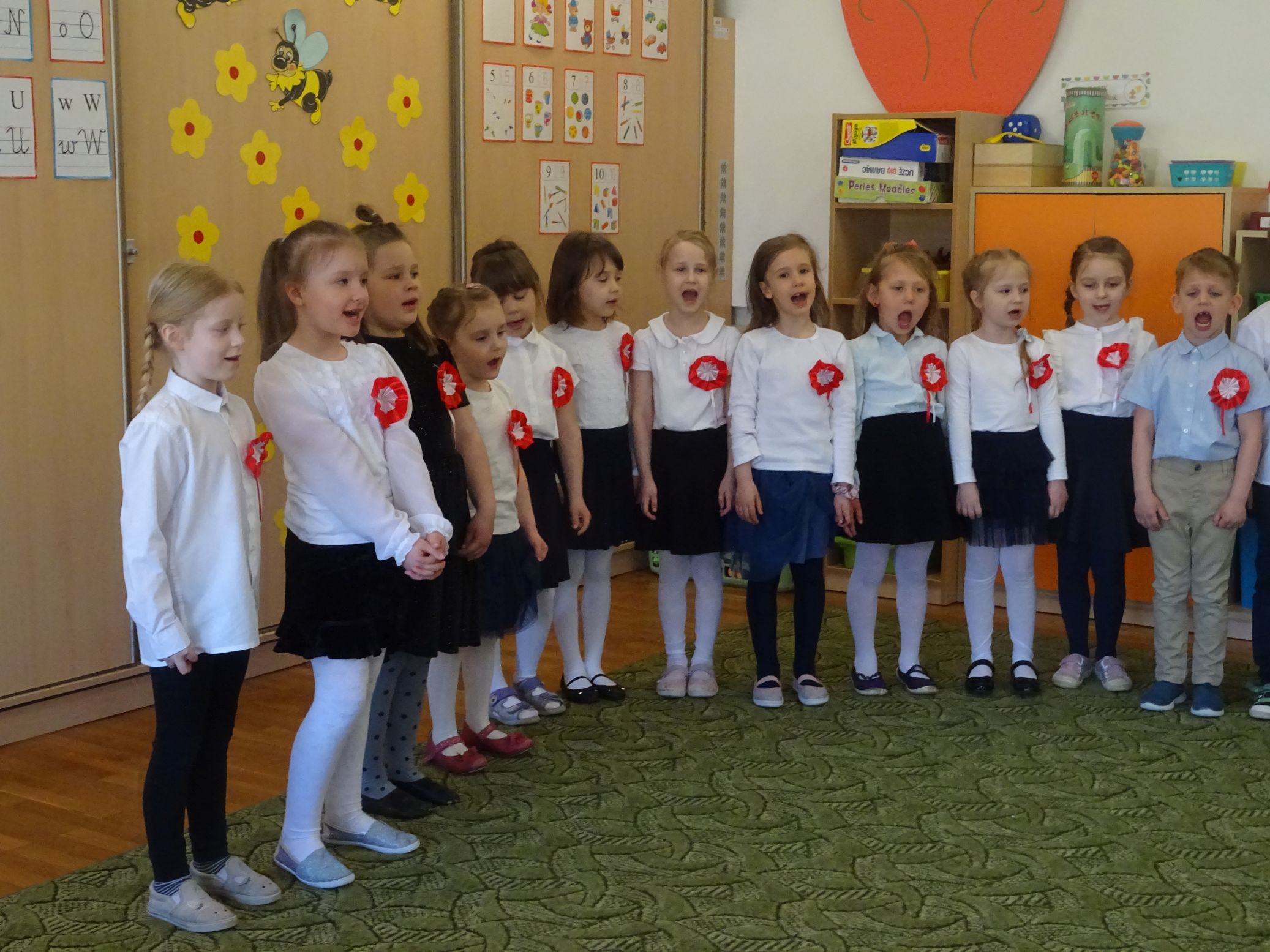 30.04.2020 r. w naszym przedszkolu uroczyście świętowaliśmy obchody Dnia Flagi Rzeczypospolitej Polskiej. Celem uroczystości było rozbudzanie w przedszkolakach zainteresowania Ojczyzną i kształtowanie poczucia dumy z przynależności narodowej. Przedszkolaki z grupy „Zajączki“ ubrane w odświętne stroje wspólnie zaśpiewały hymn narodowy. Następnie zatańczyły poloneza i odśpiewały piosenkę o symbolach narodowych.