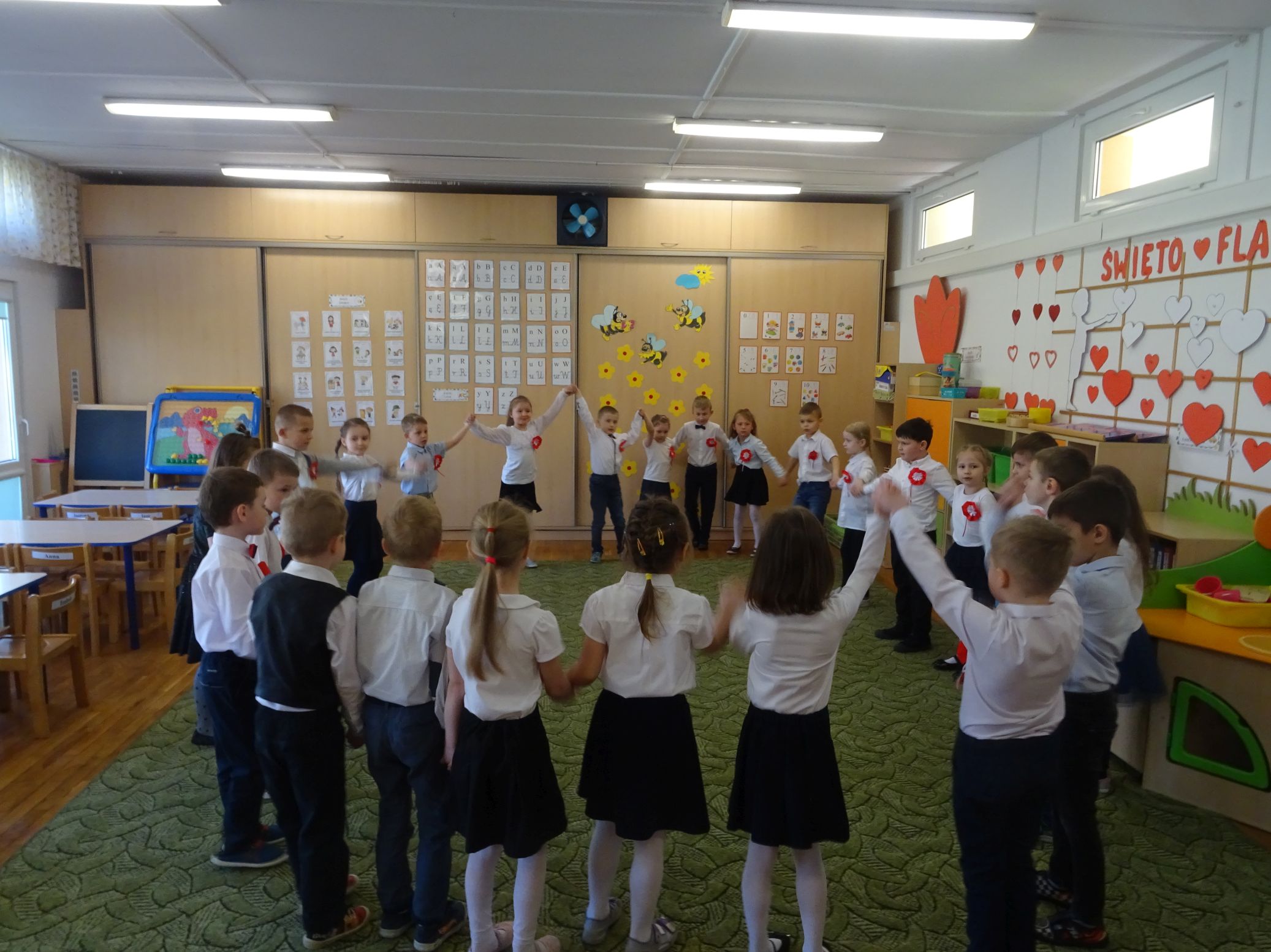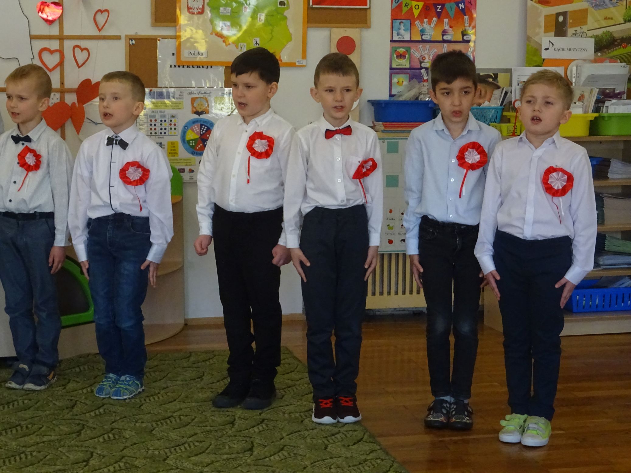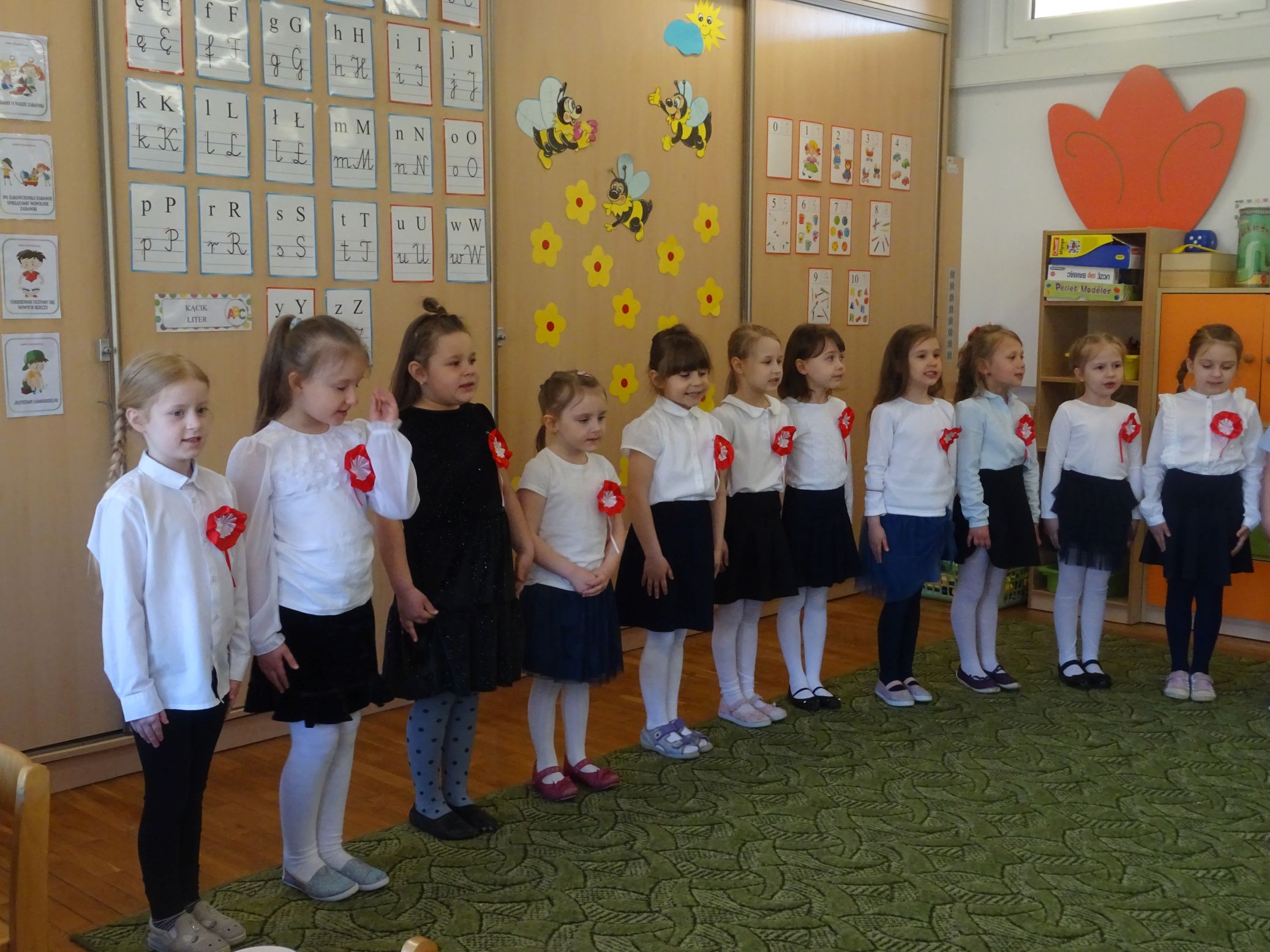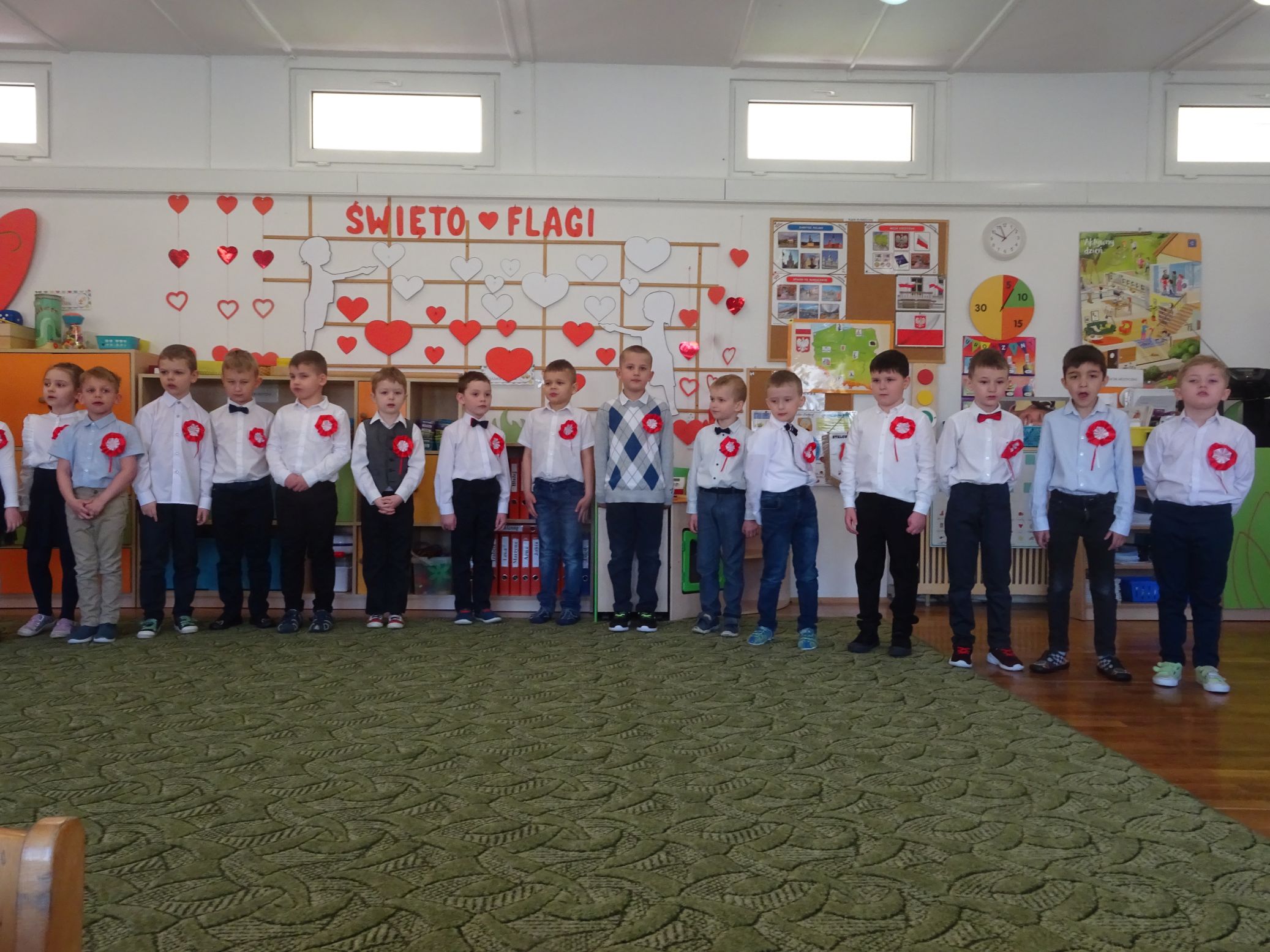 30.04.2020 r. w naszym przedszkolu uroczyście świętowaliśmy obchody Dnia Flagi Rzeczypospolitej Polskiej. Celem uroczystości było rozbudzanie w przedszkolakach zainteresowania Ojczyzną i kształtowanie poczucia dumy z przynależności narodowej. Przedszkolaki z grupy „Zajączki“ ubrane w odświętne stroje wspólnie zaśpiewały hymn narodowy. Następnie zatańczyły poloneza i odśpiewały piosenkę o symbolach narodowych.