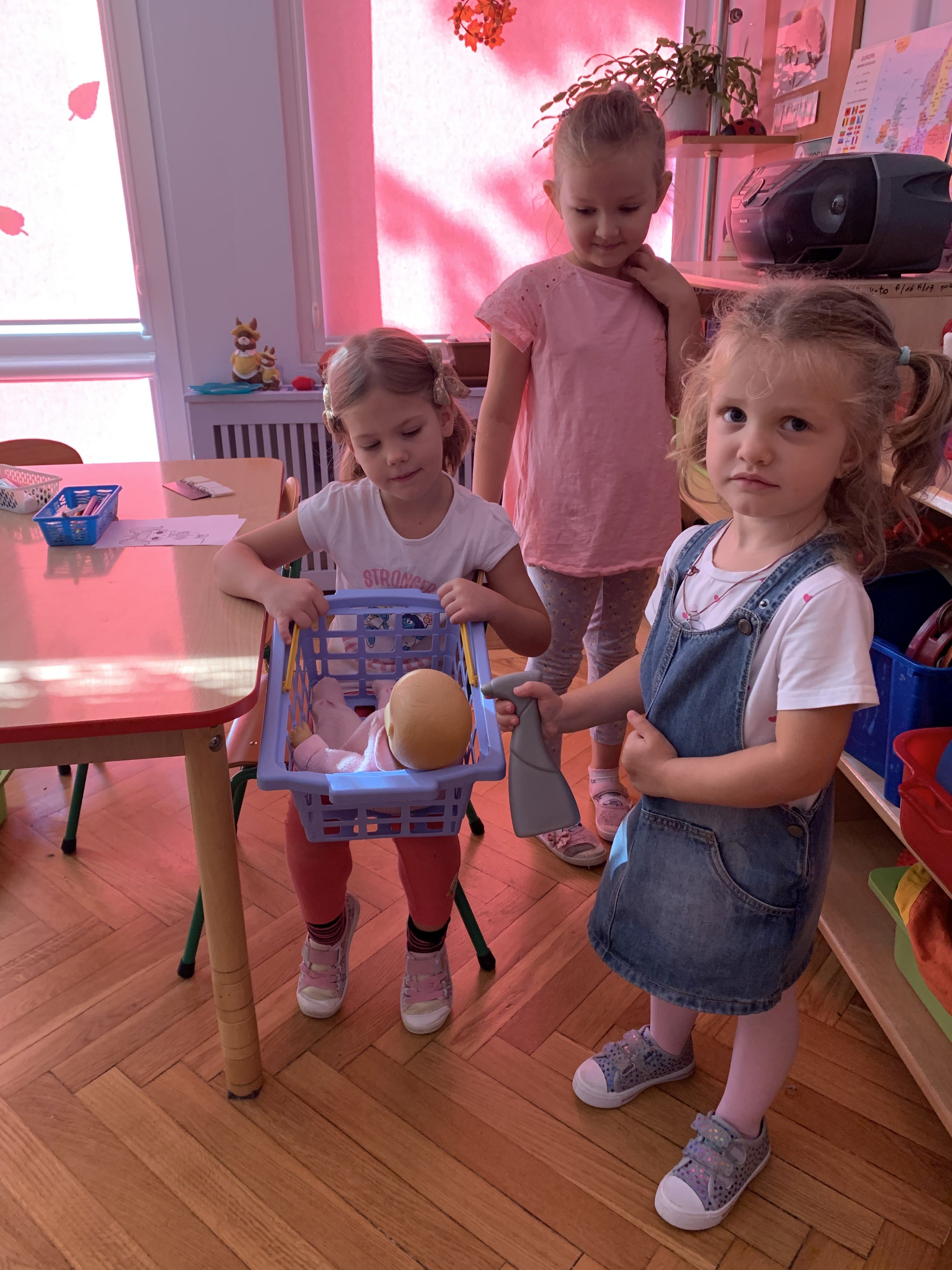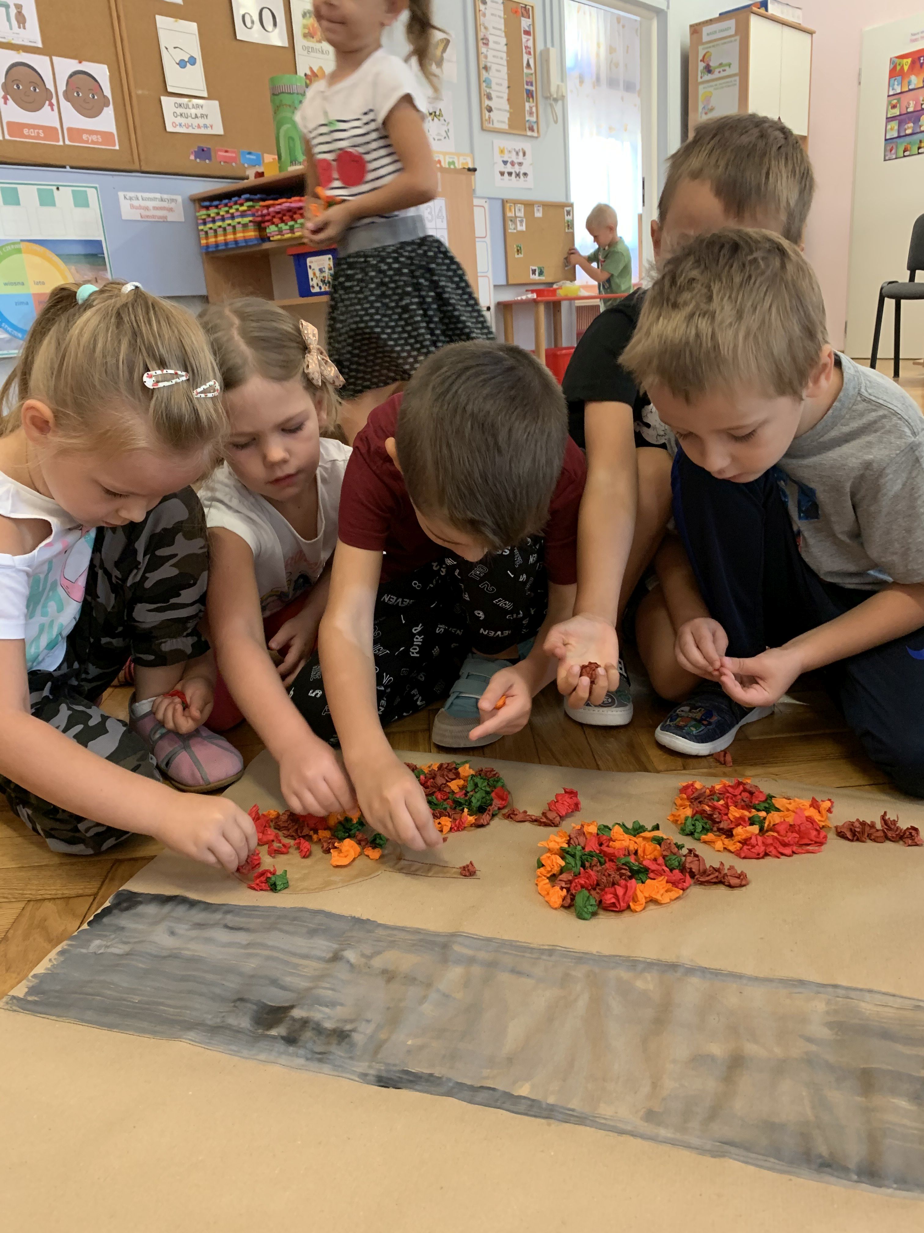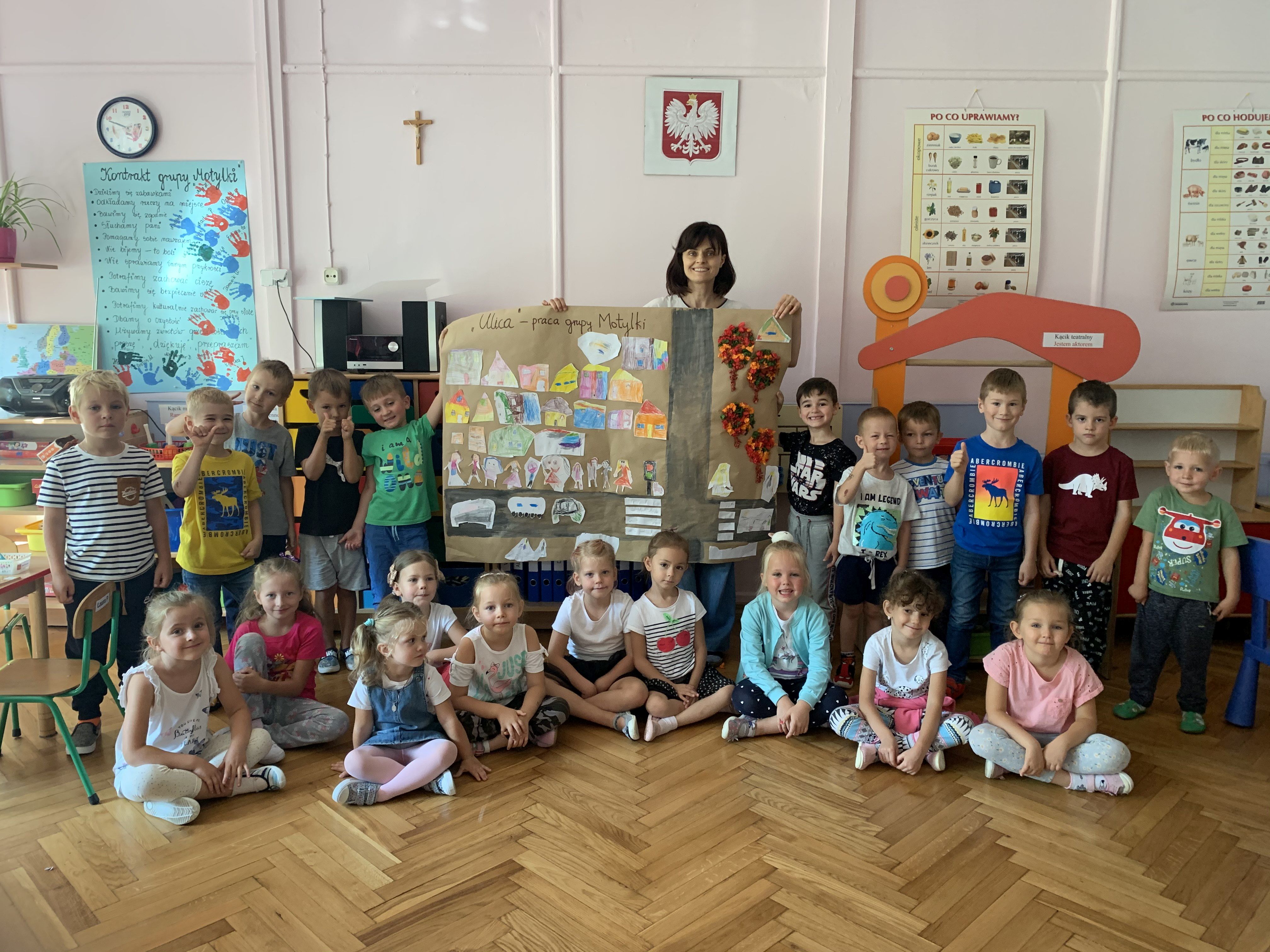 Dzieci z grupy Motylki w ramach poznawania i utrwalania wiadomości na temat bezpiecznego poruszania się pieszych oraz ruchu ulicznego, przygotowały wspólną pracę wykonaną metodą projektu (technika mieszana). W wolnym czasie bawią się w kącikach tematycznych i na placu zabaw.