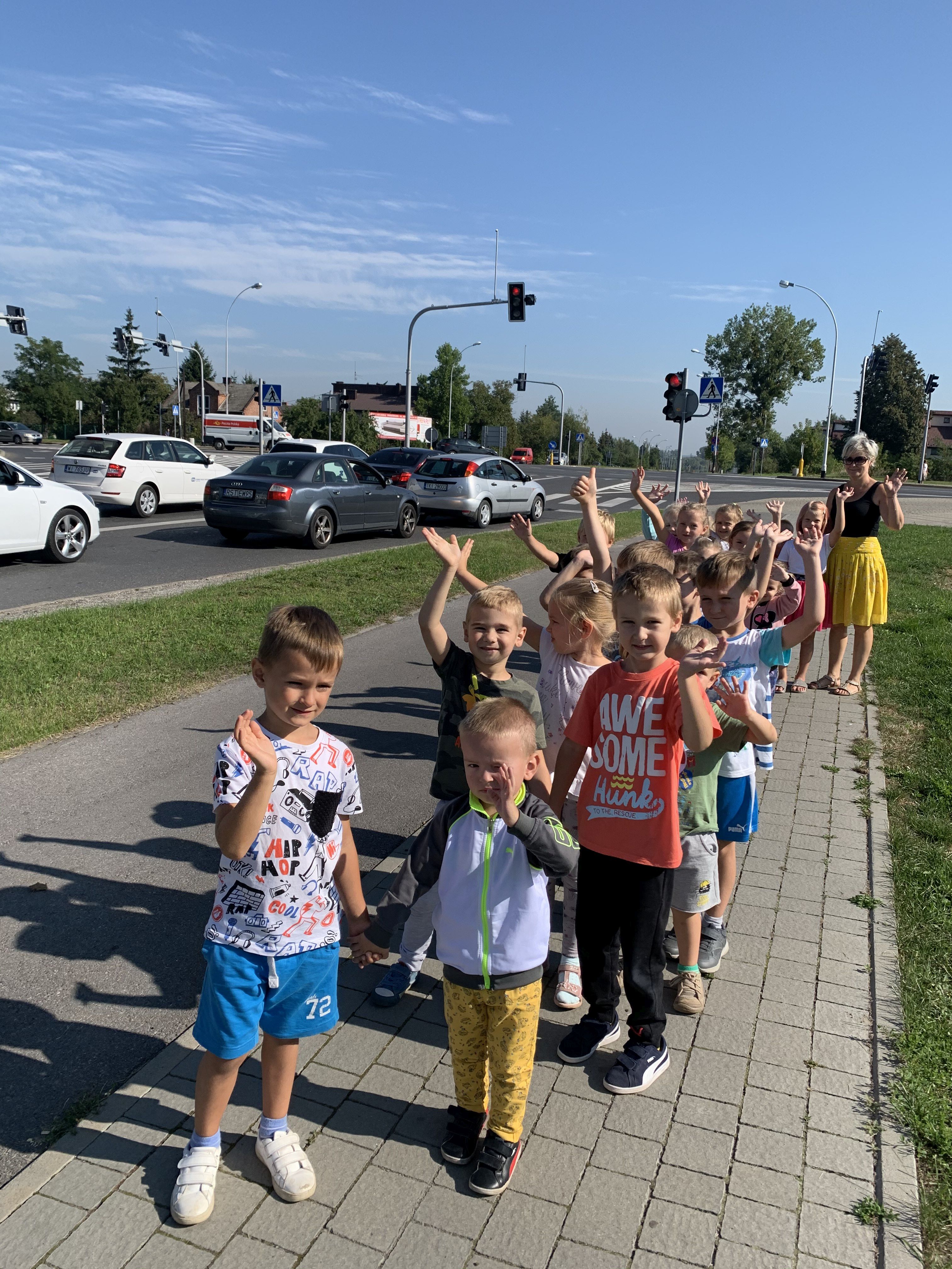 Dzieci wybrały się na krótką wycieczkę na pobliskie skrzyżowanie, żeby obserwować ruch uliczny, rozpoznawać znaki drogowe oraz utrwalić zasady bezpiecznego poruszania się pieszych. Mieliśmy szczęście - pomachali nam policjanci z przejeżdżającego radiowozu. Pogoda też dopisała.