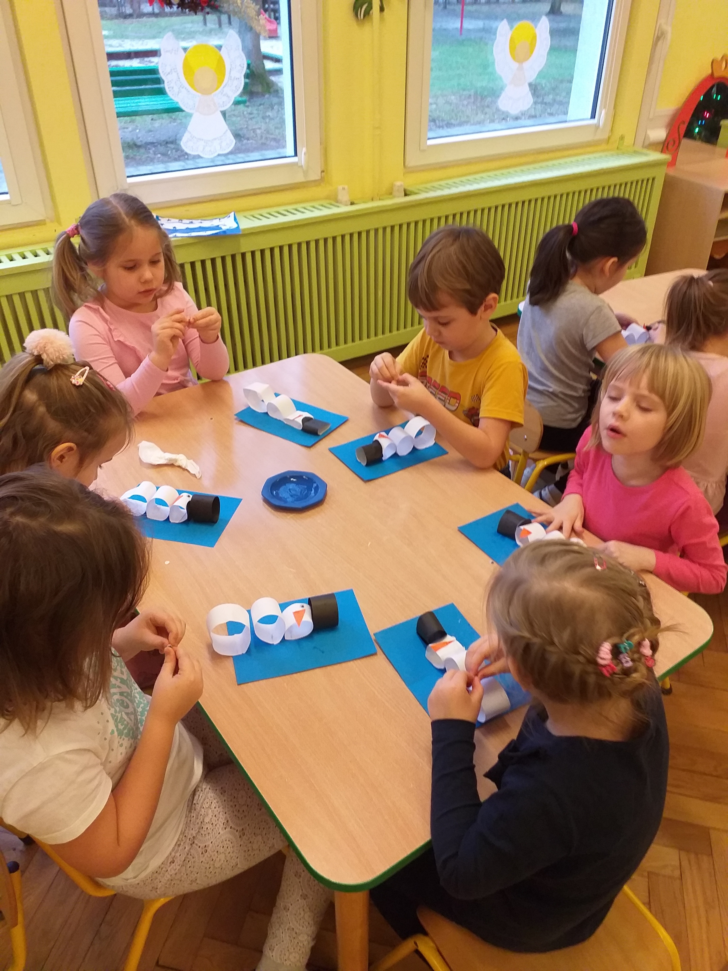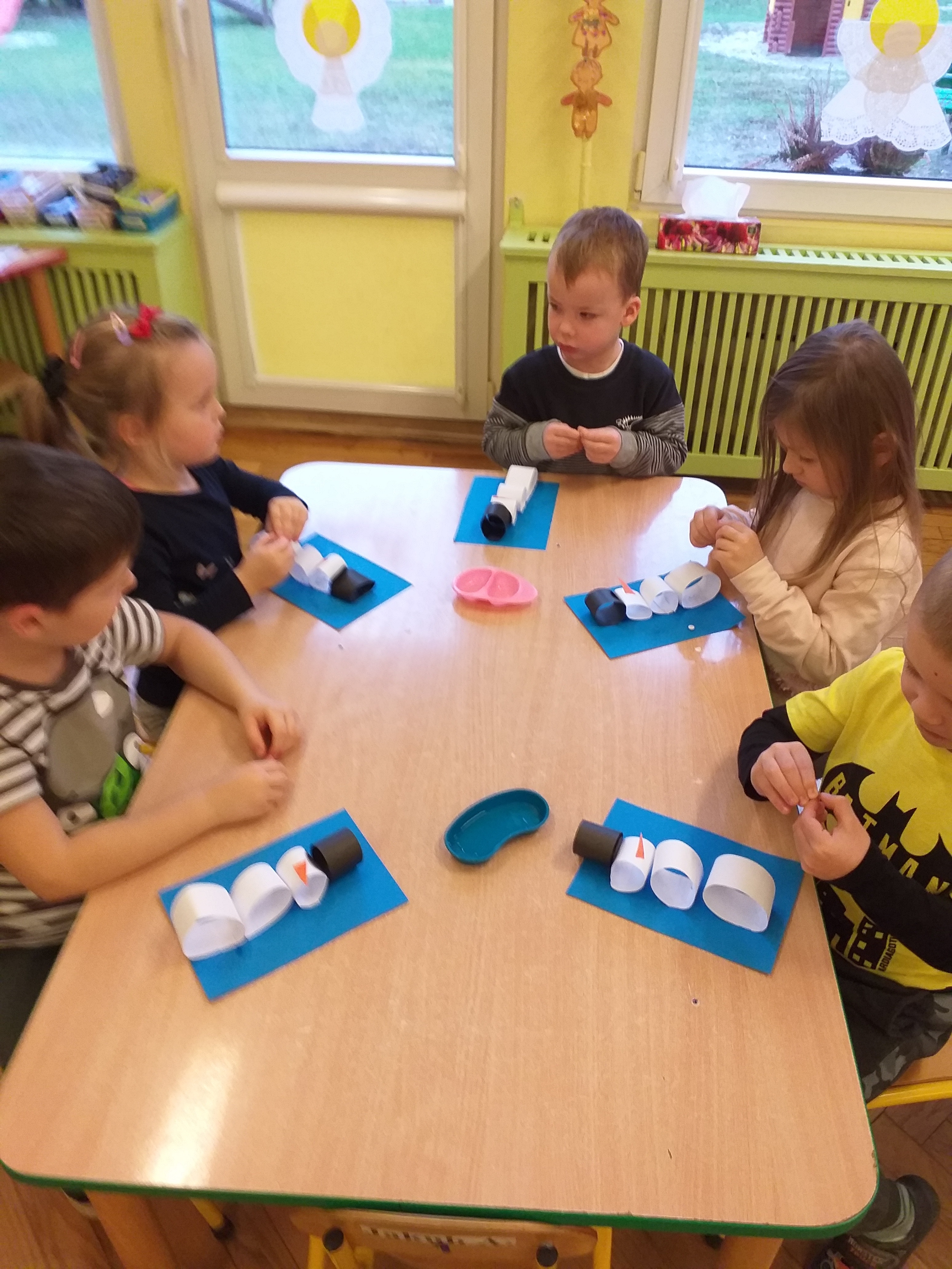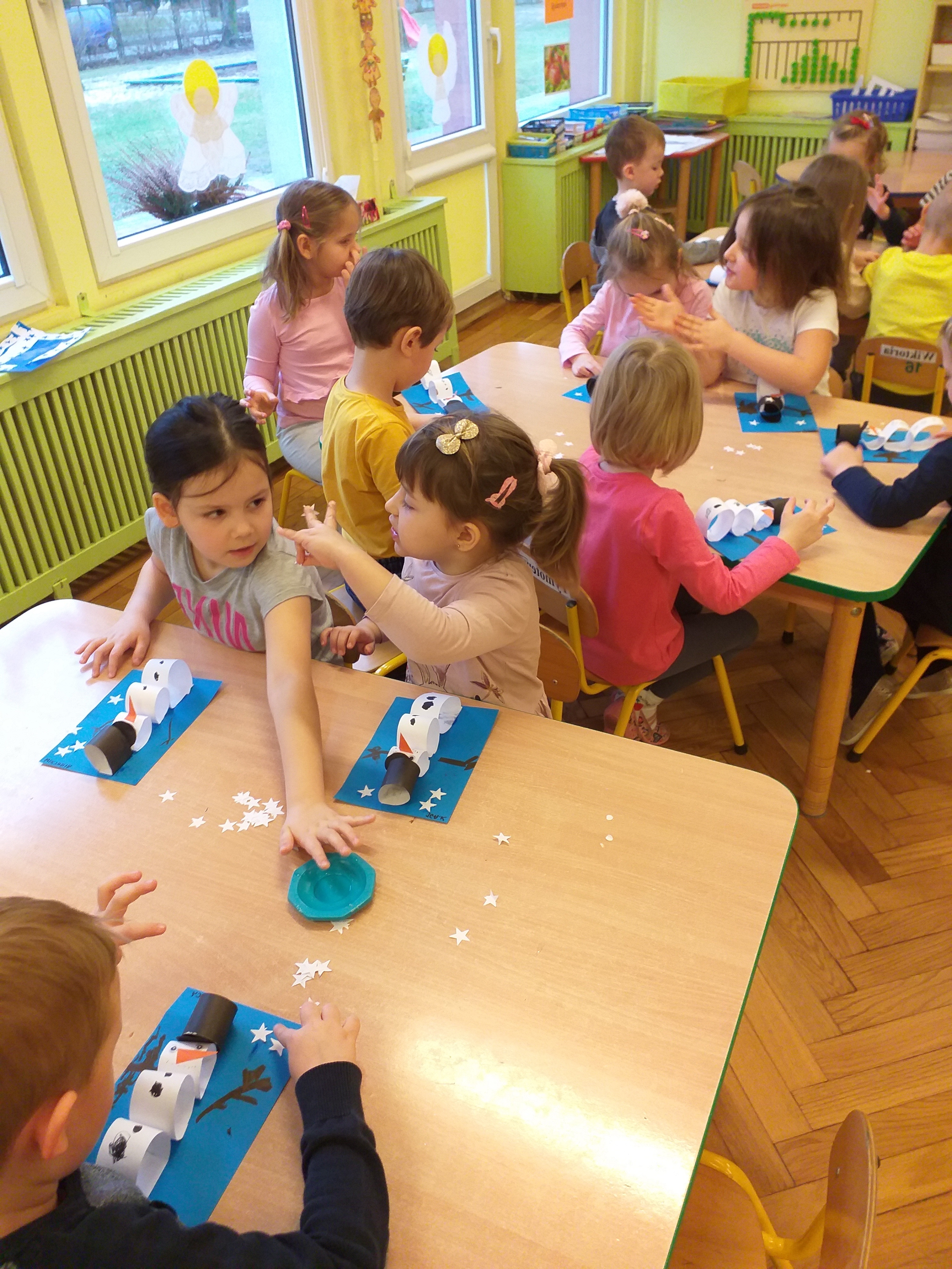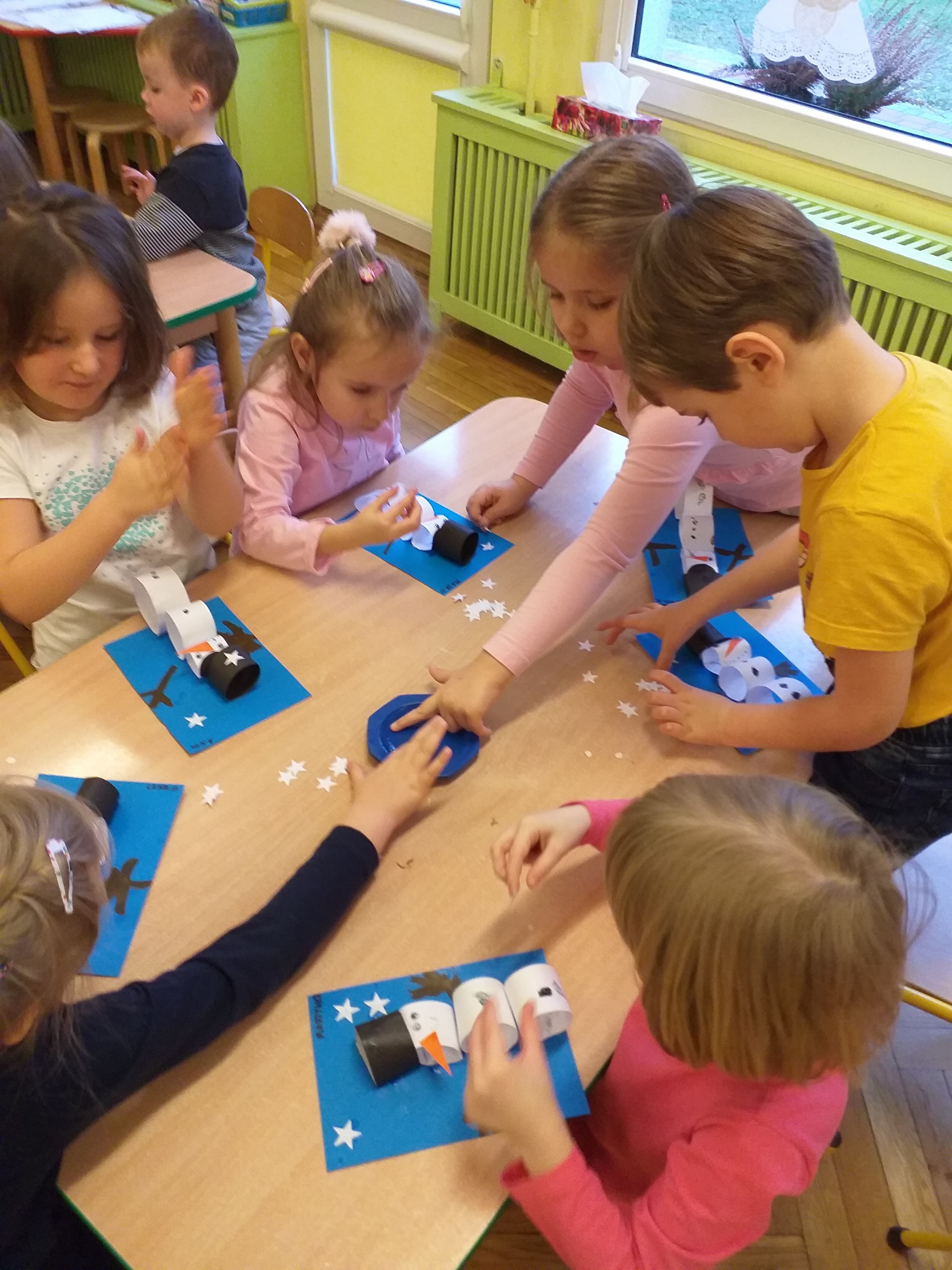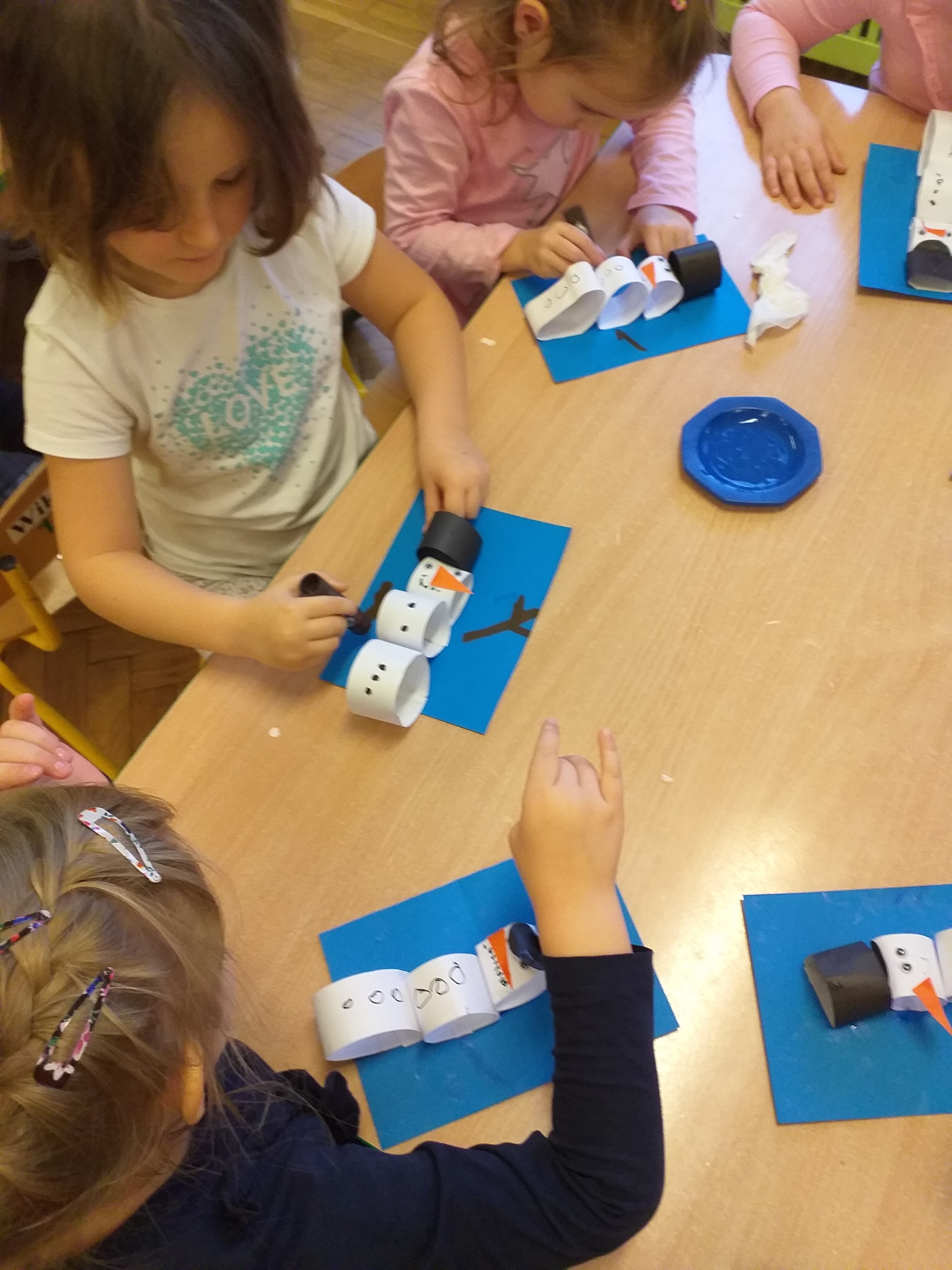 Dzieci z III grupy ,,Biedronki” bawiły się przy piosence ,,Bałwankowa rodzina” rozwijając swoje umiejętności wokalne, koordynację słuchowo – ruchową, percepcję słuchową oraz integrację grupy. Na zajęciach plastycznych dzieci z grupy ,,Biedronki” i ,,Misie” wykonały ,,Bałwanka” według koncepcji planu daltońskiego, zgodnie z instrukcją według wzoru umieszczonego na sztaludze. Dzieci krok po kroku wycinały i przyklejały kolejne elementy bałwanka, dorysowywały ręce, usta, oczy i guziki farbami w sztyfcie. Pracę swoją uzupełniły białymi gwiazdkami. Przedszkolaki dzięki tak wykonanej pracy rozwijały umiejętność odwzorowywania, rozmieszczenia postaci bałwanka na kartce, rozwijały samodzielność, doskonaliły koordynację wzrokowo – ruchową oraz umiejętność posługiwania się nożyczkami.