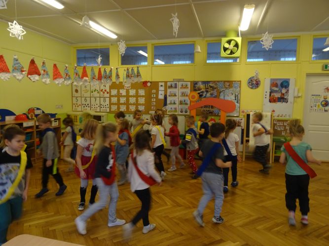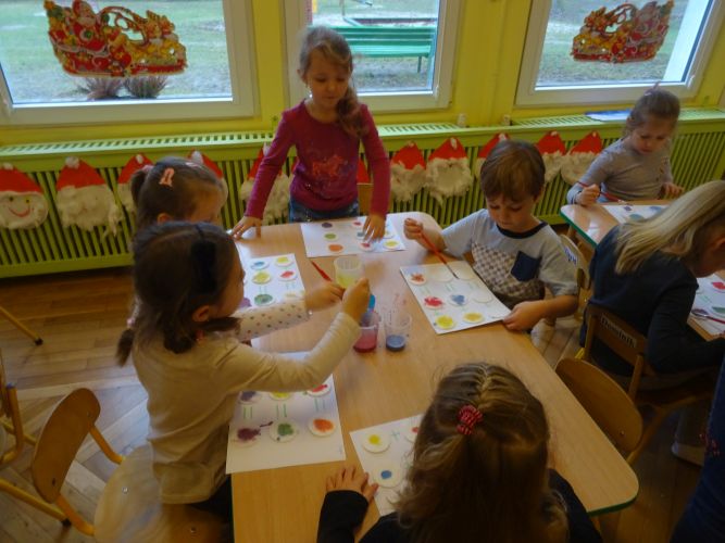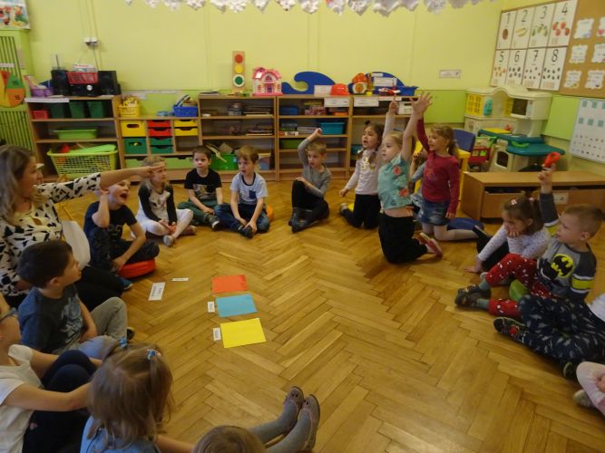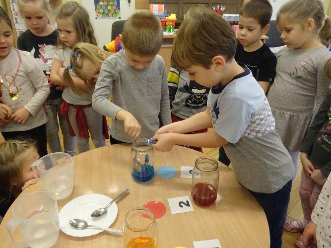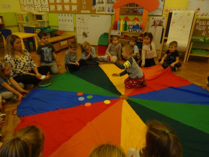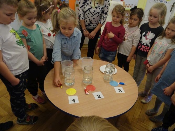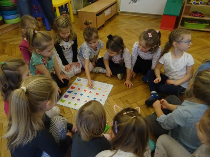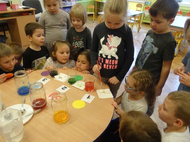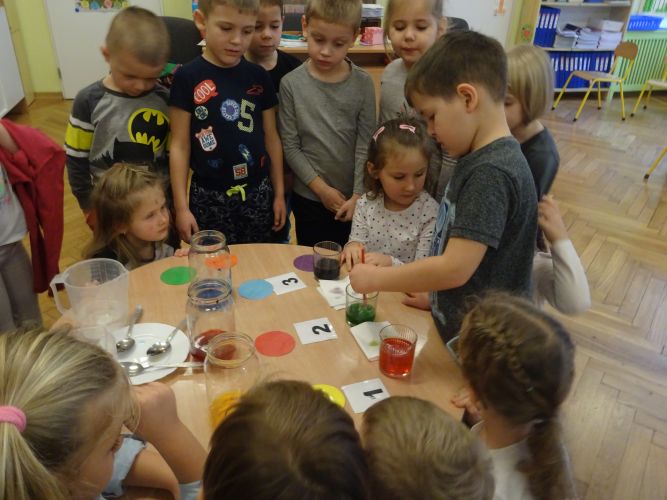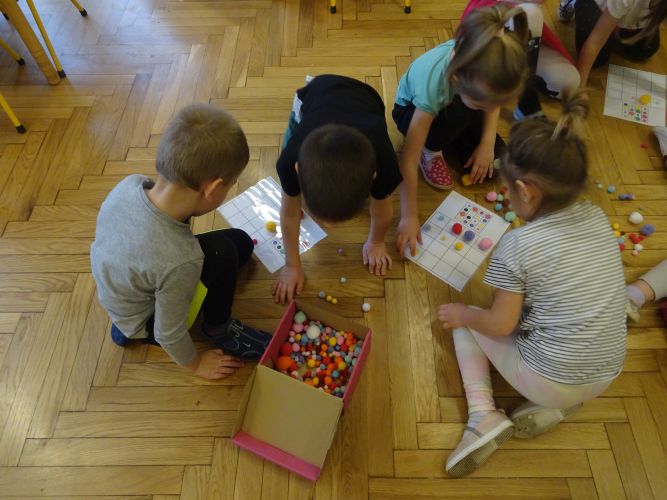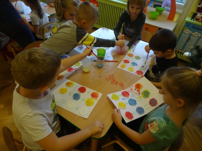 Dzieci z grupy ,,Biedronki" 15.12.2020 r. na zajęciach głównych utrwalały nazwy poznanych kolorów, rozwiązywały zagadki słuchowe o kolorach, przyporządkowywały imiona osób do odpowiednich kolorów nawiązujących do wiersza czytanego przez nauczyciela. Dzieci brały czynny udział w zabawach ruchowych z wykorzystaniem kolorowych szarf oraz chusty animacyjnej Klanza. Dużym zainteresowaniem cieszyły się zabawy z mini matami do kodowania dzięki którym dzieci utrwalały kolory rozwijając spostrzegawczość oraz umiejętność współpracy w zespole. Dzieci rozwijały swoją ciekawość poznawczą poprzez aktywny udział w doświadczeniach z kolorami tworząc barwy podstawowe i barwy pochodne ucząc się przy tym cierpliwości, koncentracji uwagi oraz wyciągania wniosków z prowadzonych doświadczeń. Dzieci eksperymentowały z kolorami również przy stolikach, gdzie za pomocą rozcieńczonych farb i pędzli tworzyły samodzielnie barwy na karcie pracy wykonanej z wykorzystaniem przyklejonych płatków kosmetycznych. Zakończeniem zajęć były dwa zadania dodatkowe przygotowane dla chętnych dzieci ,,Zakodowane pompony' oraz ,,Z płaskiego w przestrzenne" z użyciem kolorowych pomponów i kubeczków do kodowania.