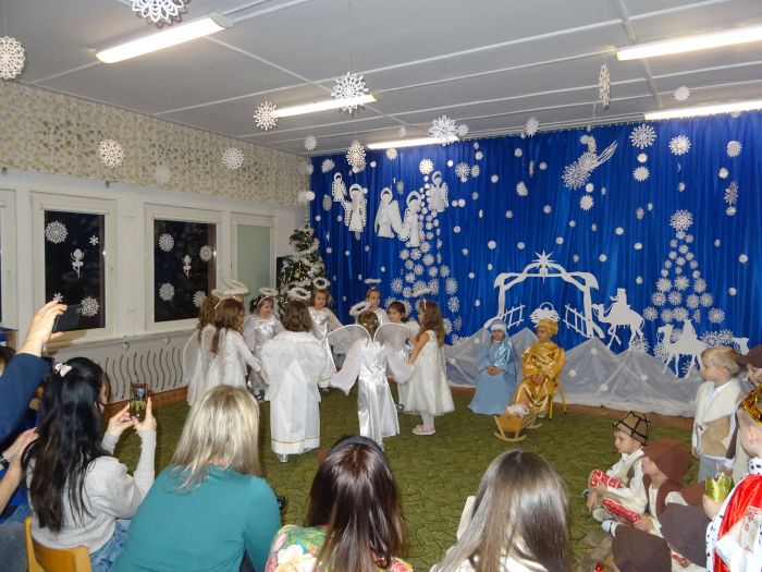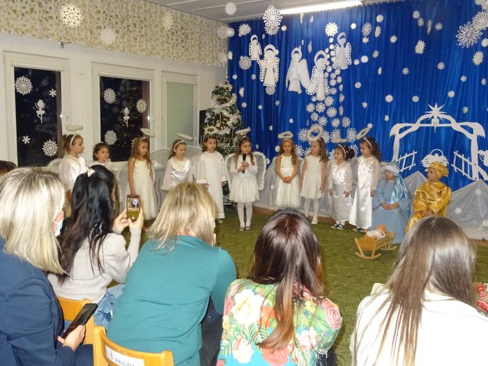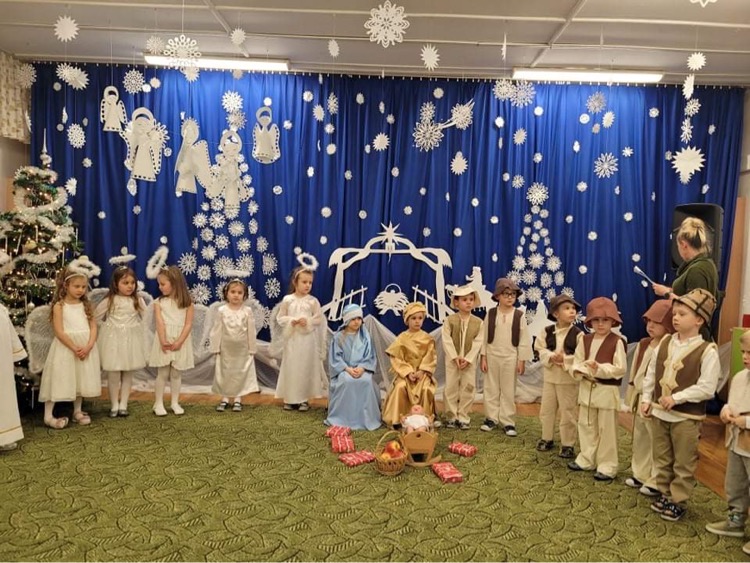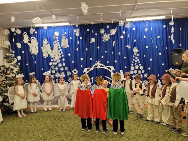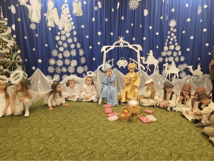 W dniu 20.12.2021 r. odbyła się uroczystość „Jasełka“ w grupie „Biedronki“. Dzieci pod okiem swoich pań przygotowały pod okiem swoich uroczyste Jasełka, do których bardzo pilnie się przygotowywały. Przedstawienie były wyjątkowe. Mali aktorzy, we wspaniałych strojach prezentowali się doskonale na tle bożonarodzeniowej dekoracji – stajenki z Józefem, Maryją i Dzieciątkiem. Wszyscy ulegli magii występów przedszkolaków. Mali artyści z dużym przejęciem i zaangażowaniem wiernie odtwarzali swoje role, prezentowali umiejętności recytatorskie i wokalne. Wszystkim przedszkolakom należą się ogromne pochwały za zaangażowanie, nauczone perfekcyjnie wierszyki, kolędy i pastorałki, dzięki którym stworzyły wspaniałą, świąteczną atmosferę i podbiły serca całej widowni.