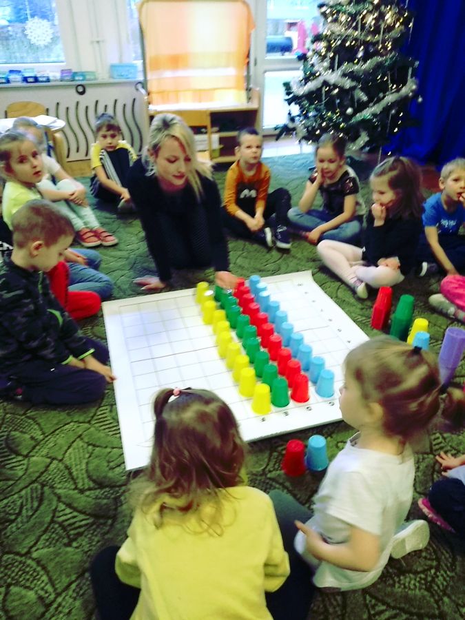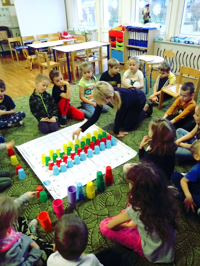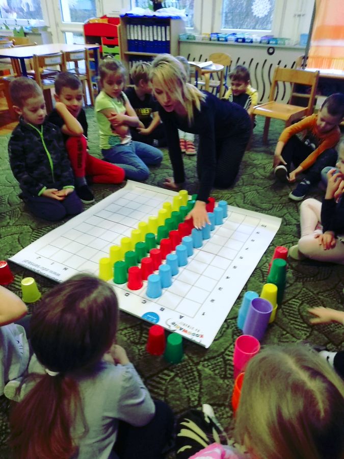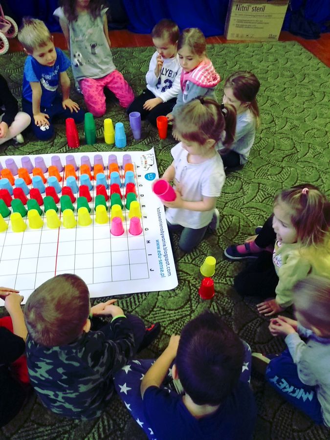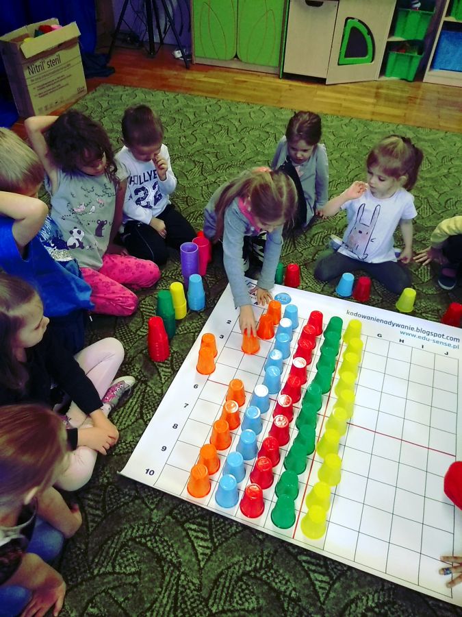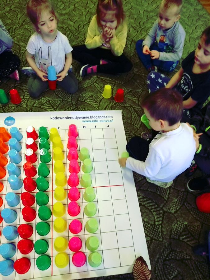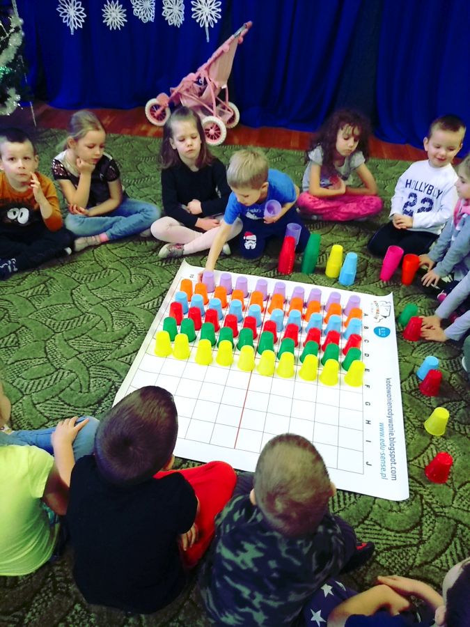 Dzieci z grupy" Zajączki" pracowały z matą do kodowania. Tym razem oprócz tworzenia prostych kodów ustawiały kubeczki według określonych warunków. Dzieci samodzielnie próbowały, poprawiały i sprawdzały czy ustawienie kubeczków spełnia wszystkie określone wcześniej warunki. Zabawa trwała do czasu aż wszystkie założenia zostały spełnione a dzieci poprzez zabawę z matą miały okazję rozwijać logiczne myślenie, wyobraźnię i zdolność kojarzenia , uczyły się współpracy w grupie. Celem zajęć było rozbudzenie inwencji twórczej i kreatywności oraz przygotowanie do edukacji szkolnej (podnoszenie kompetencji matematycznych) oraz doskonalenie orientacji przestrzennej.