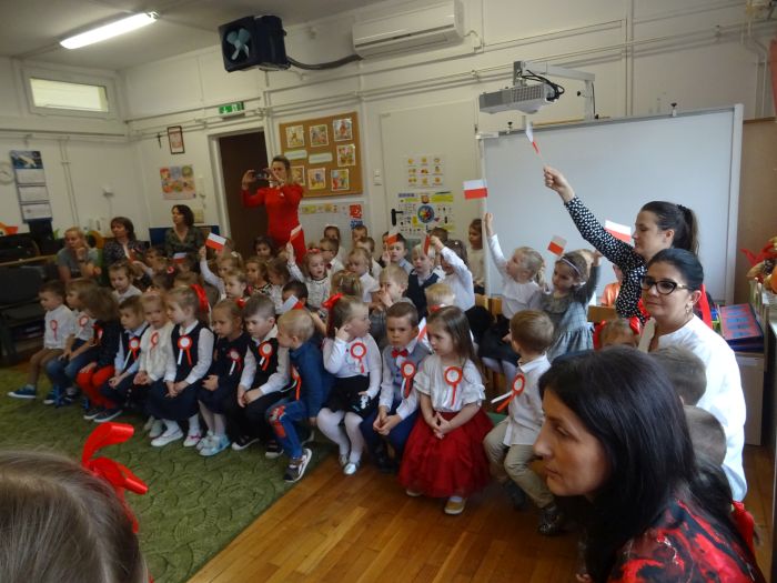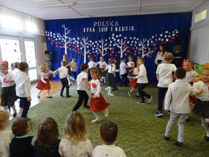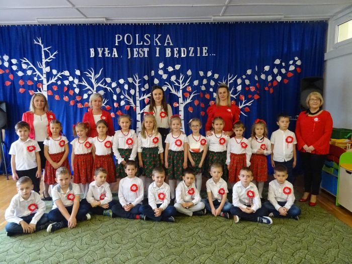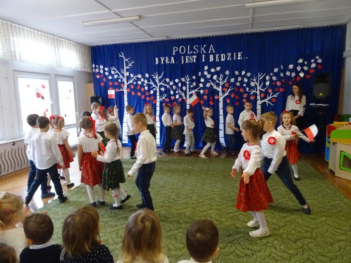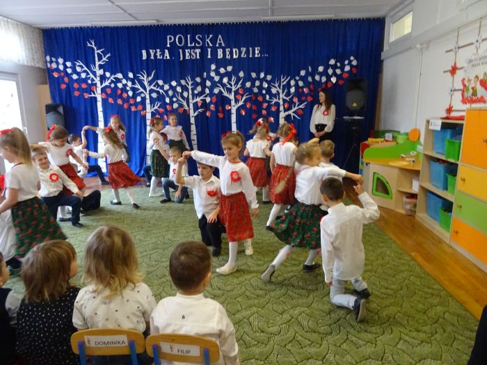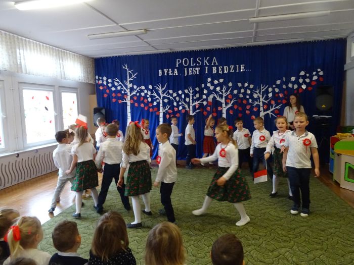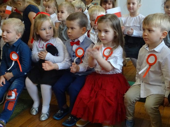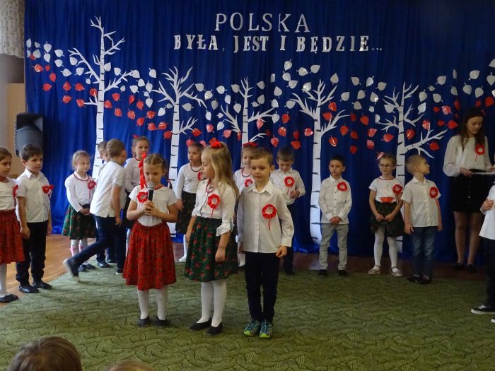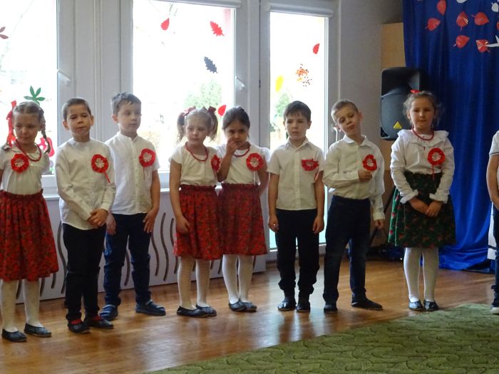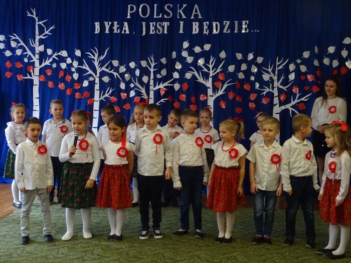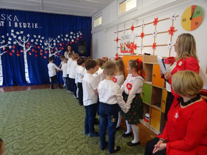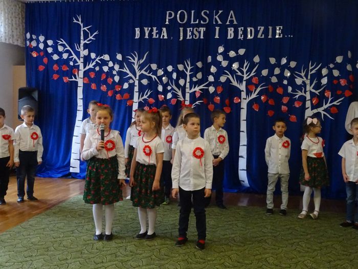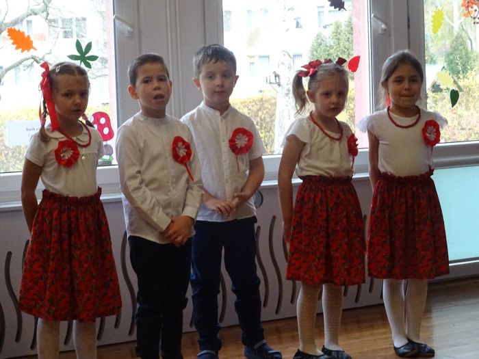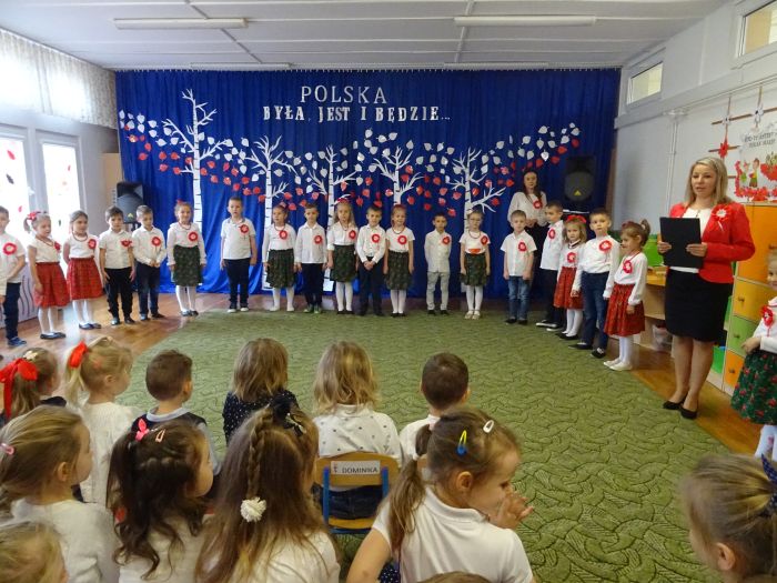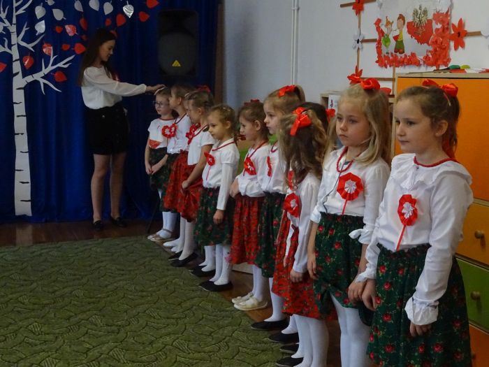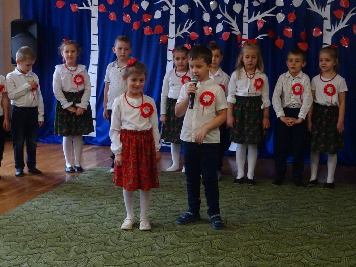 czerwone kotyliony. ,,Motylki” recytowały wiersze min.: wiersz ,,Katechizm polskiego dziecka” W. Bełzy , ,,Barwy ojczyste” Cz. Janczarskiego i wiele innych mówiących o symbolach i barwach narodowych oraz historii naszego państwa krzewiąc w dzieciach miłość do ojczyzny rozwijały przy tym swoje umiejętności artystyczne i recytatorskie. Dzieci śpiewały piosenki o tematyce patriotycznej, zatańczyły ,,Lasowiaka”- tradycyjny taniec ludowy, który jest elementem kultury naszego kraju. Na zakończenie akademii młodzi artyści oraz zebrani goście odśpiewali hymn Polski ,,Mazurka Dąbrowskiego” pamiętając o zachowaniu powagi i należytej postawy. ,,Motyki” za występ, przygotowanie i postawę patriotyczną zostały nagrodzone gromkimi brawami.