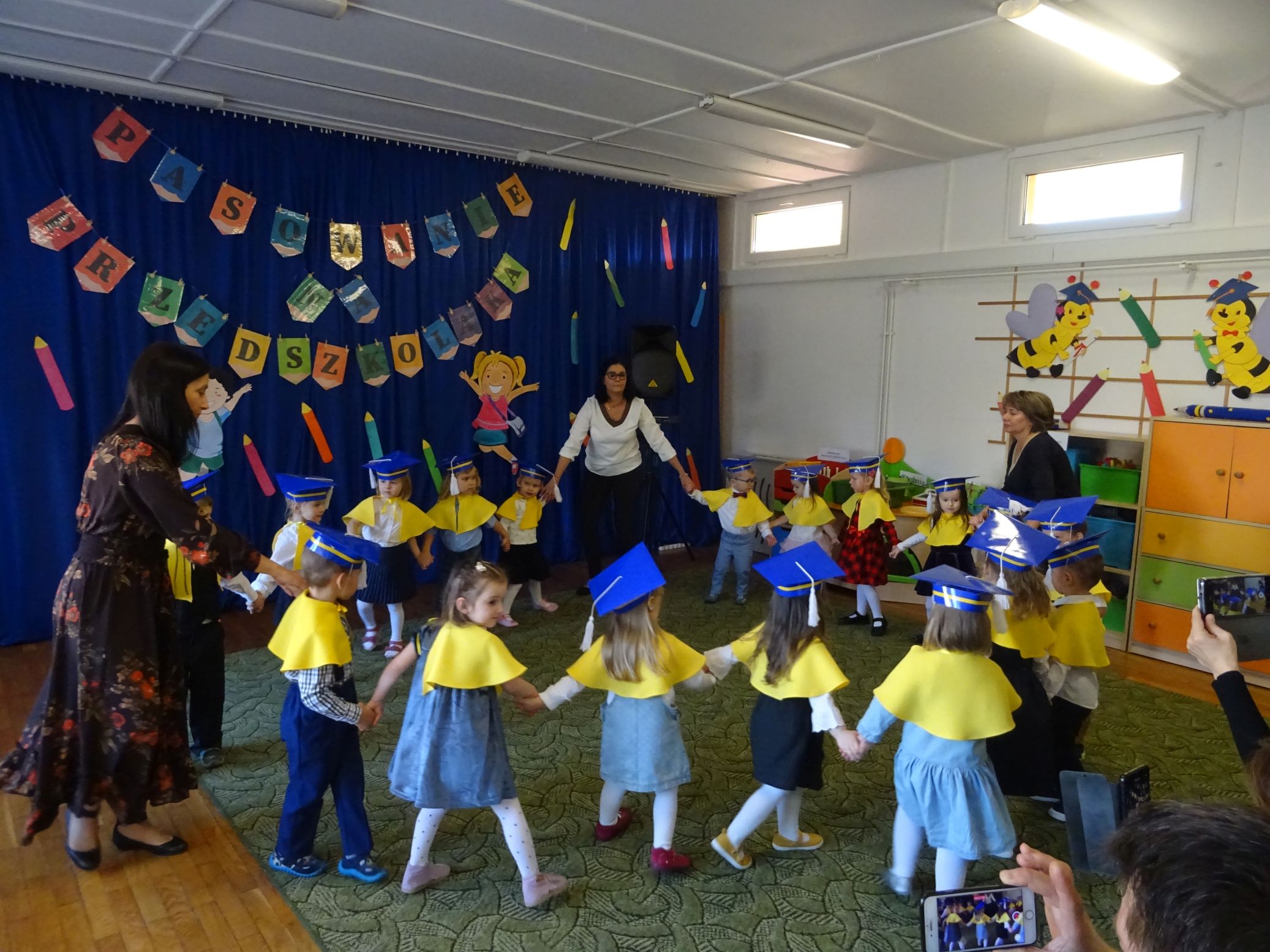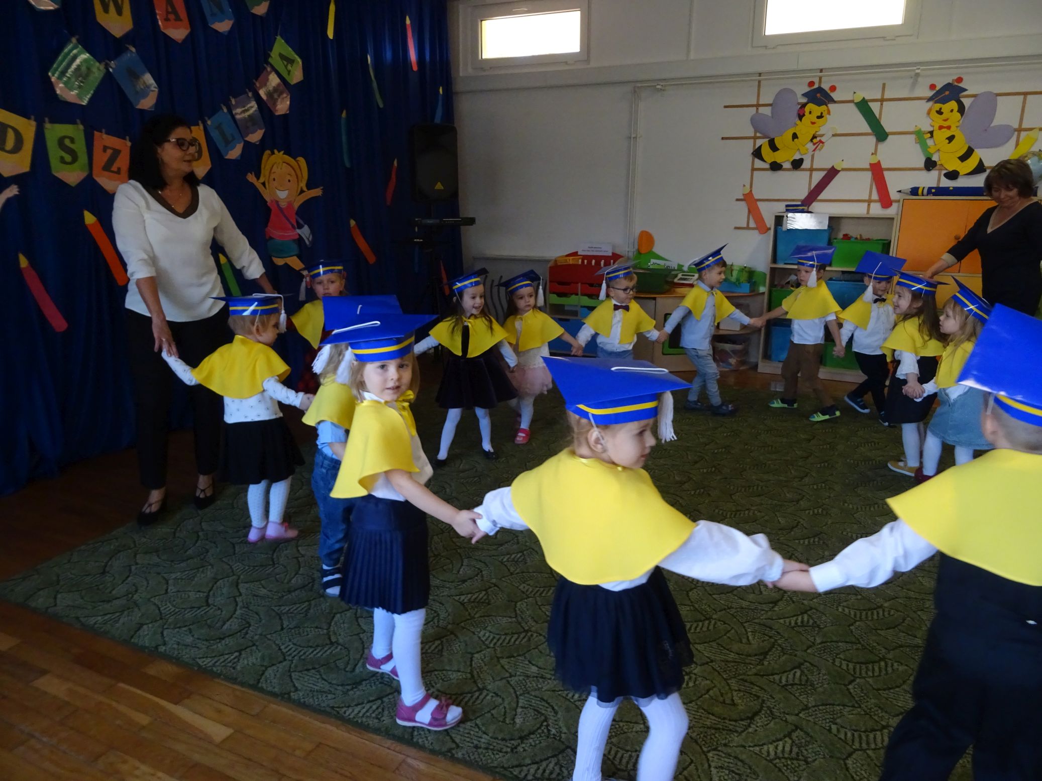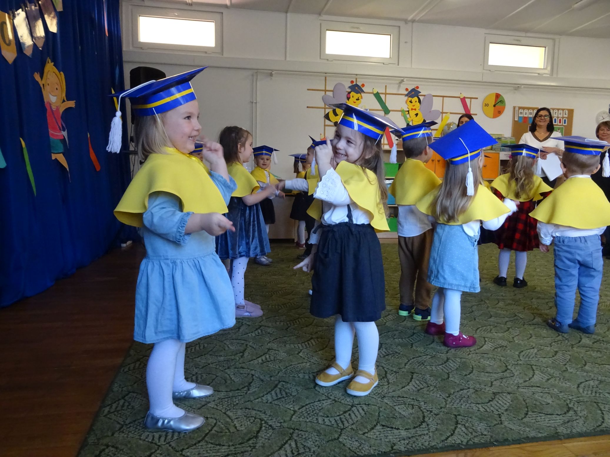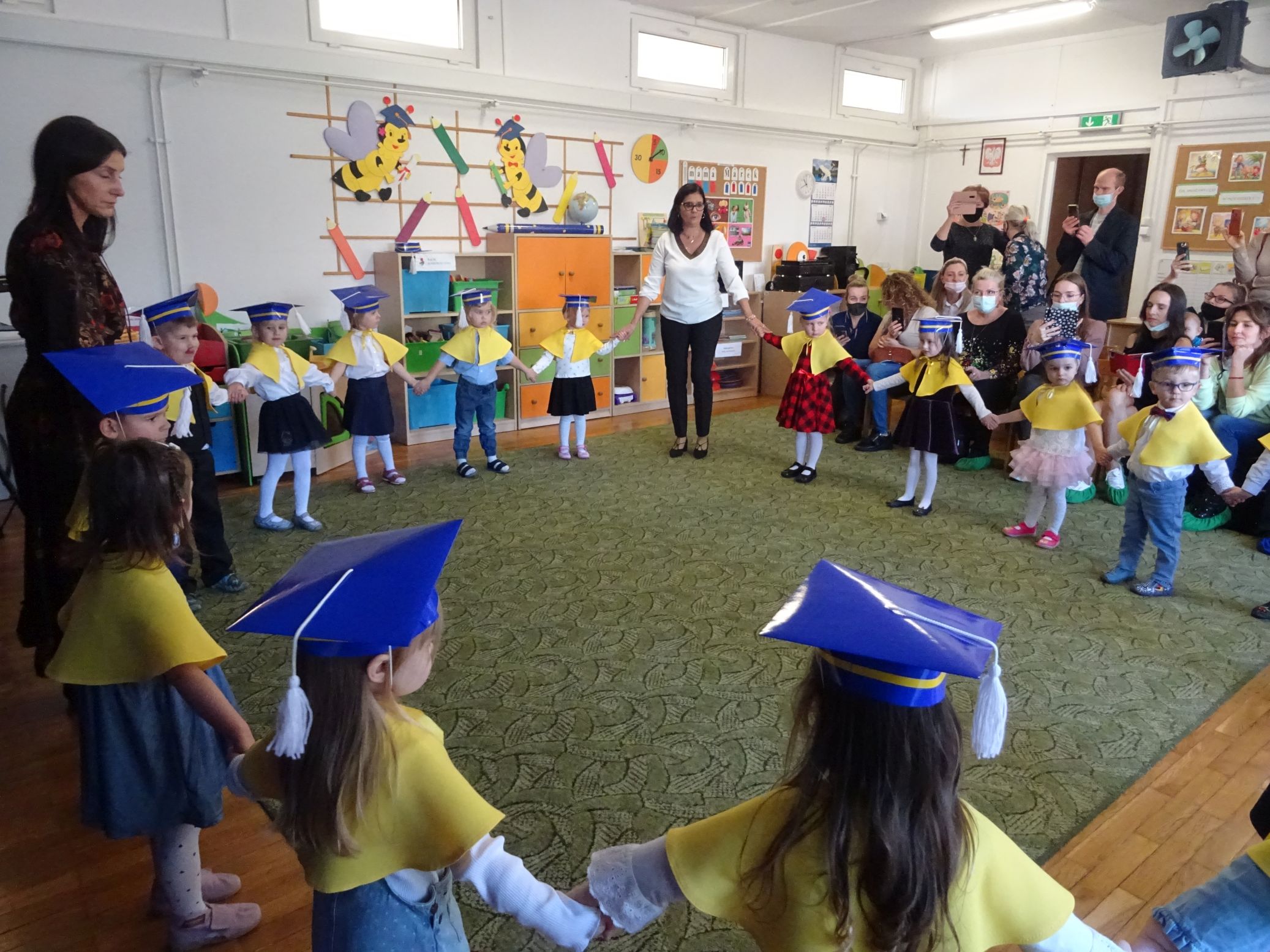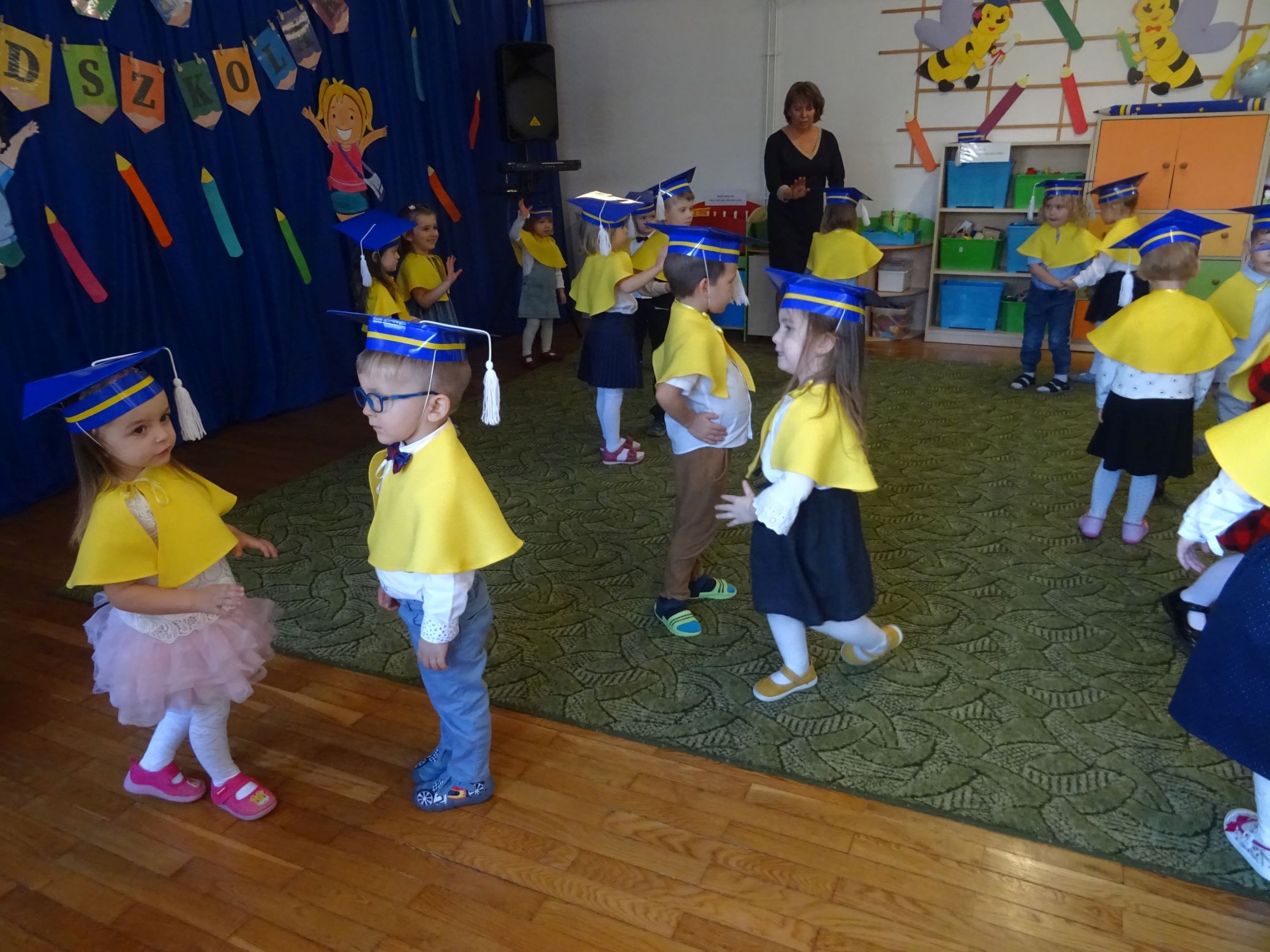 Odbyła się również wspólna zabawa dzieci z rodzicami przy piosence ,,Kaczuszki”. Była to uroczystość kończąca realizację ,,Programu wstępnej adaptacji do przedszkola”.