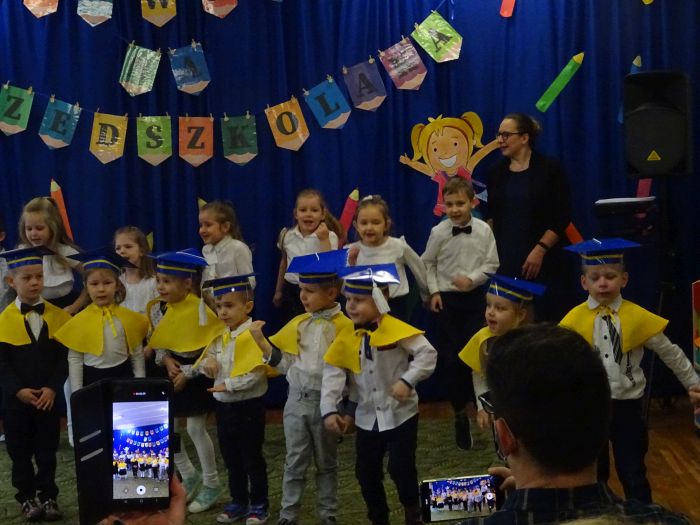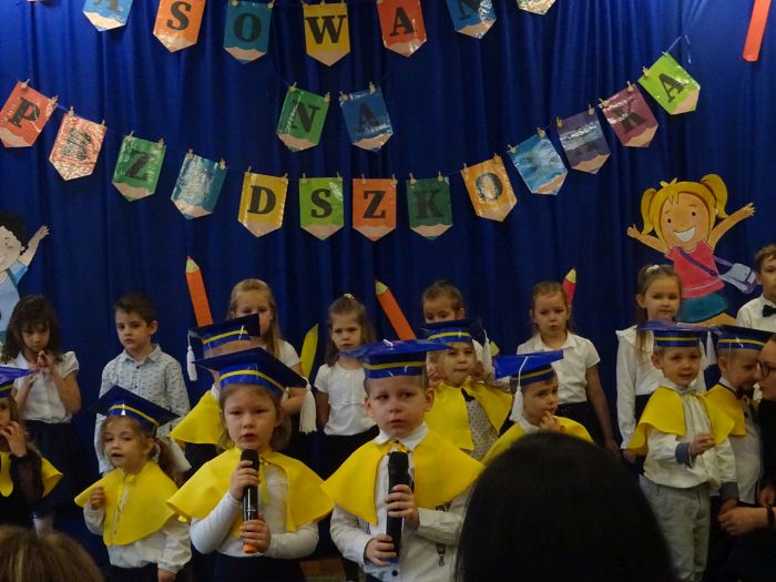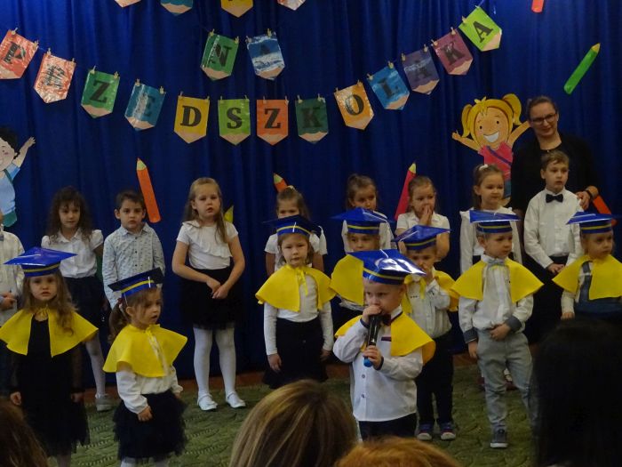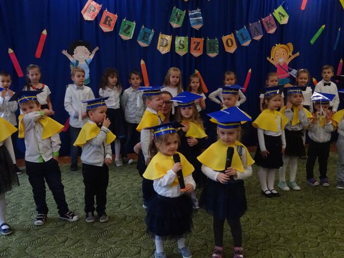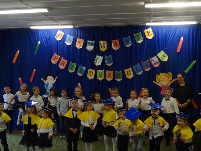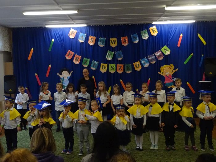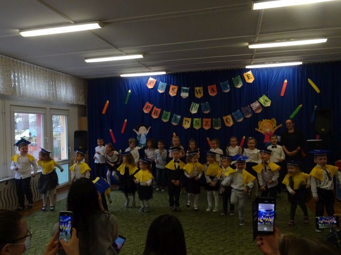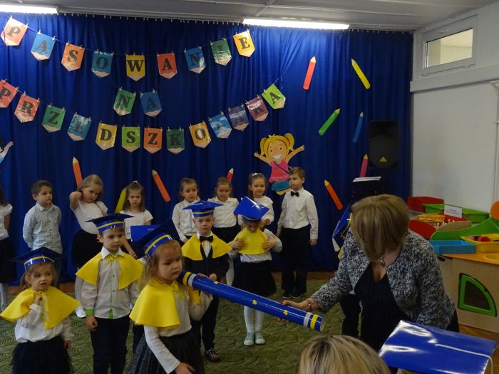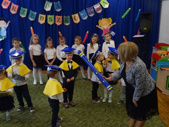 W grupie "Zajączki" odbyła się uroczystość pasowania na przedszkolaka. W tym wyjątkowym dniu najmłodsi członkowie grupy w asyście starszych kolegów zaprezentowały swoje umiejętności artystyczne, recytatorskie i taneczne. Dzieci pięknie zaśpiewały i zatańczyły piosenki pt. "Przywitajmy się wesoło", " Hello, hello". , "Chociaż wczesna pora", " Budzik" a a także wykonały instrumentację do utworu Musette J.S.Bacha , zatańczyły skoczny taniec do utworu "Grease". "Zajączki" recytowały wiersze. zbiorowo, indywidualnie i parami a na koniec młodsze dzieci złożyły uroczystą przysięgę i otrzymały pasowanie z rąk pani Dyrektor tym samym oficjalnie zostały przyjęte do grona przedszkolaków.
