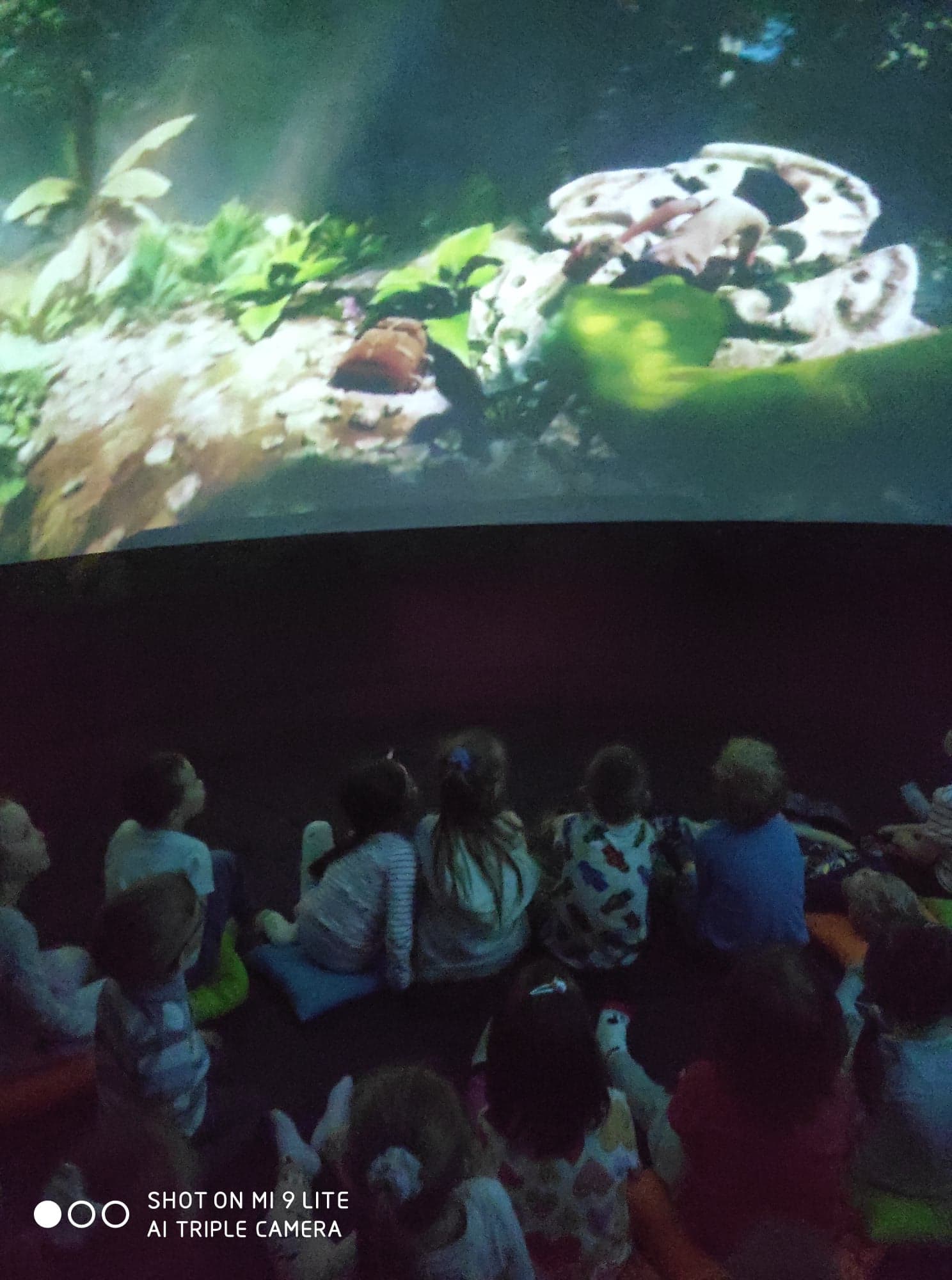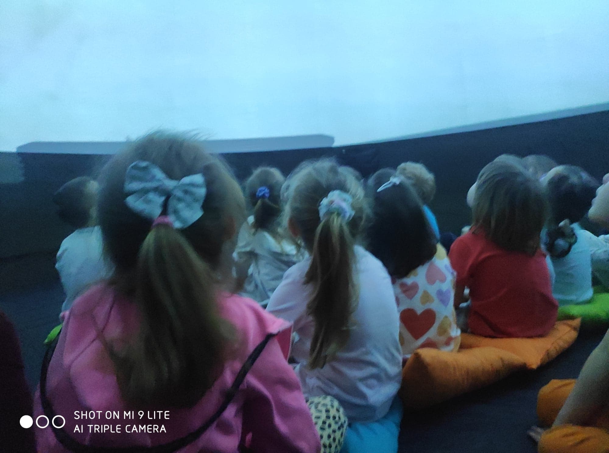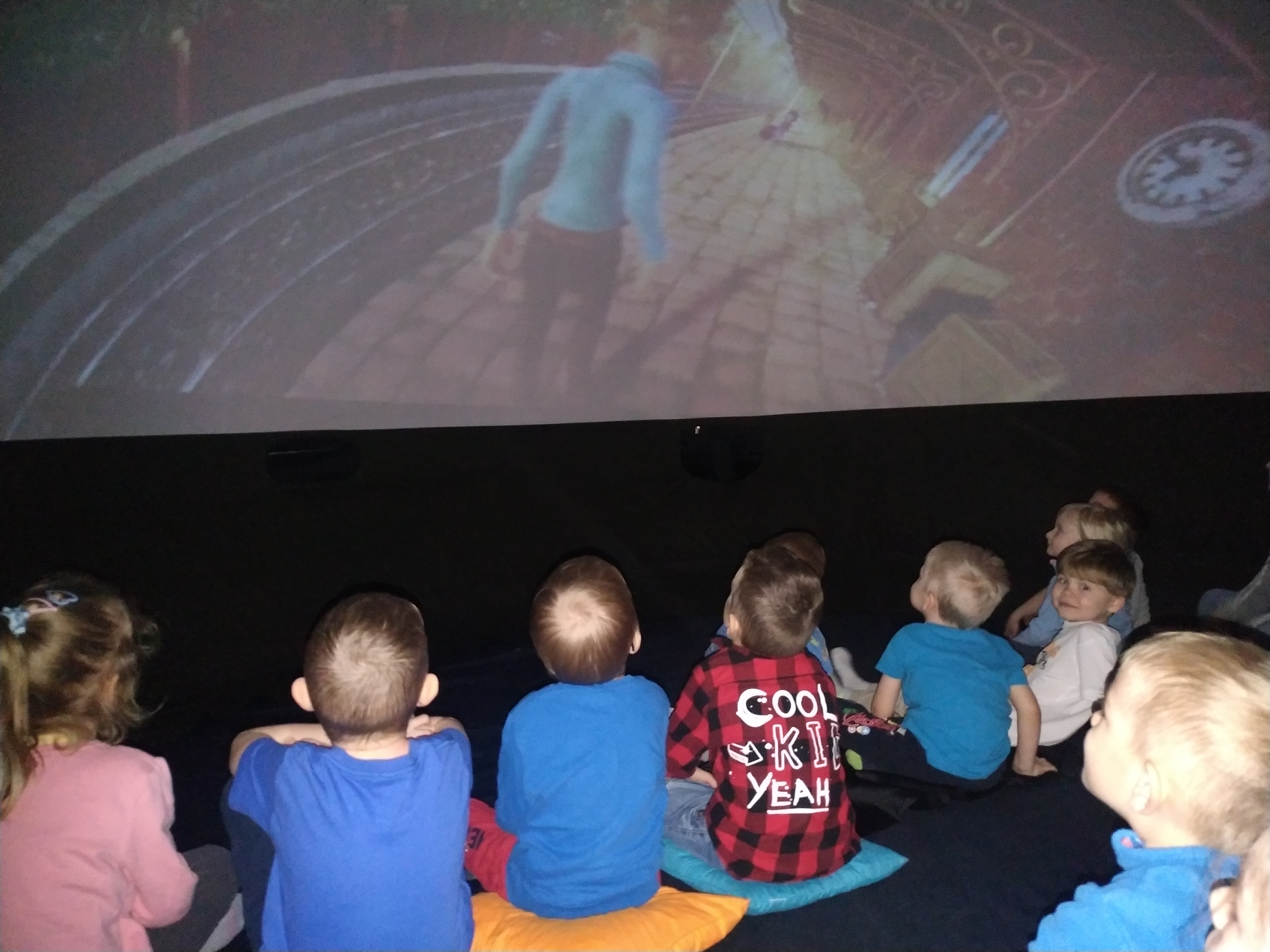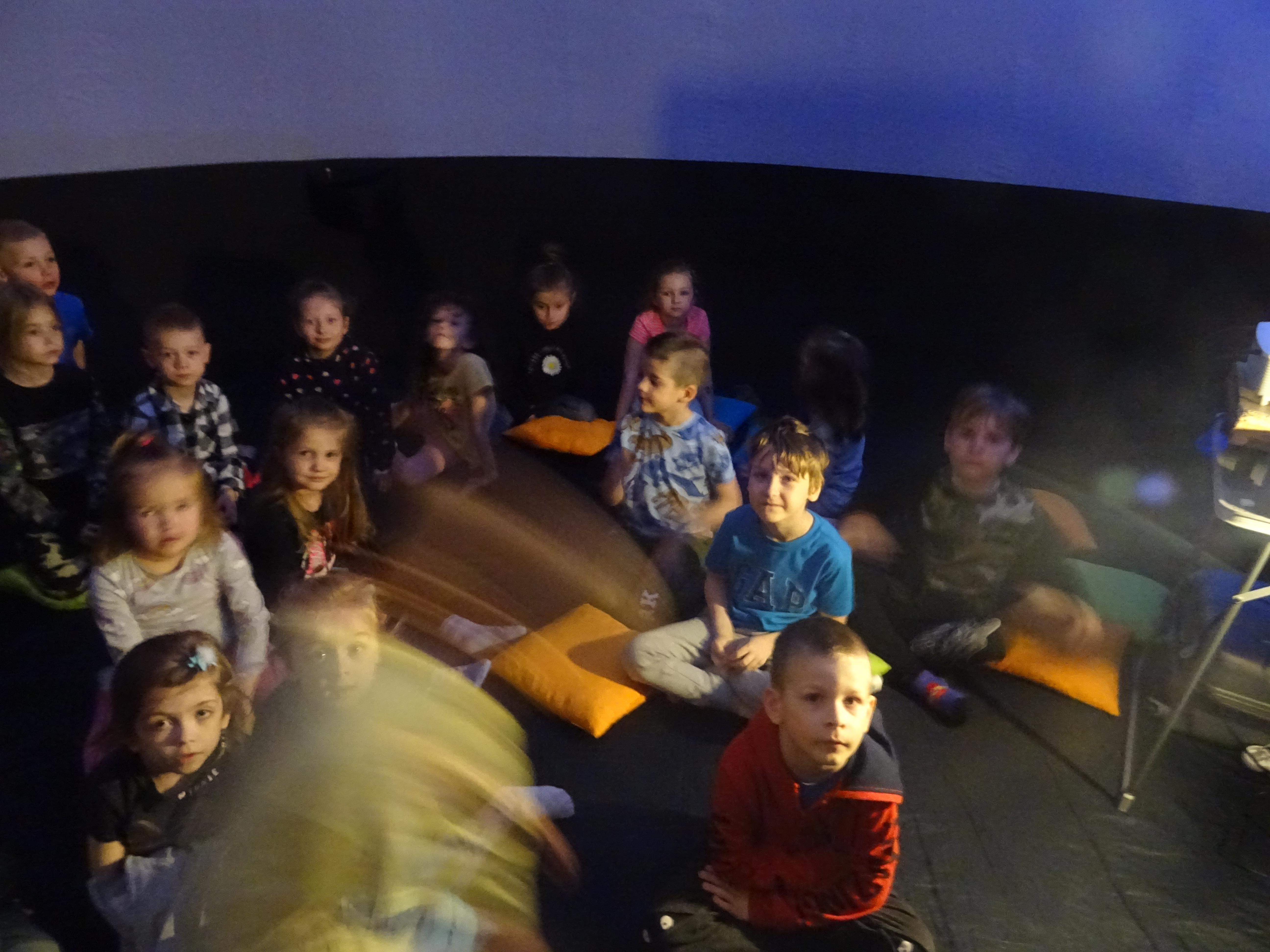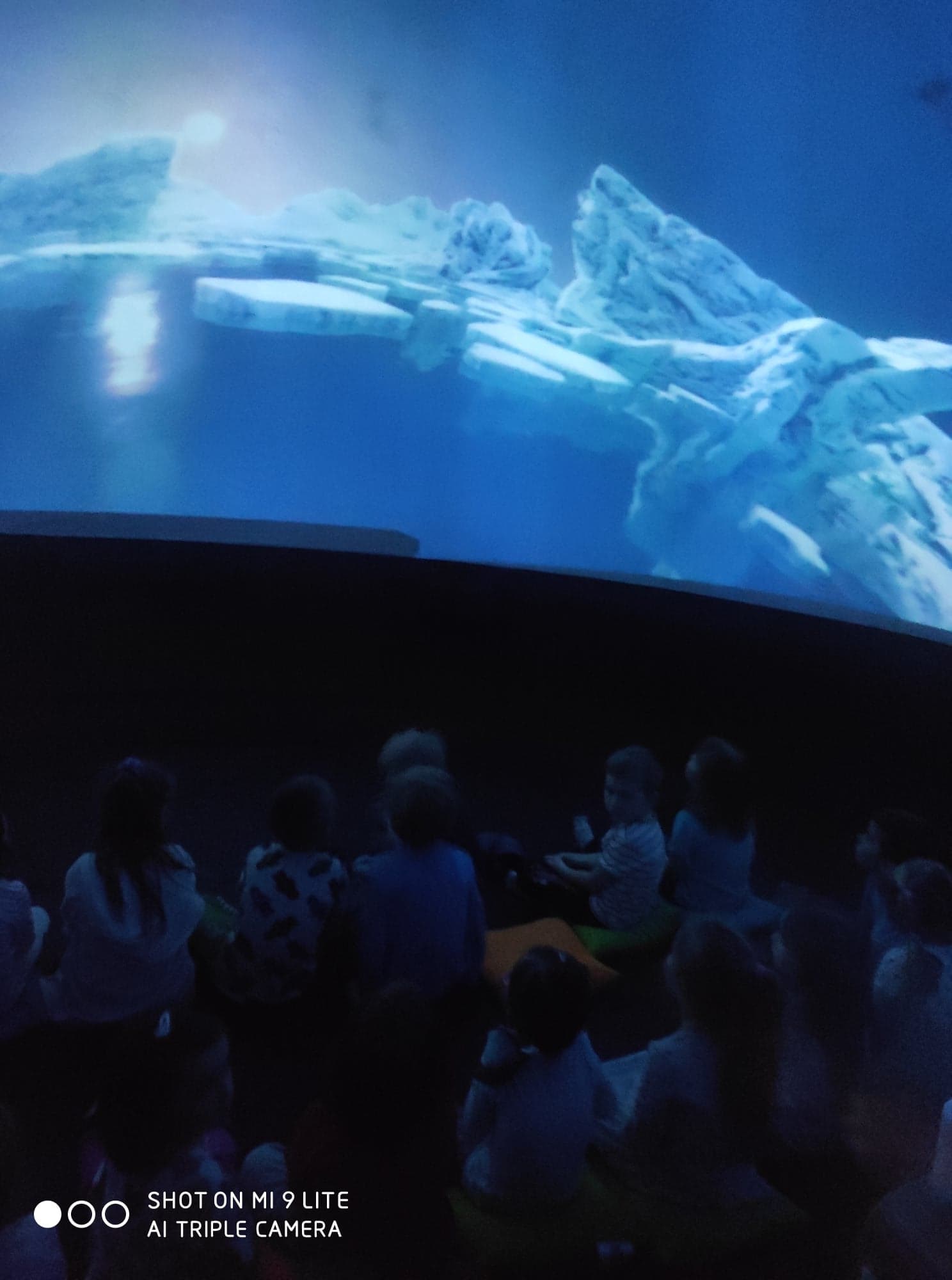 21.04.2022 r. przedszkolaki wzięły udział w niezwykłej lekcji astronomii. Był to seans w planetarium pt: „Zaczarowany globus“. Film opowiada historię małej Mii, która podczas wakacji u dziadka odkrywa na strychu tajemniczą machinę astronomiczną. Edek, Ekscentryczny wujek dziewczynki, podstępnie zmusza ją do wykorzystania sekretnych mocy urządzenia i zmiany pór roku na Ziemii. Bystra dziewczynka szybko orientuje się w potencjalnych konsekwencjach, jednak Edek nie chce odpuścić realizacji swojego niecnego planu. Historia opowiedziana w filmie pomaga dzieciom budować wiedzę przyrodniczą i pozwala im poznać fakty naukowe, m.in. takie jak to, że: Ziemia kręci się wokół własnej osi, a Słońce oświetla ją z jednej strony tworząc dzień i noc; rok jest podzielony na cztery pory roku, ale pogoda nie zawsze współgra z tym podziałem; zwierzęta i rośliny przystosowały się do zmian spowodowanych porami roku i nie mogą bez nich istnieć. Z pewnością tak przekazane dzieciom informacje umożliwią im budowanie wiedzy o otaczającym je świecie.