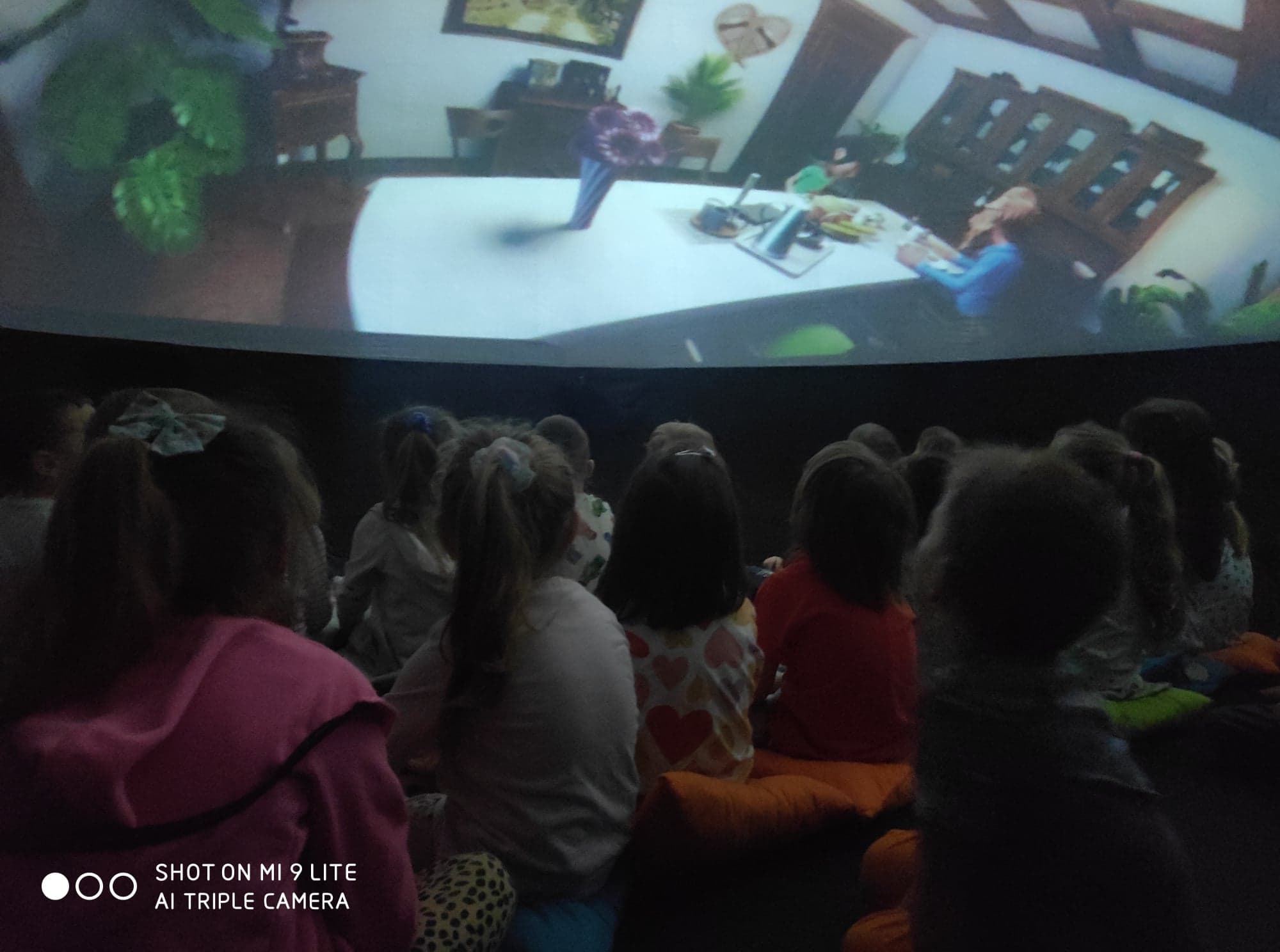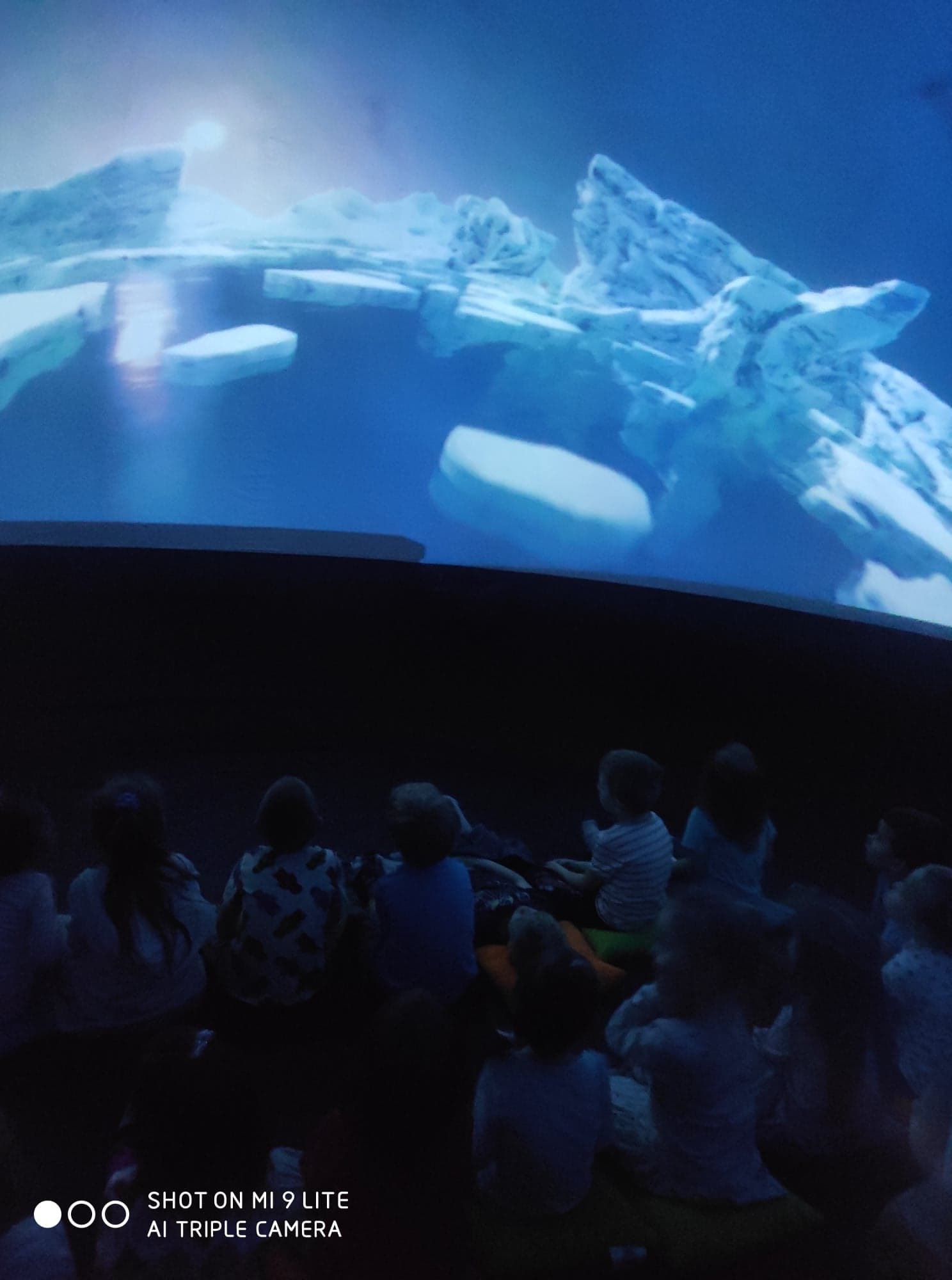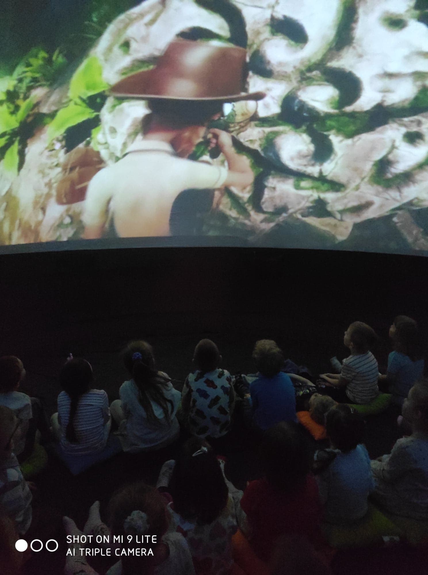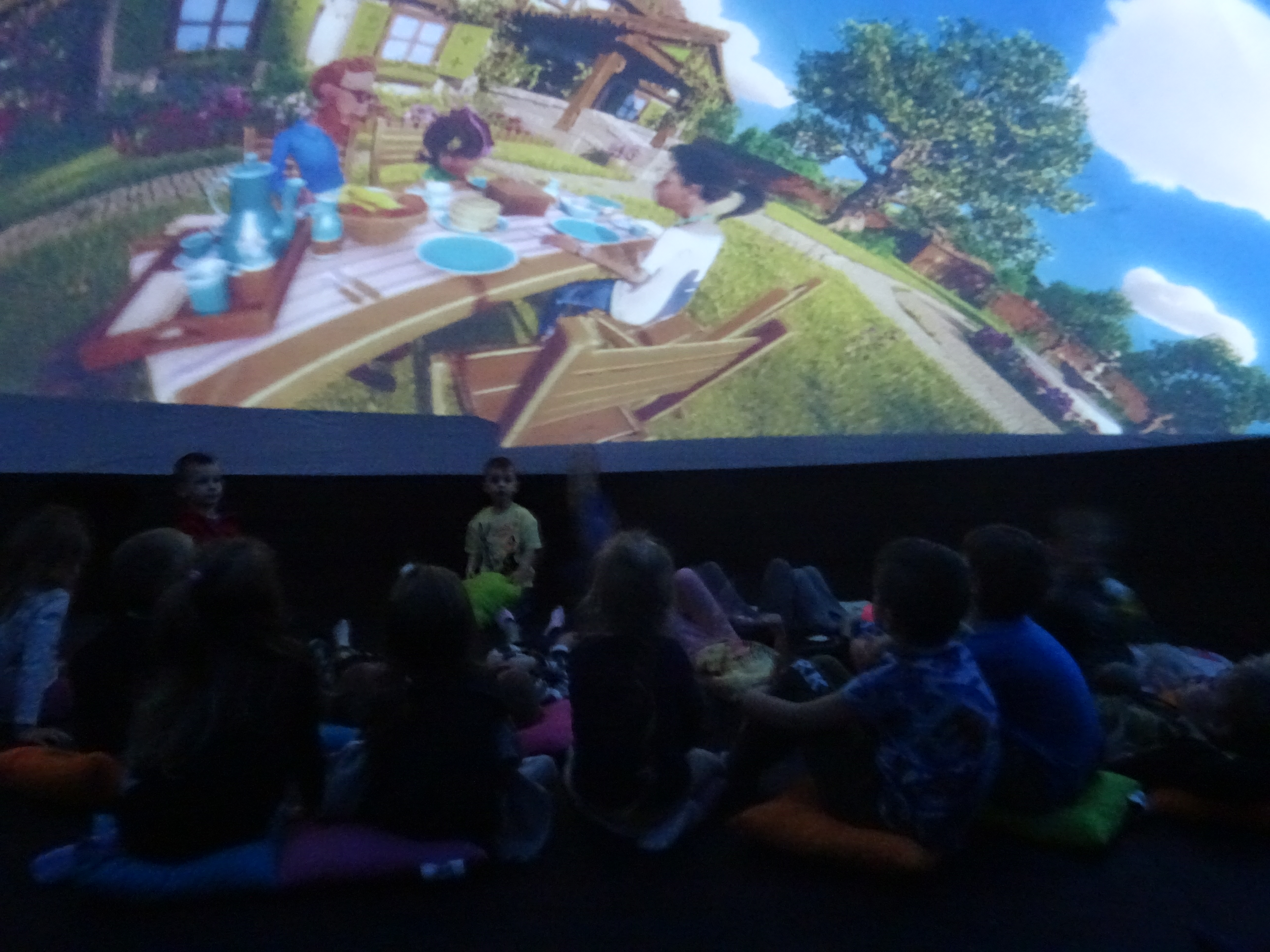 21.04.2022 r. przedszkolaki wzięły udział w niezwykłej lekcji astronomii. Był to seans w planetarium pt: „Zaczarowany globus“. Film opowiada historię małej Mii, która podczas wakacji u dziadka odkrywa na strychu tajemniczą machinę astronomiczną. Edek, Ekscentryczny wujek dziewczynki, podstępnie zmusza ją do wykorzystania sekretnych mocy urządzenia i zmiany pór roku na Ziemii. Bystra dziewczynka szybko orientuje się w potencjalnych konsekwencjach, jednak Edek nie chce odpuścić realizacji swojego niecnego planu. Historia opowiedziana w filmie pomaga dzieciom budować wiedzę przyrodniczą i pozwala im poznać fakty naukowe, m.in. takie jak to, że: Ziemia kręci się wokół własnej osi, a Słońce oświetla ją z jednej strony tworząc dzień i noc; rok jest podzielony na cztery pory roku, ale pogoda nie zawsze współgra z tym podziałem; zwierzęta i rośliny przystosowały się do zmian spowodowanych porami roku i nie mogą bez nich istnieć. Z pewnością tak przekazane dzieciom informacje umożliwią im budowanie wiedzy o otaczającym je świecie.