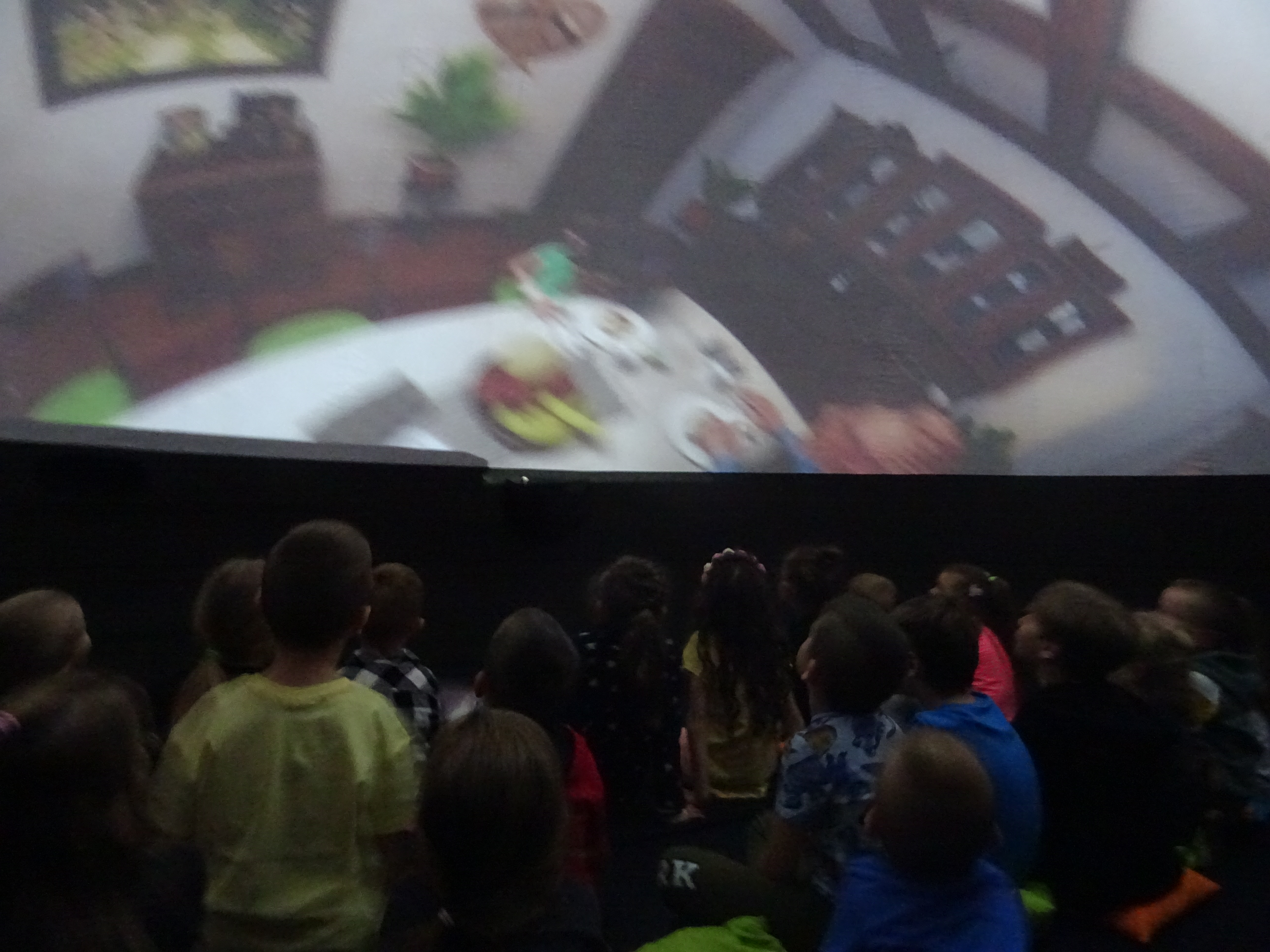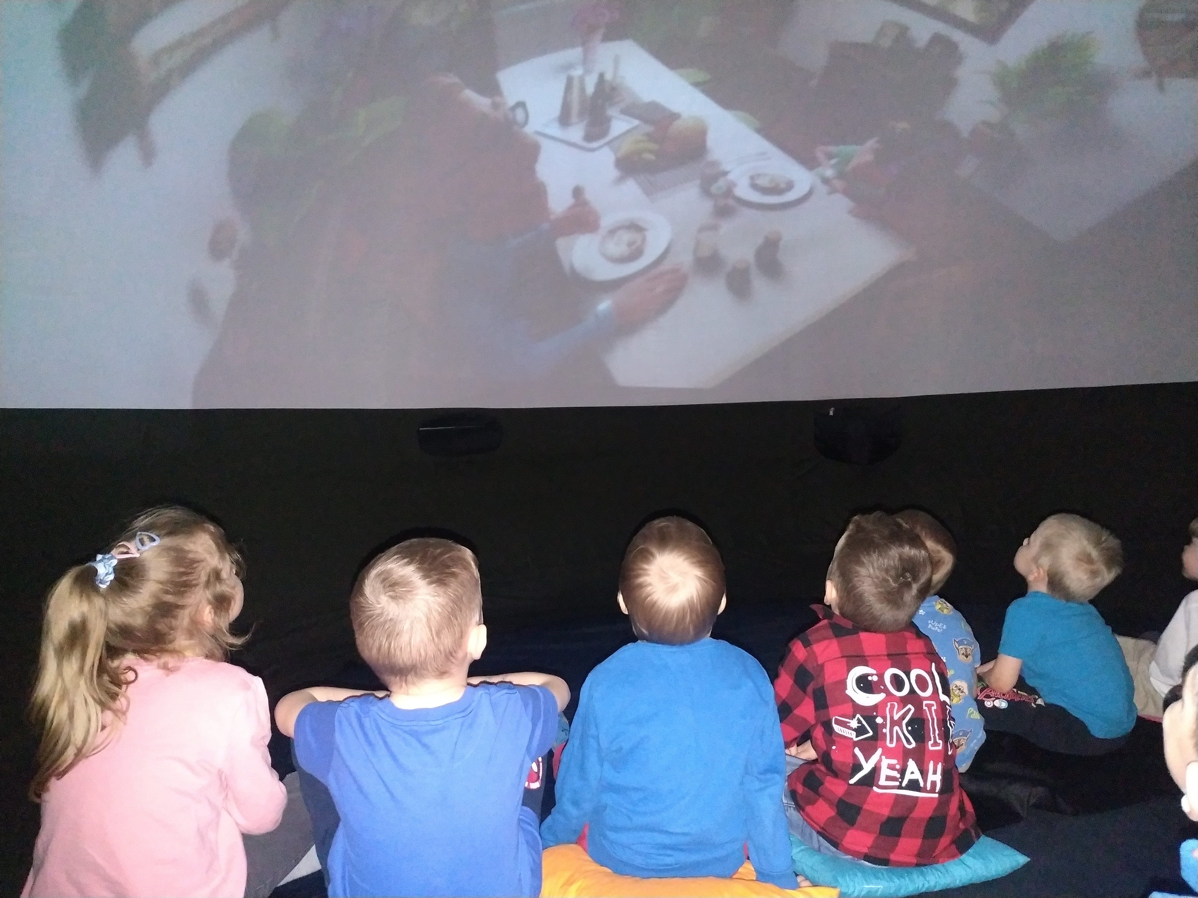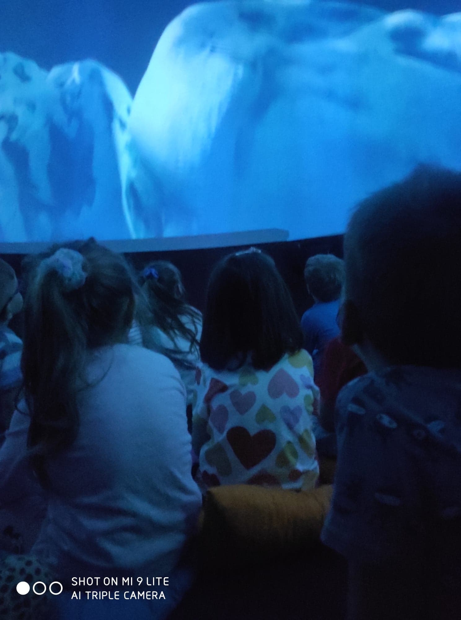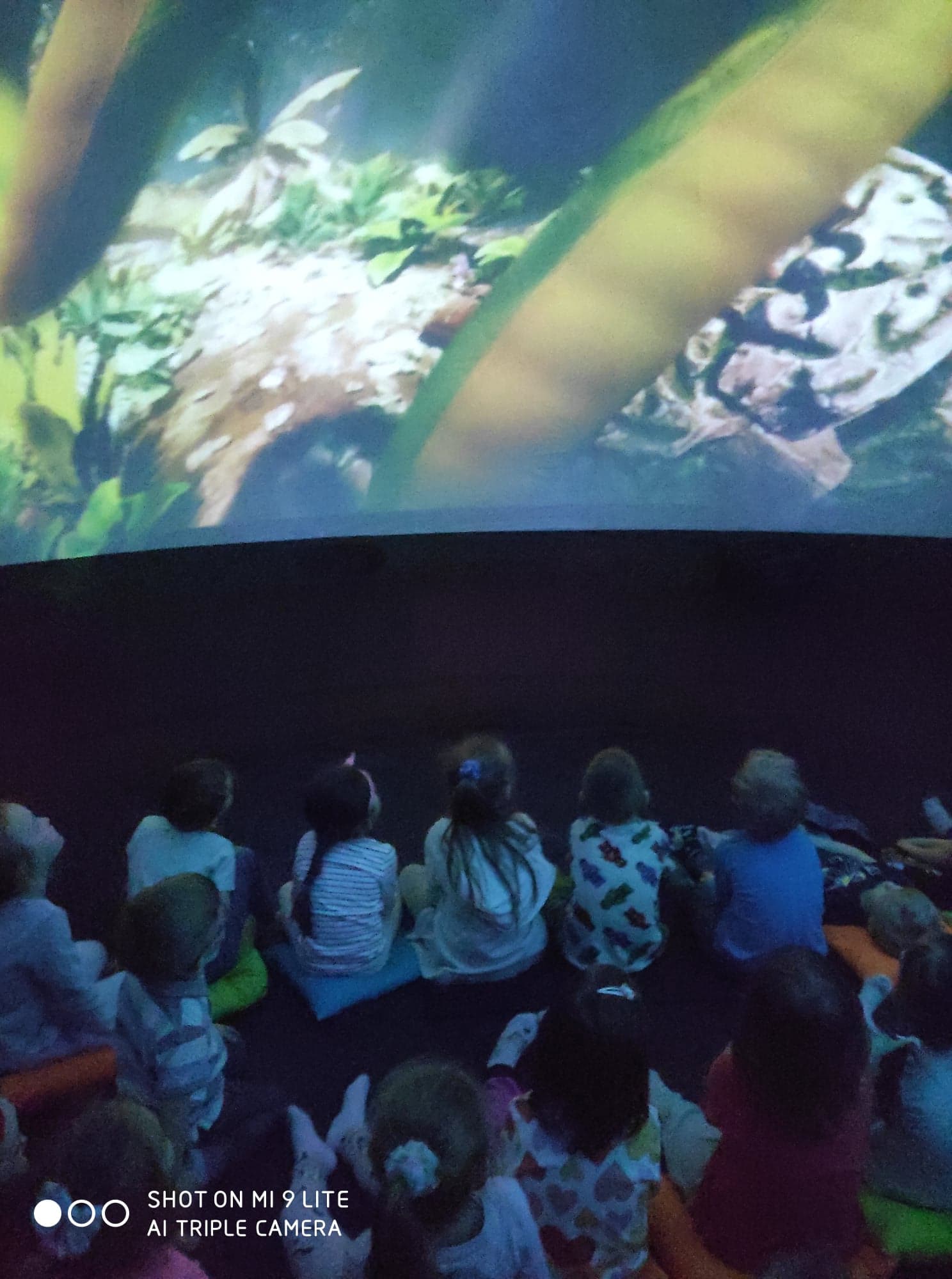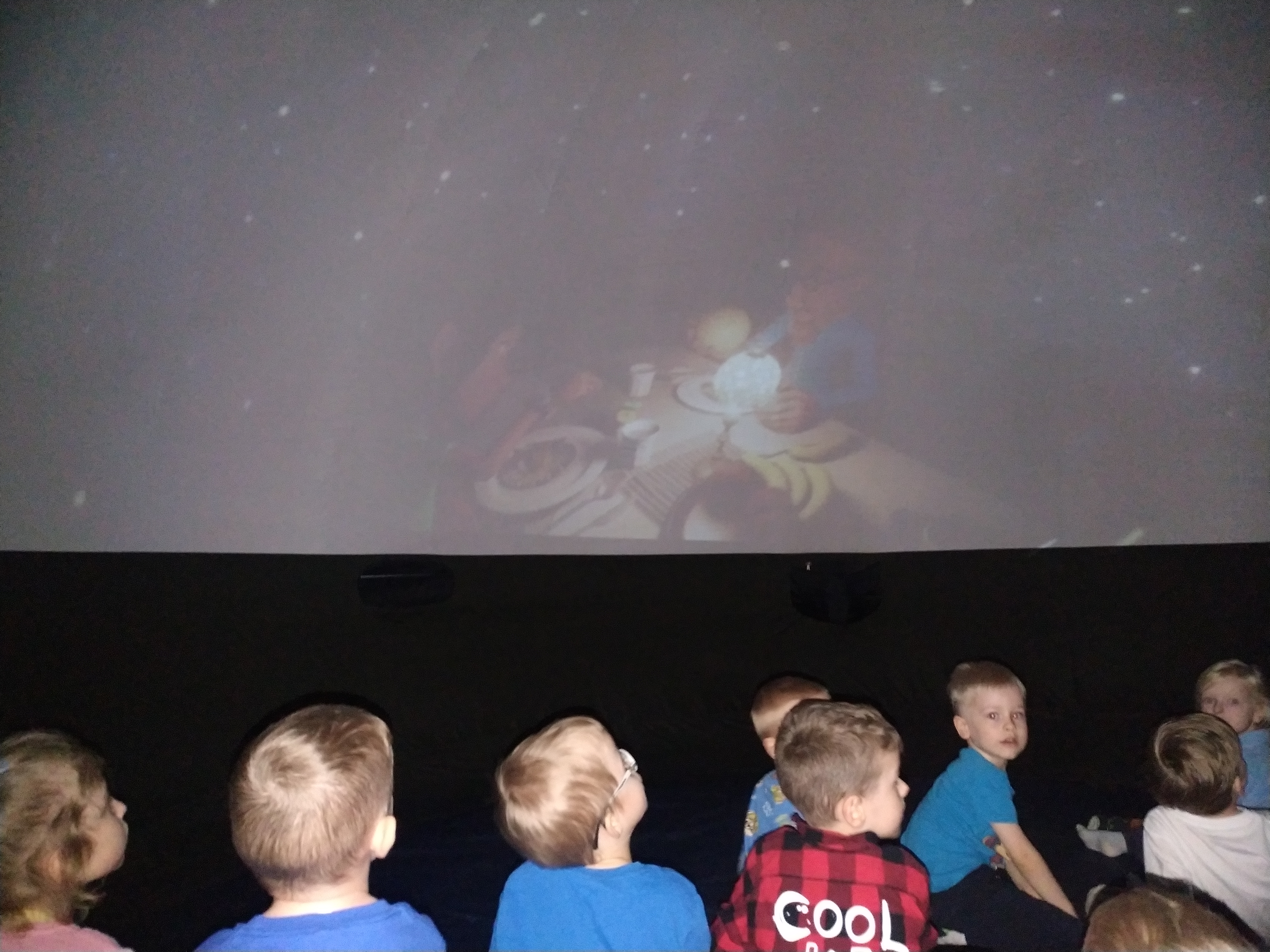 21.04.2022 r. przedszkolaki wzięły udział w niezwykłej lekcji astronomii. Był to seans w planetarium pt: „Zaczarowany globus“. Film opowiada historię małej Mii, która podczas wakacji u dziadka odkrywa na strychu tajemniczą machinę astronomiczną. Edek, Ekscentryczny wujek dziewczynki, podstępnie zmusza ją do wykorzystania sekretnych mocy urządzenia i zmiany pór roku na Ziemii. Bystra dziewczynka szybko orientuje się w potencjalnych konsekwencjach, jednak Edek nie chce odpuścić realizacji swojego niecnego planu. Historia opowiedziana w filmie pomaga dzieciom budować wiedzę przyrodniczą i pozwala im poznać fakty naukowe, m.in. takie jak to, że: Ziemia kręci się wokół własnej osi, a Słońce oświetla ją z jednej strony tworząc dzień i noc; rok jest podzielony na cztery pory roku, ale pogoda nie zawsze współgra z tym podziałem; zwierzęta i rośliny przystosowały się do zmian spowodowanych porami roku i nie mogą bez nich istnieć. Z pewnością tak przekazane dzieciom informacje umożliwią im budowanie wiedzy o otaczającym je świecie.