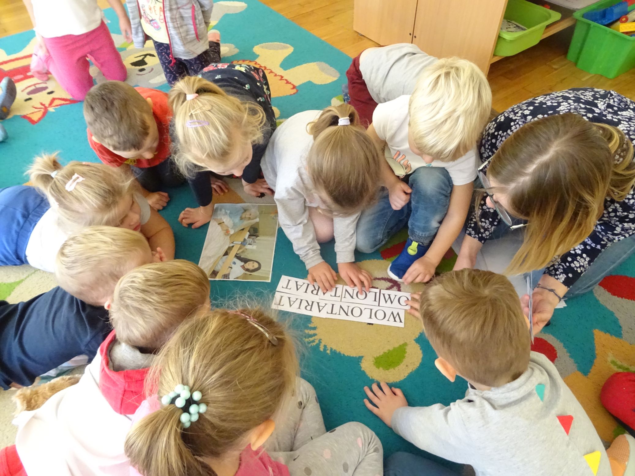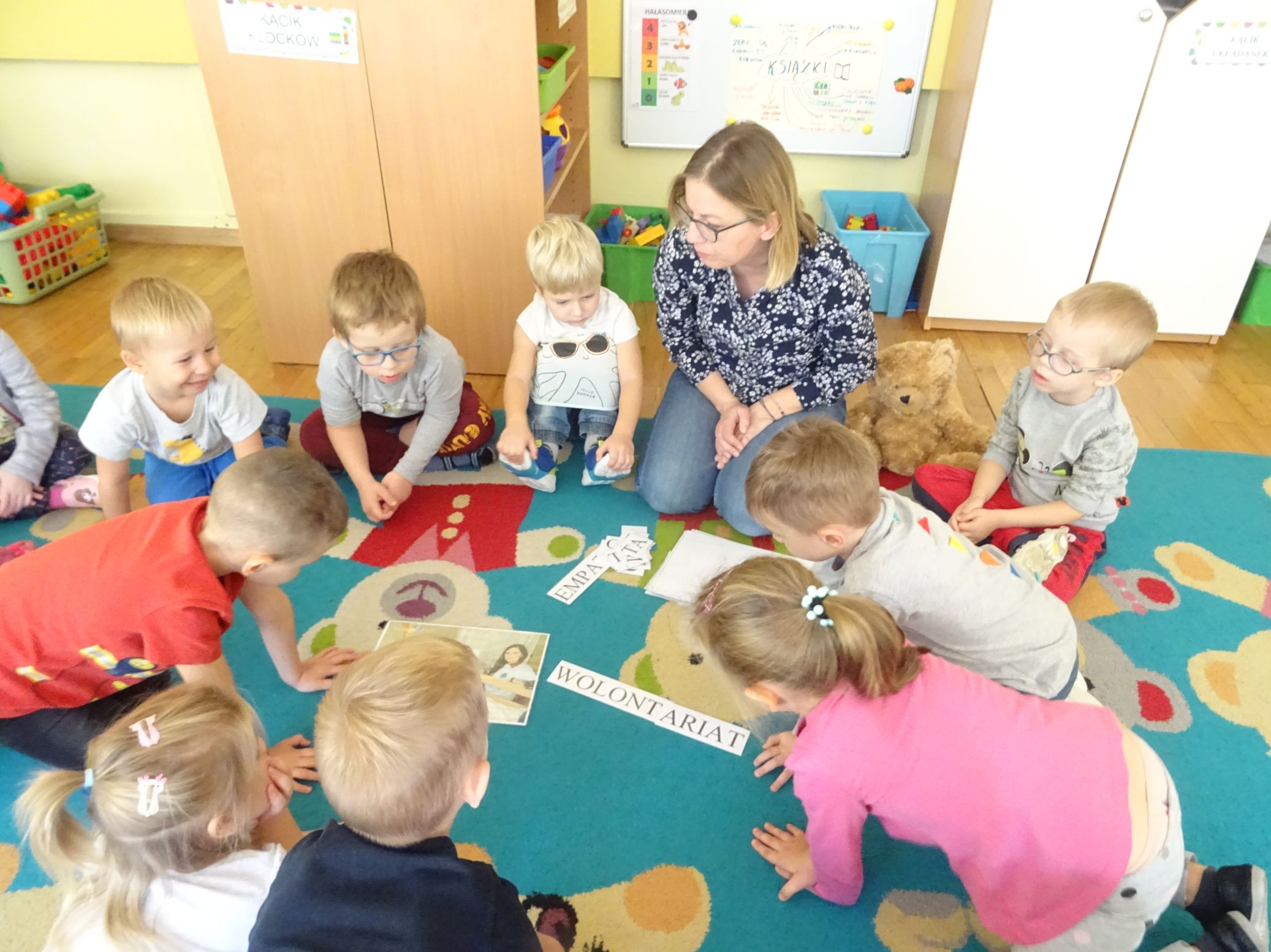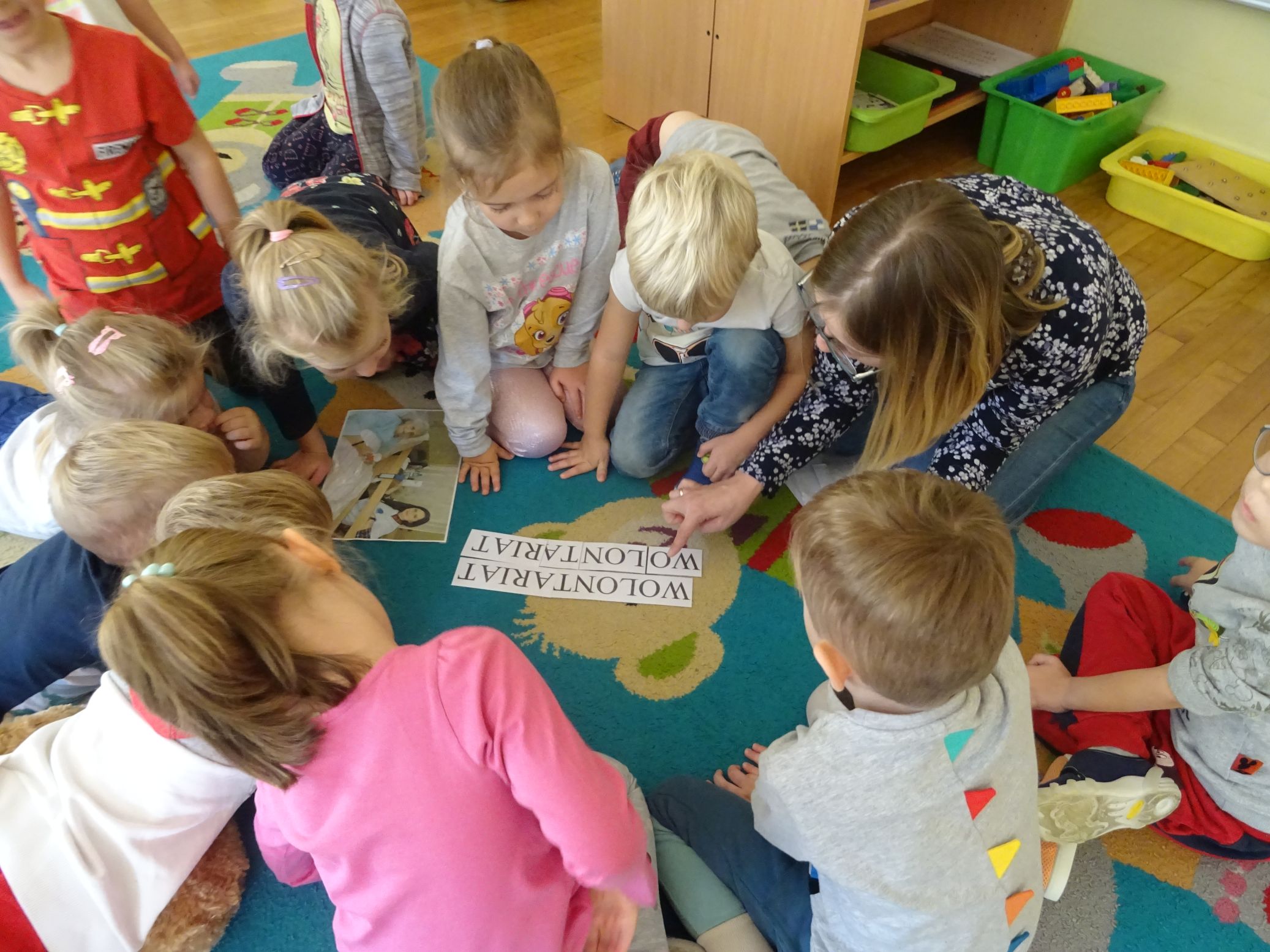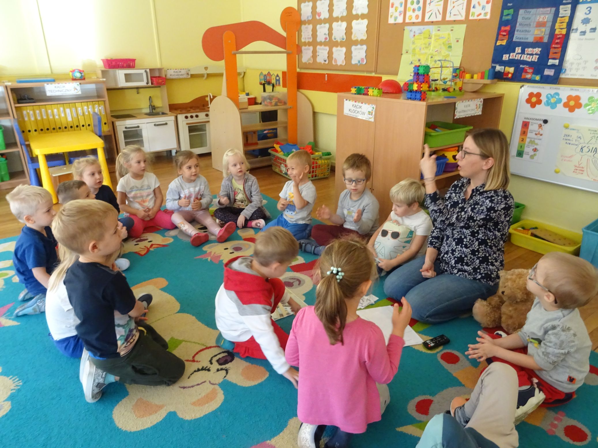 Przedszkolaki z grupy „Misie“ uczestniczą kolejny raz w projekcie promującym czytelnictwo „Mały Miś w świecie wielkiej literatury“. Poszerzają swoją wiedzę o książkach, poznają różne rodzaje książek, a przede wszystkim wraz z postacią Misia-Pysia uczestniczą w spotkaniach z literaturą dziecięcą. Podczas jednego z takich zajęć wysłuchały opowiadania Agnieszki Pudło w formie audiobooka „Mama jest wolontariuszką. Opowiadanie o empatii.“ z publikacji „Antek, Kornelka i ważne sprawy“. Poznały nowe słowa „wolontariat“ i „empatia“, sprawnie dokonały podziału nowych słów na sylaby i podjęły próbę ułożenia ich z rozsypanki sylabowej. Opowiadanie stało się punktem wyjścia do rozmowy na temat tego, w jaki sposób przedszkolaki mogą pomagać. W ramach podsumowania działań „Misie“ wzięły udział w konkursie literacko-plastycznym, na szablonie ręki narysowały sposoby pomagania innym. Celem zajęć było przede wszystkim kształtowanie właściwych postaw szlachetności, zaangażowania społecznego, kształtowanie postaw prospołecznych: pobudzanie wrażliwości oraz gotowości do służenia pomocą innym, zainteresowanie literaturą, rozwijanie mowy oraz rozwijanie wyobraźni i poszerzanie doświadczeń plastycznych.
