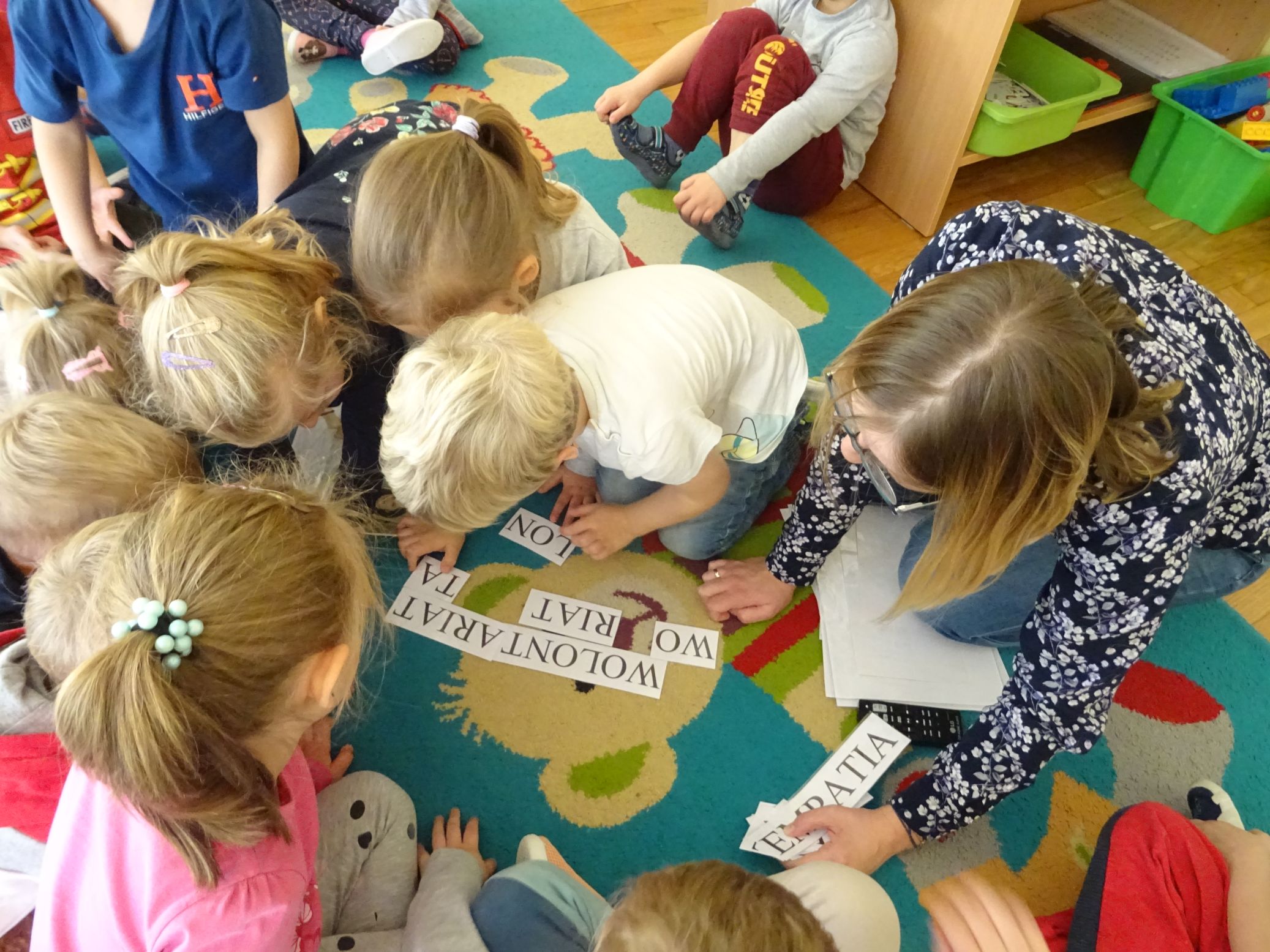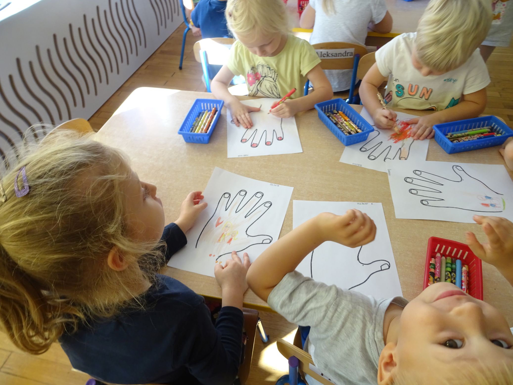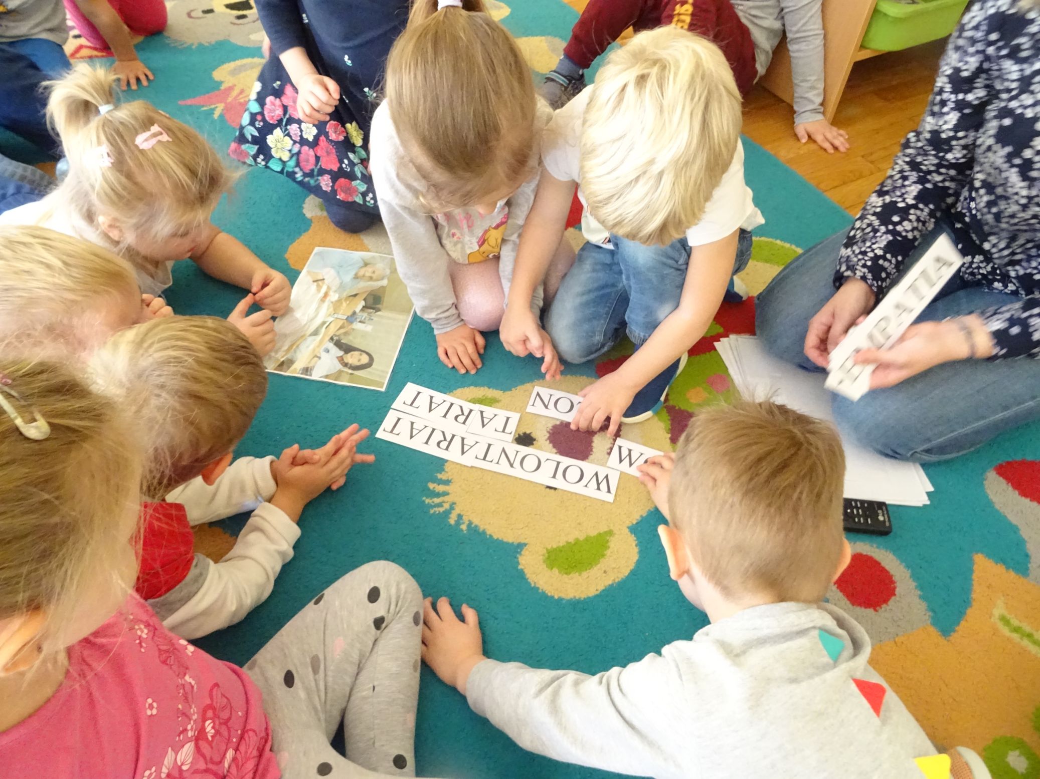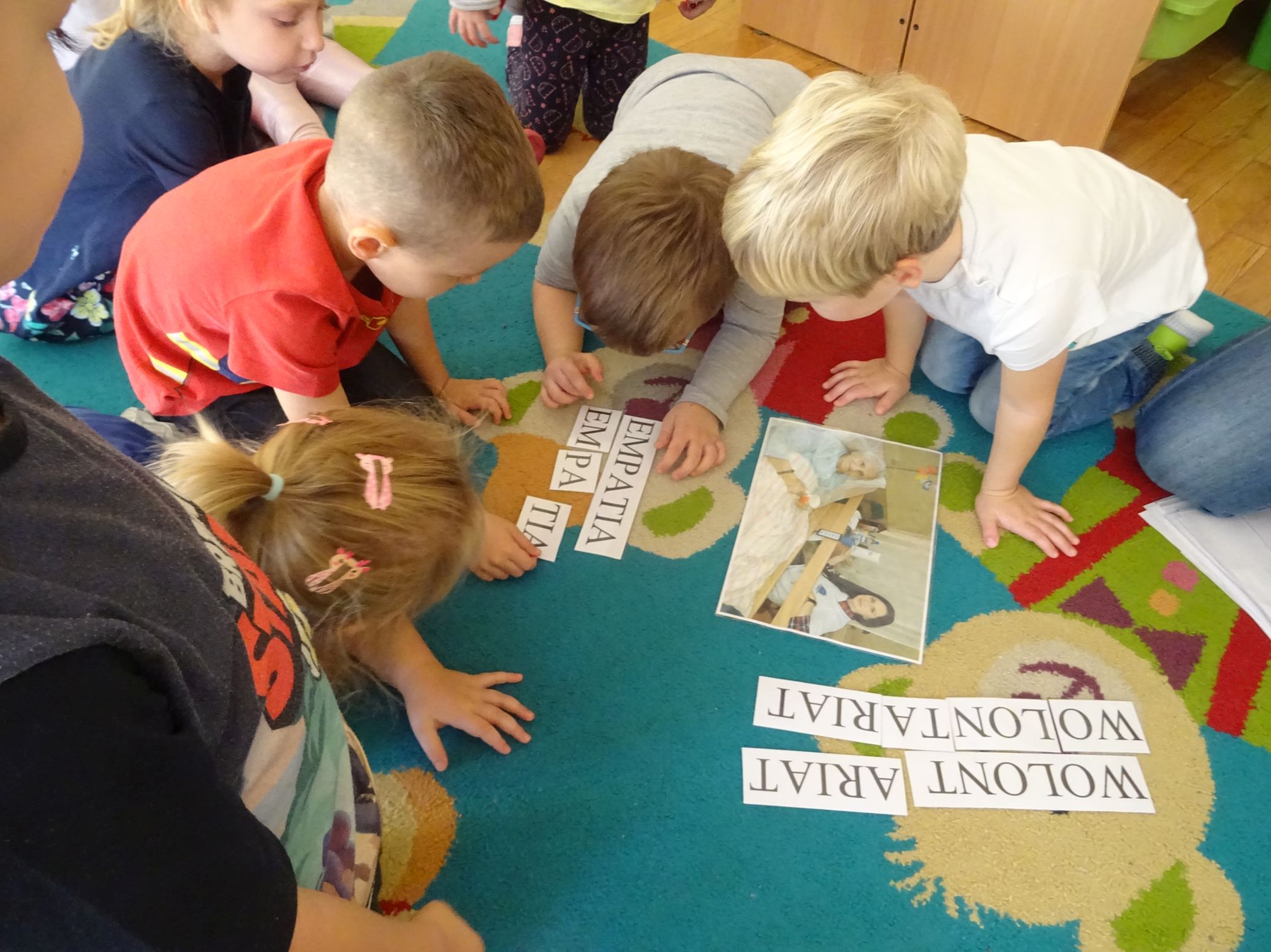Przedszkolaki z grupy „Misie“ uczestniczą kolejny raz w projekcie promującym czytelnictwo „Mały Miś w świecie wielkiej literatury“. Poszerzają swoją wiedzę o książkach, poznają różne rodzaje książek, a przede wszystkim wraz z postacią Misia-Pysia uczestniczą w spotkaniach z literaturą dziecięcą. Podczas jednego z takich zajęć wysłuchały opowiadania Agnieszki Pudło w formie audiobooka „Mama jest wolontariuszką. Opowiadanie o empatii.“ z publikacji „Antek, Kornelka i ważne sprawy“. Poznały nowe słowa „wolontariat“ i „empatia“, sprawnie dokonały podziału nowych słów na sylaby i podjęły próbę ułożenia ich z rozsypanki sylabowej. Opowiadanie stało się punktem wyjścia do rozmowy na temat tego, w jaki sposób przedszkolaki mogą pomagać. W ramach podsumowania działań „Misie“ wzięły udział w konkursie literacko-plastycznym, na szablonie ręki narysowały sposoby pomagania innym. Celem zajęć było przede wszystkim kształtowanie właściwych postaw szlachetności, zaangażowania społecznego, kształtowanie postaw prospołecznych: pobudzanie wrażliwości oraz gotowości do służenia pomocą innym, zainteresowanie literaturą, rozwijanie mowy oraz rozwijanie wyobraźni i poszerzanie doświadczeń plastycznych.