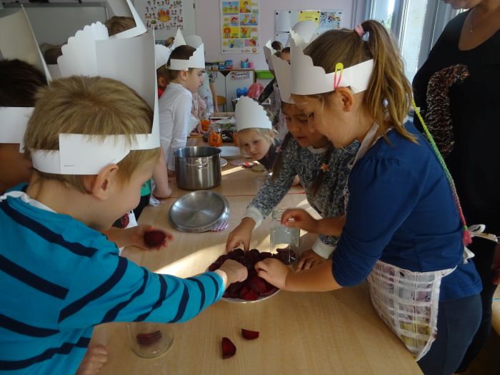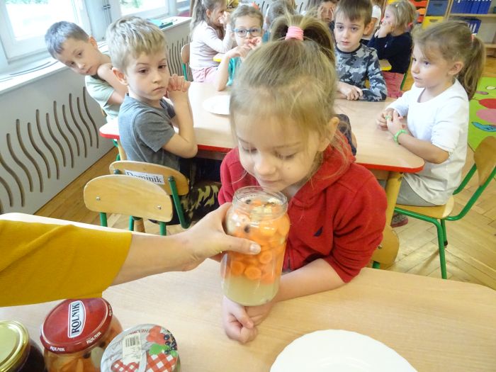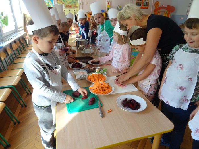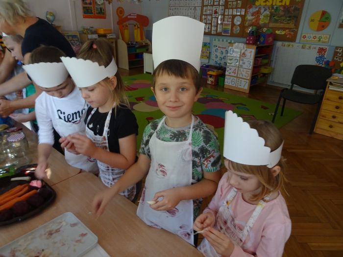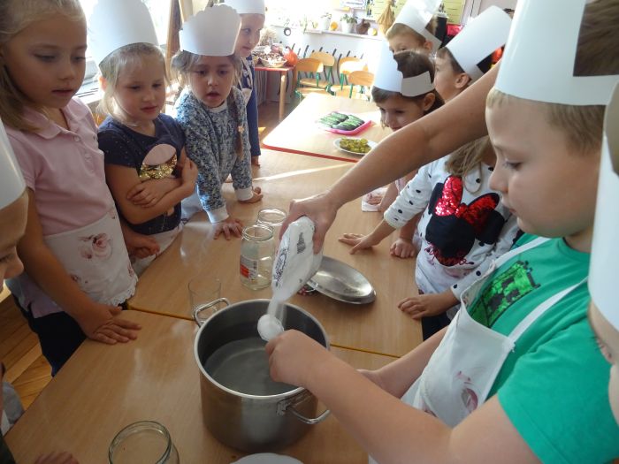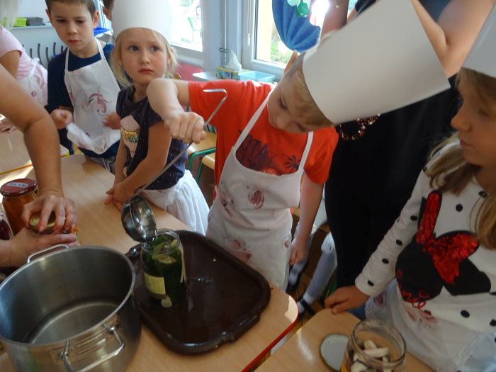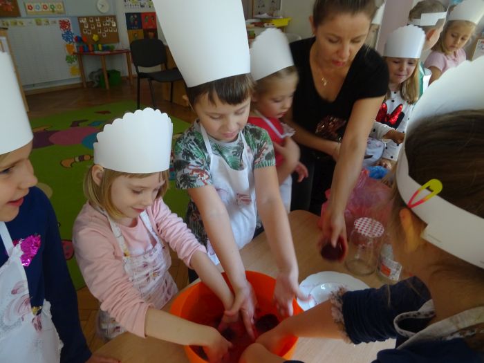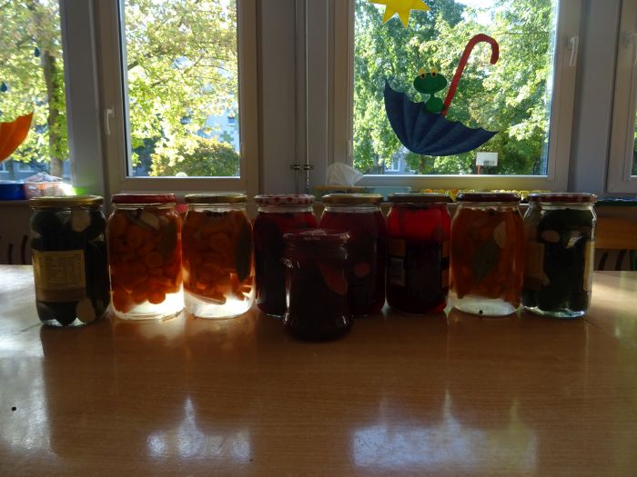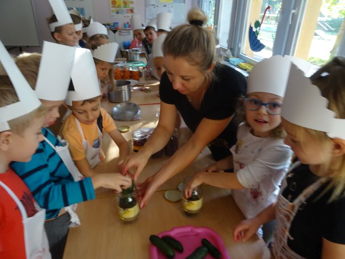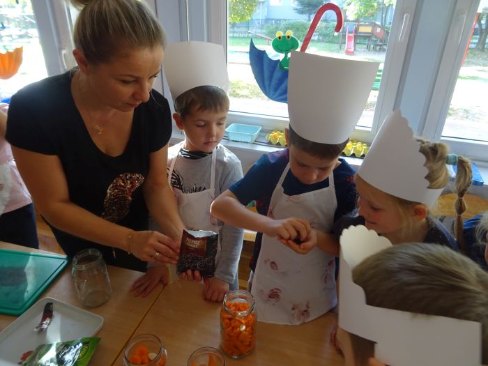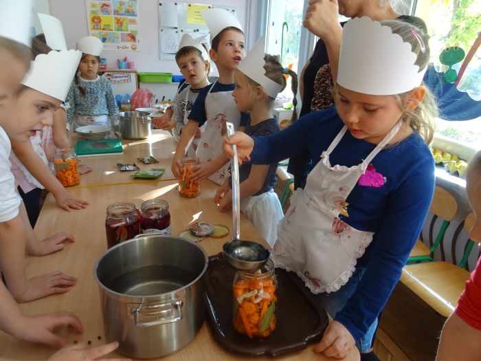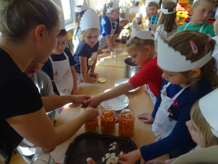 Dzieci w grupie ,,Motylki” realizując temat kompleksowy ,,Jak jesienią dbać o zdrowie?” wyjaśniały dlaczego warzywa i owoce są ważne dla zachowania zdrowia i odporności oraz uczestniczyły w zajęciach praktycznych pt. ,,Robimy przetwory”. ,,Motylki” zapoznały się z poszczególnymi etapami domowej produkcji kiszonek. Po założeniu odpowiedniego stroju i dokładnym umyciu rąk przedszkolaki zabrały się ochoczo do pracy. I etapem pracy było posegregowanie warzyw, przeliczenie i umieszczenie przy odpowiednim stanowisku. Dzieci z zaangażowaniem obierały buraki, marchewkę, czosnek, myły a następnie kroiły warzywa pod czujnym okiem pań. Tak przygotowane warzywa przedszkolaki umieściły w wyparzonych wcześniej słoikach. Okazją do przeliczania składników było dokładanie kolejno chrzanu, liści laurowych, pieprzu w ziarenkach, ziela angielskiego, pokrojonego czosnku. Kolejnym etapem było przygotowanie roztworu soli i przegotowanej, przestudzonej wody, odmierzanie odpowiedniej ilości wody i zalewanie nią wypełnionych słoików. Tak wykonane kiszonki znalazły miejsce w naszej sali w kąciku, gdzie dzieci mogły obserwować zmieniający się kolor kiszonek. Po upływie kilku dni ,,Motylki” degustowały swoje własnoręcznie wykonane jesienne kiszonki pobudzając swoje kubki smakowe, a przede wszystkim ciesząc się z dobrze wykonanej pracy zespołowej.