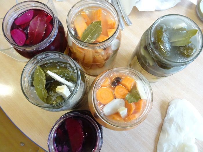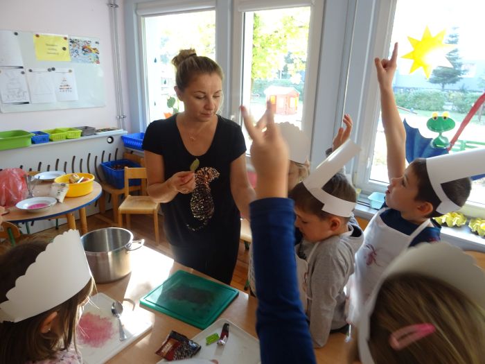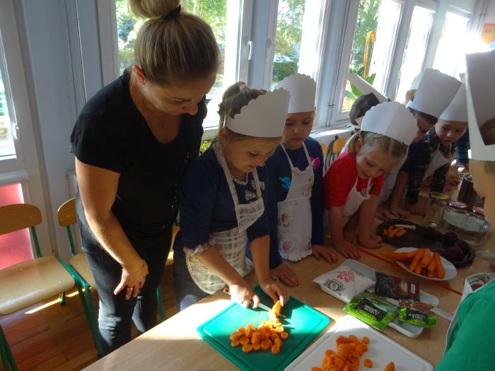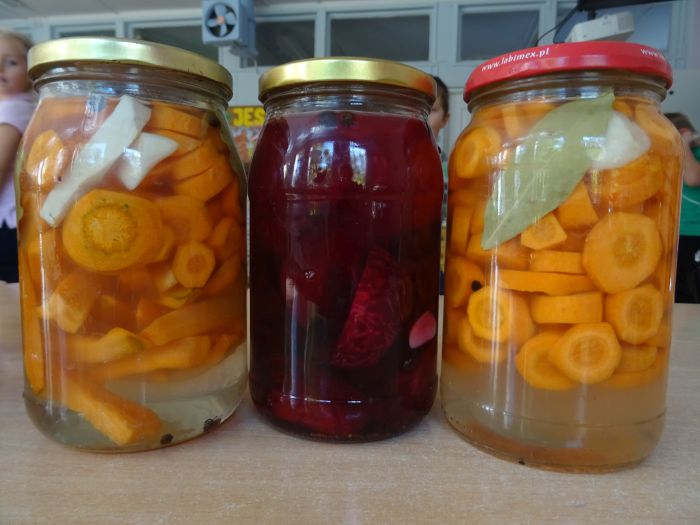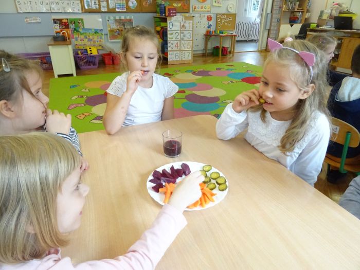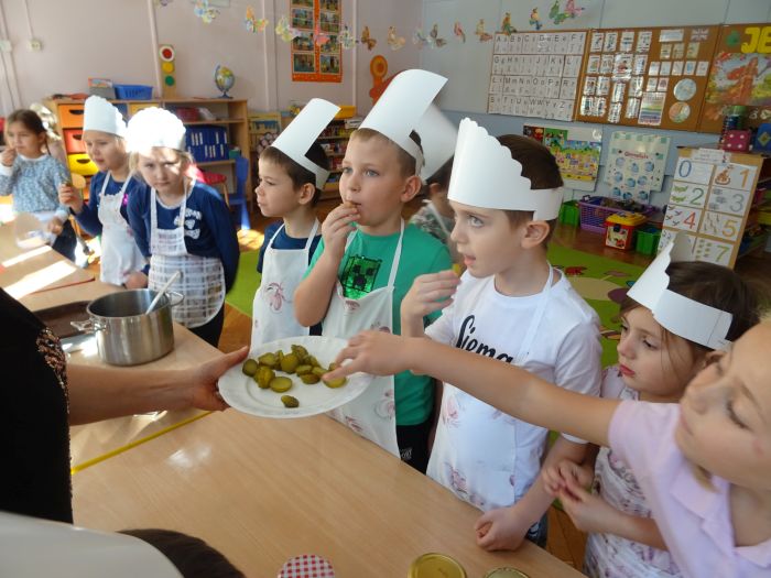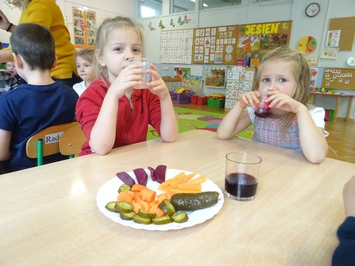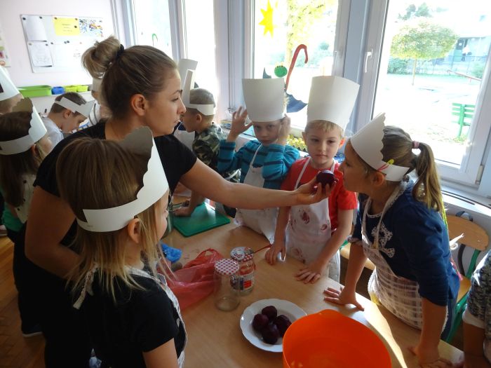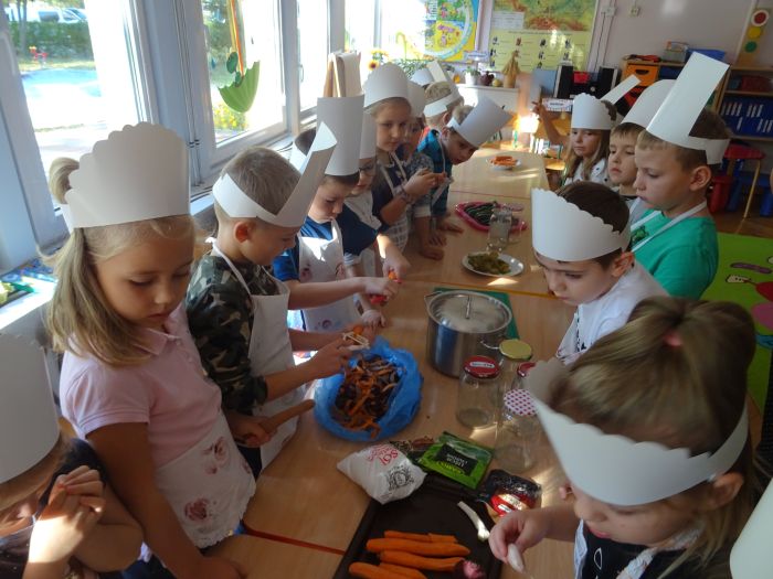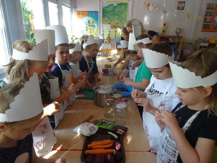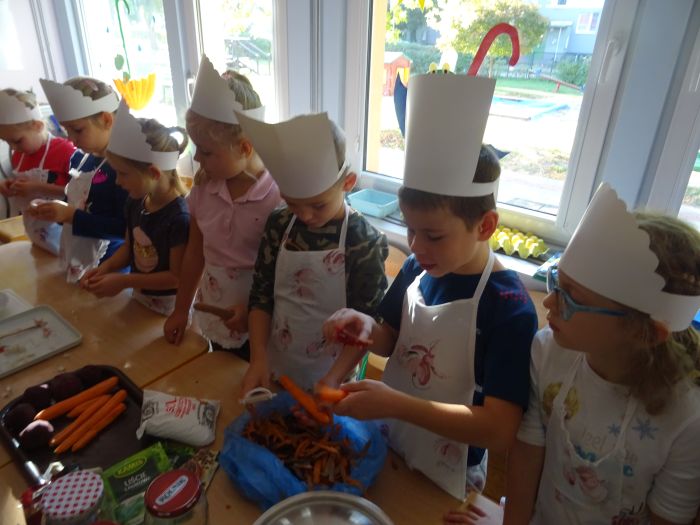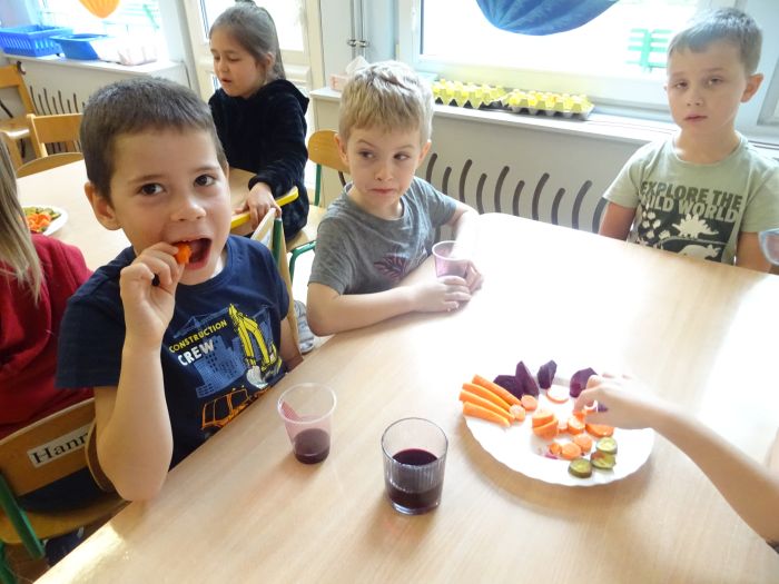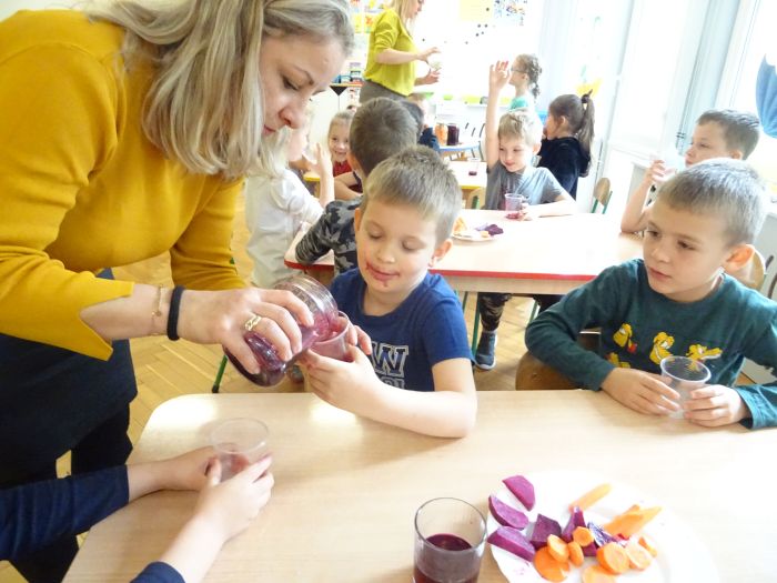 Dzieci w grupie ,,Motylki” realizując temat kompleksowy ,,Jak jesienią dbać o zdrowie?” wyjaśniały dlaczego warzywa i owoce są ważne dla zachowania zdrowia i odporności oraz uczestniczyły w zajęciach praktycznych pt. ,,Robimy przetwory”. ,,Motylki” zapoznały się z poszczególnymi etapami domowej produkcji kiszonek. Po założeniu odpowiedniego stroju i dokładnym umyciu rąk przedszkolaki zabrały się ochoczo do pracy. I etapem pracy było posegregowanie warzyw, przeliczenie i umieszczenie przy odpowiednim stanowisku. Dzieci z zaangażowaniem obierały buraki, marchewkę, czosnek, myły a następnie kroiły warzywa pod czujnym okiem pań. Tak przygotowane warzywa przedszkolaki umieściły w wyparzonych wcześniej słoikach. Okazją do przeliczania składników było dokładanie kolejno chrzanu, liści laurowych, pieprzu w ziarenkach, ziela angielskiego, pokrojonego czosnku. Kolejnym etapem było przygotowanie roztworu soli i przegotowanej, przestudzonej wody, odmierzanie odpowiedniej ilości wody i zalewanie nią wypełnionych słoików. Tak wykonane kiszonki znalazły miejsce w naszej sali w kąciku, gdzie dzieci mogły obserwować zmieniający się kolor kiszonek. Po upływie kilku dni ,,Motylki” degustowały swoje własnoręcznie wykonane jesienne kiszonki pobudzając swoje kubki smakowe, a przede wszystkim ciesząc się z dobrze wykonanej pracy zespołowej.