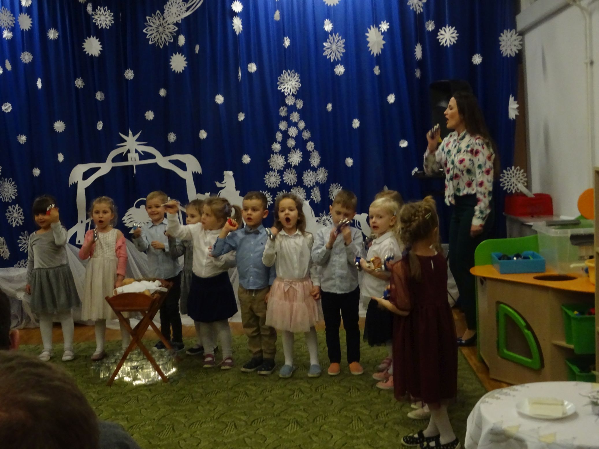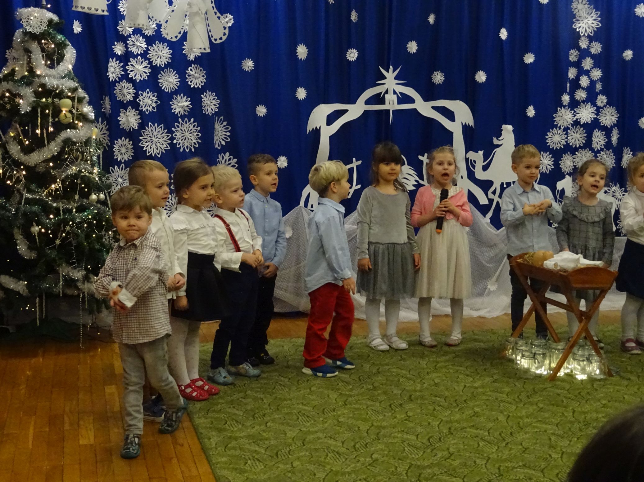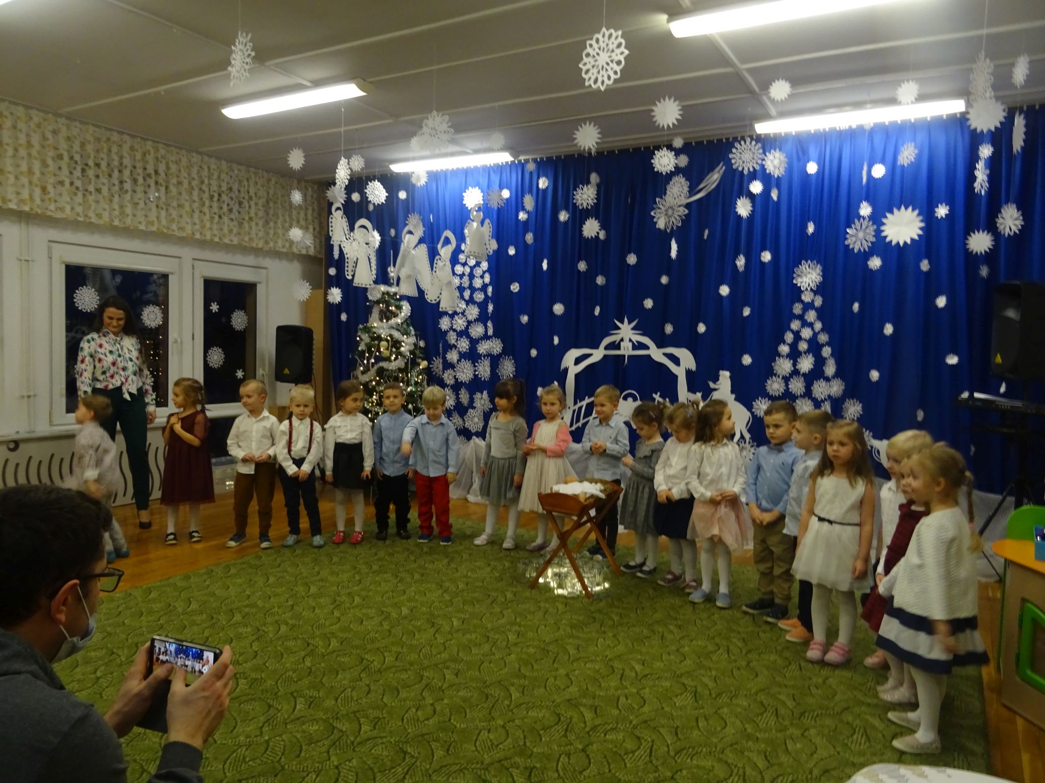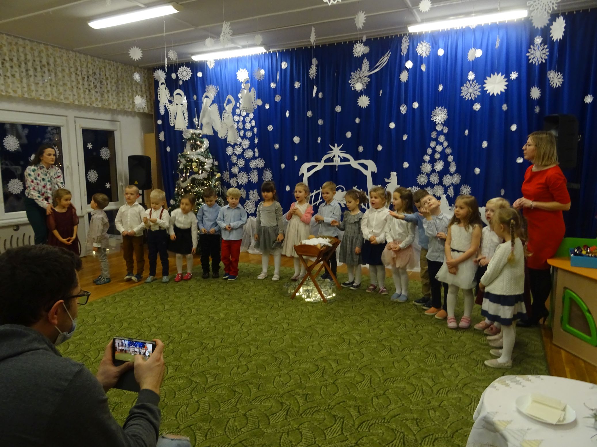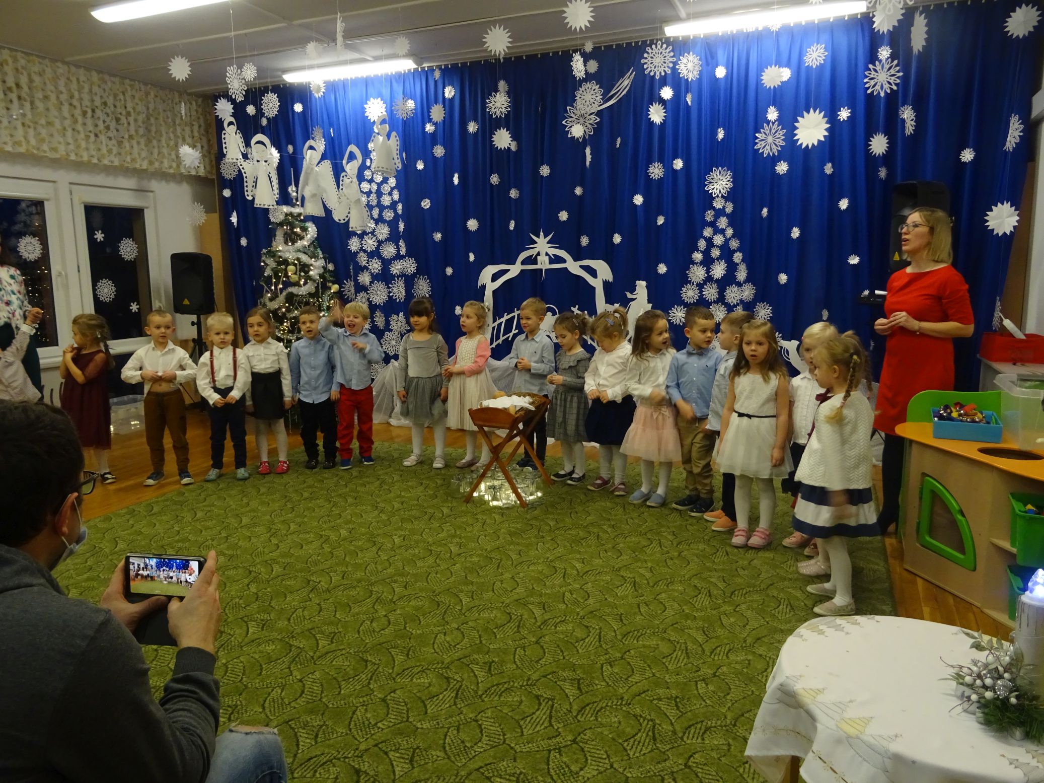 18.01.2022 r. odbyło się spotkanie świąteczne, na które przedszkolaki z grupy „Misie“ zaprosiły swoich rodziców. Przedszkolaki zaprezentowały swoje umiejętności, przedstawiły inscenizację o tradycjach i obrzędach świątecznych. Ukazały najważniejsze zwyczaje takie jak: przygotowania potraw wigilijnych, ubierania choinki, łamanie się opłatkiem, składanie sobie życzeń, pozostawienie wolnego miejsca przy stole dla gościa niespodziewanego oraz śpiewanie kolęd. „Misie“ zaśpiewały też piosenki, zatańczyły taniec z lampionami i zagrały na instrumentach. Dziękujemy wszystkim rodzicom za pomoc w przygotowaniu dzieci do występu i za obecność.
