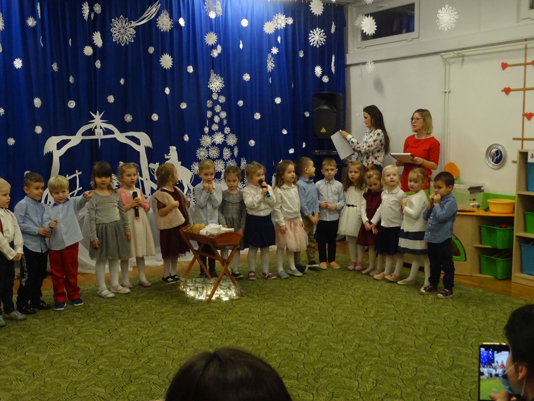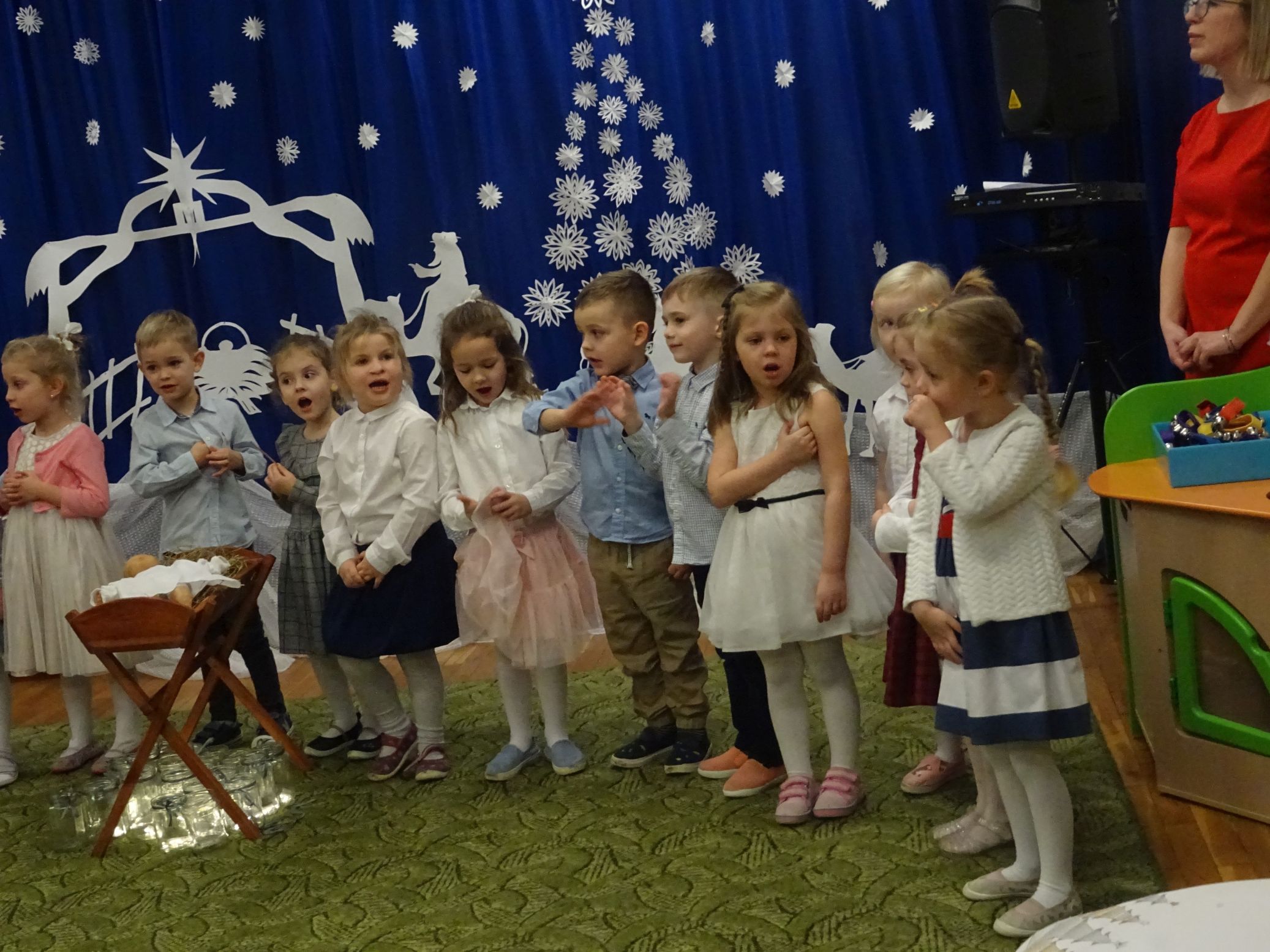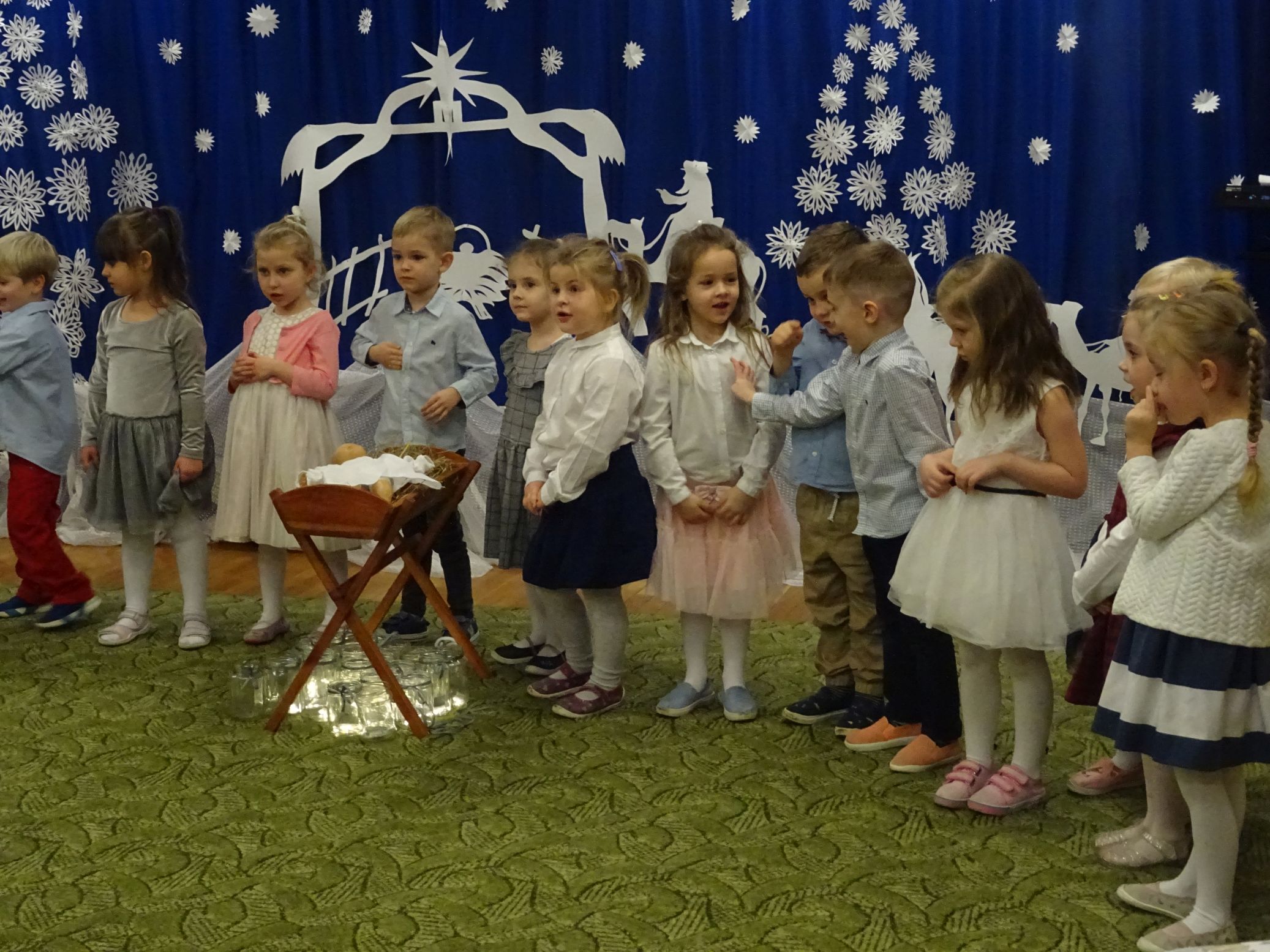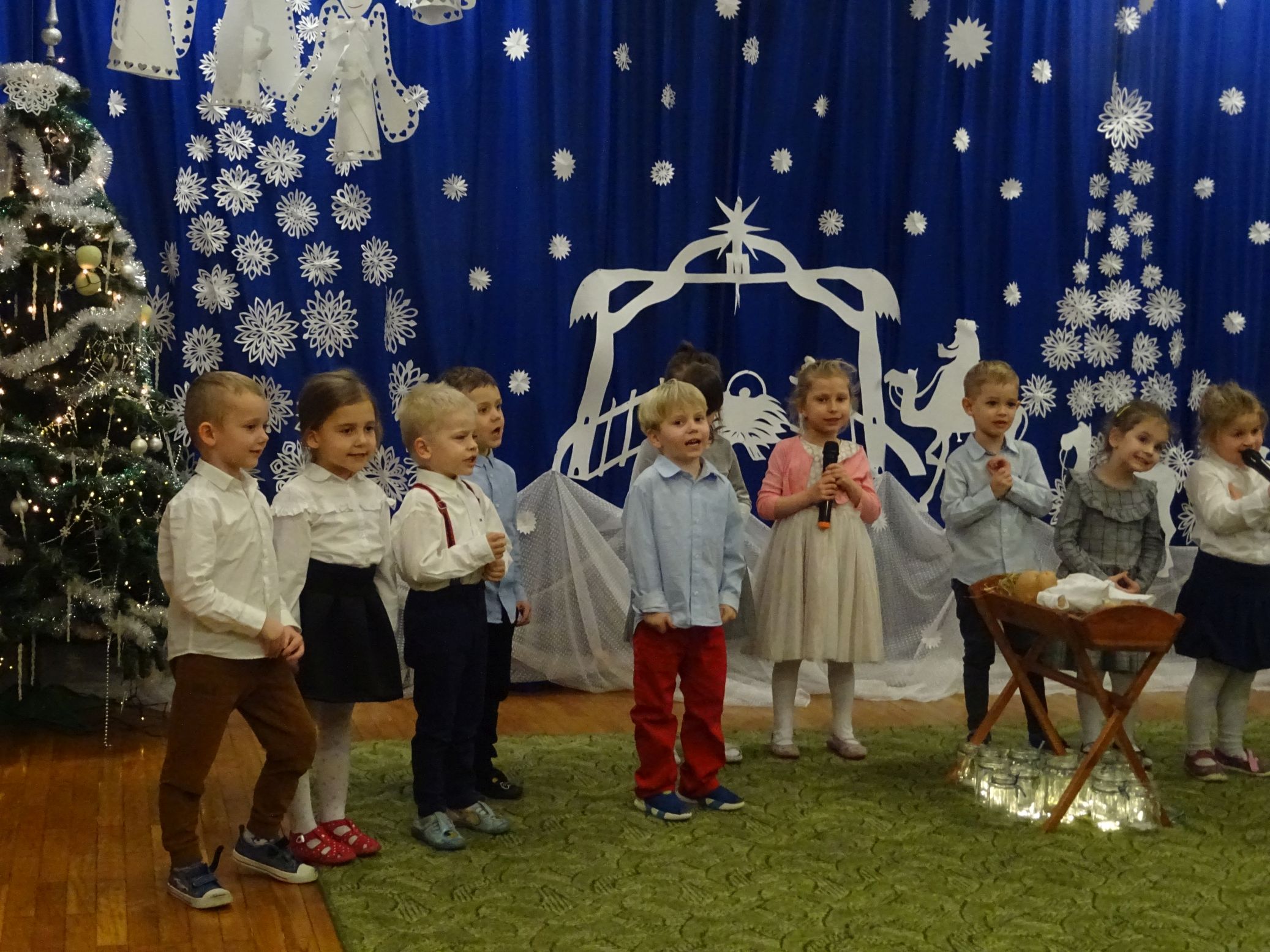 18.01.2022 r. odbyło się spotkanie świąteczne, na które przedszkolaki z grupy „Misie“ zaprosiły swoich rodziców. Przedszkolaki zaprezentowały swoje umiejętności, przedstawiły inscenizację o tradycjach i obrzędach świątecznych. Ukazały najważniejsze zwyczaje takie jak: przygotowania potraw wigilijnych, ubierania choinki, łamanie się opłatkiem, składanie sobie życzeń, pozostawienie wolnego miejsca przy stole dla gościa niespodziewanego oraz śpiewanie kolęd. „Misie“ zaśpiewały też piosenki, zatańczyły taniec z lampionami i zagrały na instrumentach. Dziękujemy wszystkim rodzicom za pomoc w przygotowaniu dzieci do występu i za obecność.
