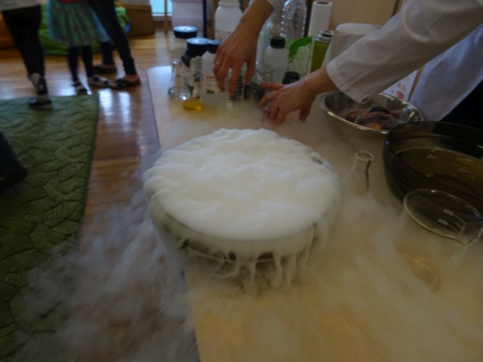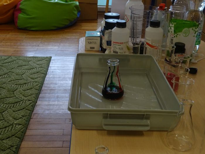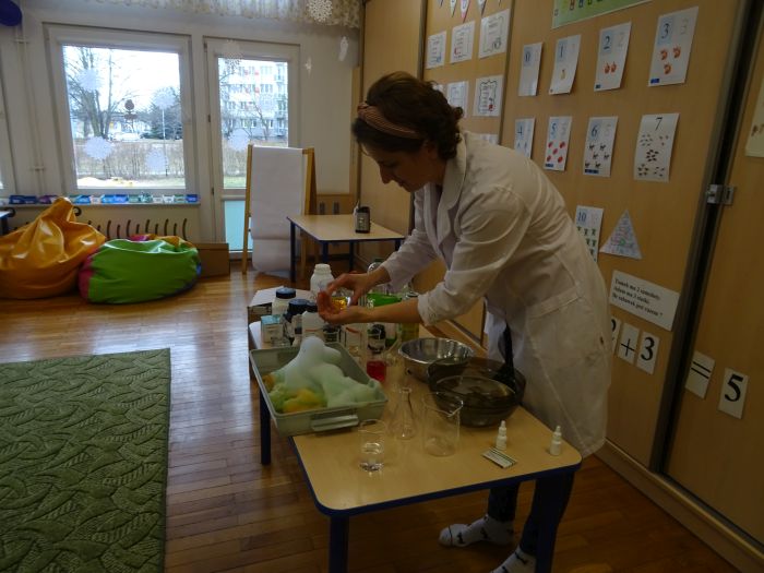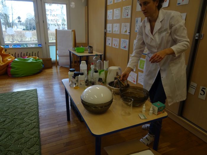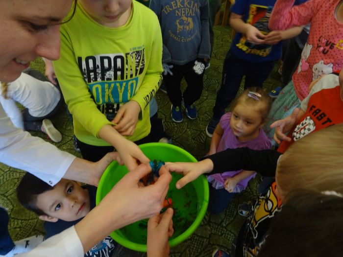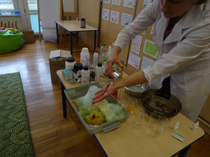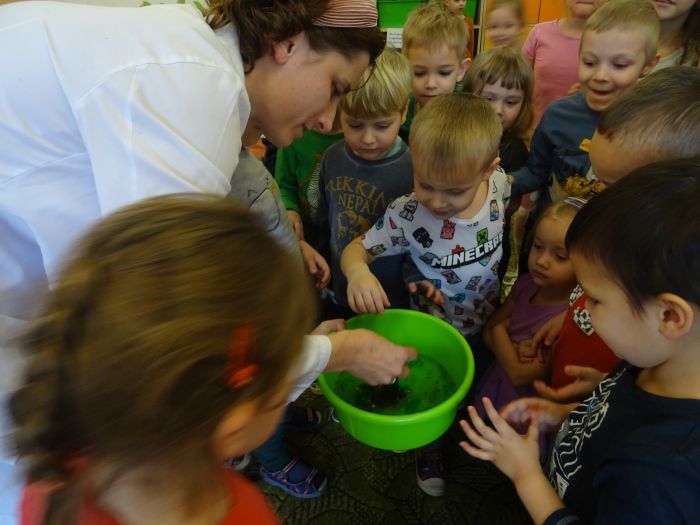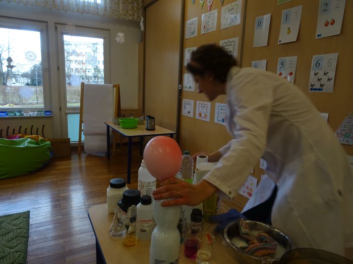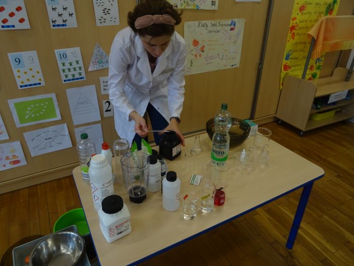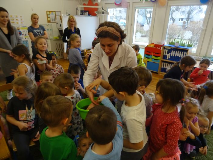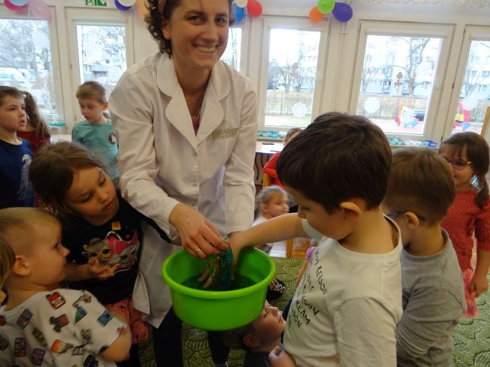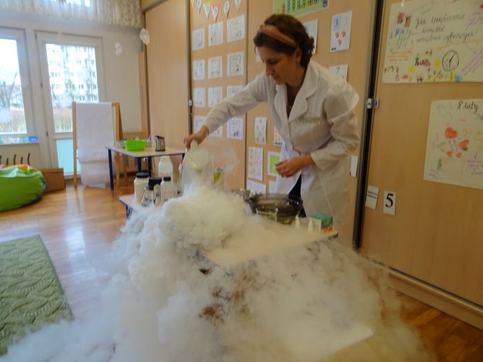 W piątek 18 lutego w naszym przedszkolu odbyły się pokazy chemiczne zorganizowane przez chemika Panią Agnieszkę Babiracką. Podczas pokazu dzieci zapoznały się z procesami chemicznymi. Zaciekawione dzieci obserwowały zmiany pH roztworów, zmiany barwy roztworów i poznały reakcję sublimacji suchego lodu. Dzieci mogły zobaczyć i dotknąć "kolorowe glony", które powstały w wyniku żelowania dwóch roztworów. Przedszkolaki miały możliwość prowadzenia obserwacji reakcji utleniania i redukcji. Największe wrażenie na dzieciach zrobiła kolorowa erupcja wulkanu oraz spalanie oparów substancji łatwopalnych. Dzieci aktywnie uczestniczyły w pokazach i przestrzegały ustalonych zasad. Dziękujemy za bardzo ciekawy pokaz i już czekamy na kolejne.