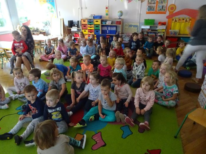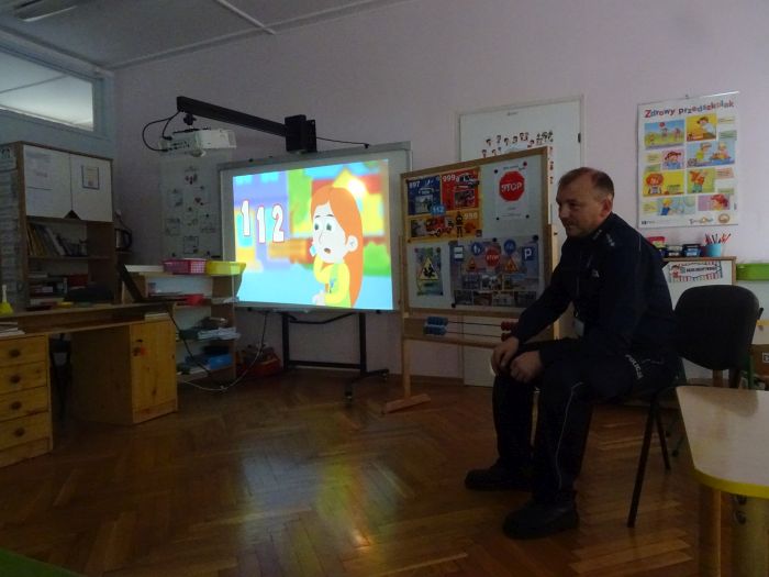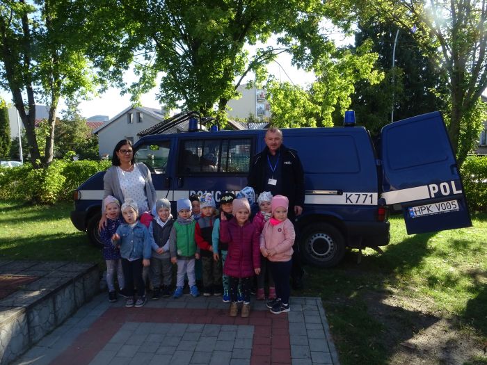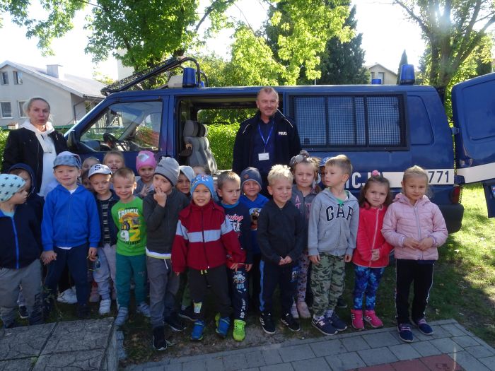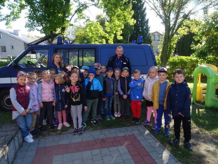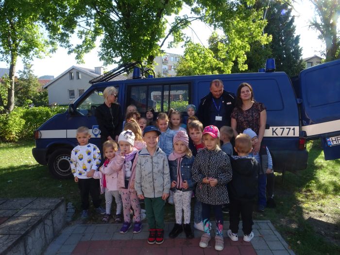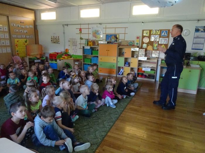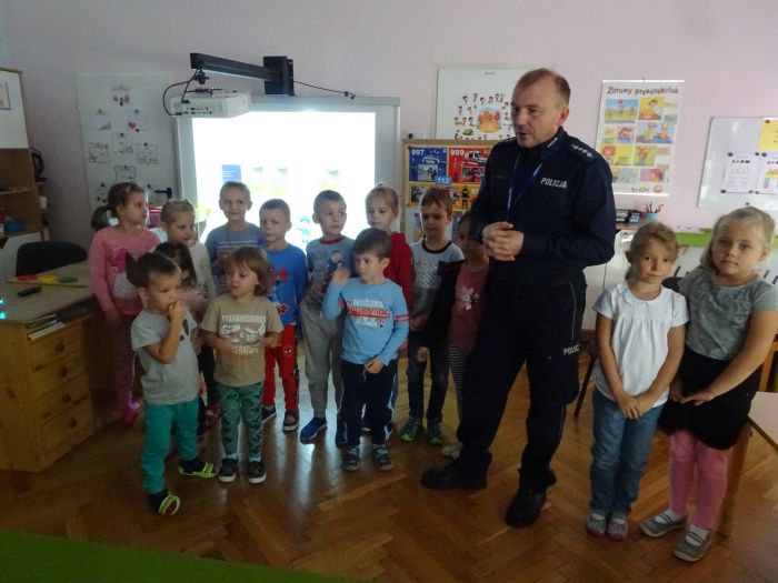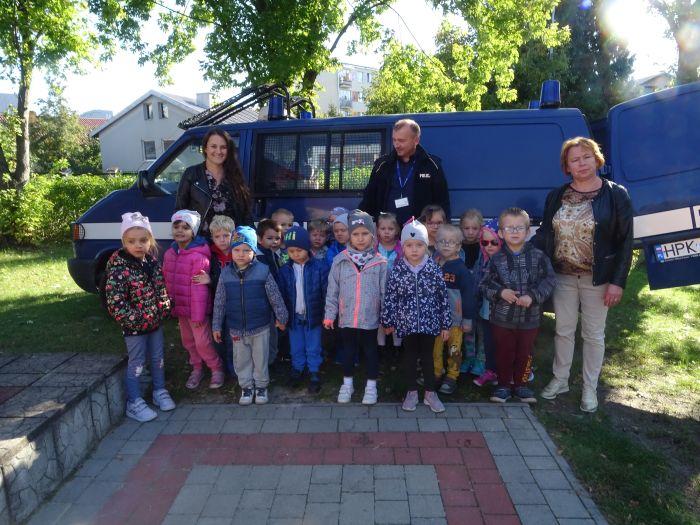 W dniu 28.09.2021 r. w naszym przedszkolu odbyło się spotkanie z Panem Policjantem z Komendy Powiatowej Policji w Stalowej Woli. Tematem spotkania było utrwalenie z dziećmi zasad ruchu drogowego oraz przypomnienie zagadnień dotyczących bezpieczeństwa dzieci w przedszkolu i w domu. Pan policjant, w formie praktycznej, przypomniał podstawowe zasady zachowania się podczas przechodzenia przez jezdnię. Następnie wytłumaczył jak należy zachować się w kontaktach z obcymi ludźmi, jak dbać o bezpieczeństwo własne i innych oraz do kogo zwracać się o pomoc w sytuacji zagrożenia. Dzieci z dużym zainteresowaniem słuchały rad i wskazówek zaproszonego gościa. Na zakończenie wizyty przedszkolaki wręczyły panu policjantowi podziękowanie.