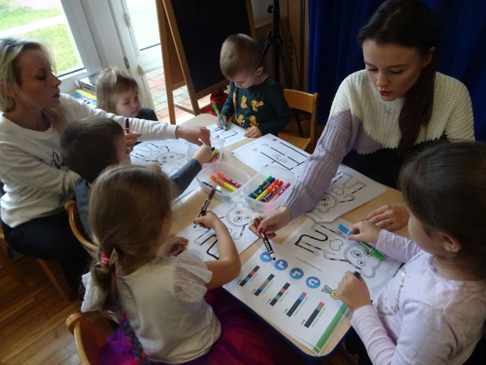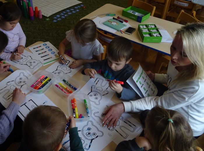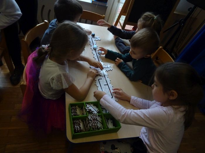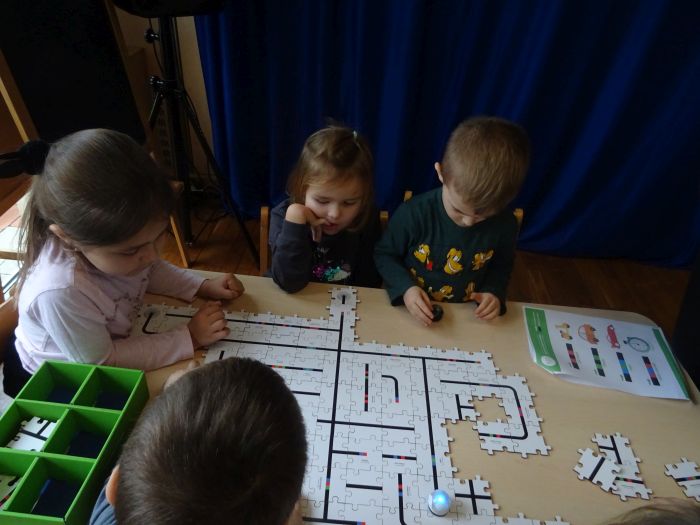 W listopadzie, dzieci z grupy „Motylki“ i „Zajączki“ miały okazję uczyć się programować. Dzieci poznawały zasady programowania, ucząc się kodować trasę dla ozobotów. Dzieci z dużym zainteresowaniem obserwowały poruszające się robociki. Planując drogę dla swoich ozobotów, przedszkolaki ćwiczyły orientację przestrzenną. Dzieci dowiedziały się jakich użyć kodów – sekwencji kolorów, aby robot zachował się w określony z góry sposób. Przedszkolaki z zachwytem obserwowały poruszające się robociki. Następnie na podstawie wysłuchanego wiersza, dzieci zakodowały na macie drzewko. Celem zajęć było ćwiczenie umiejętności programowania, logicznego i twórczego myślenia.