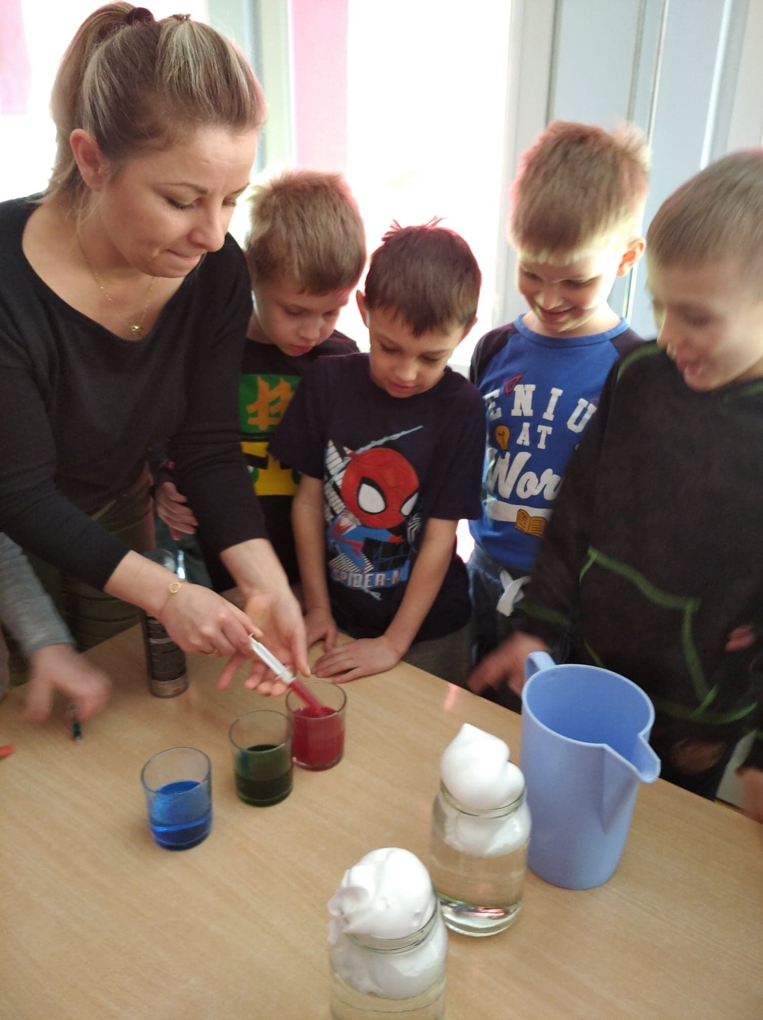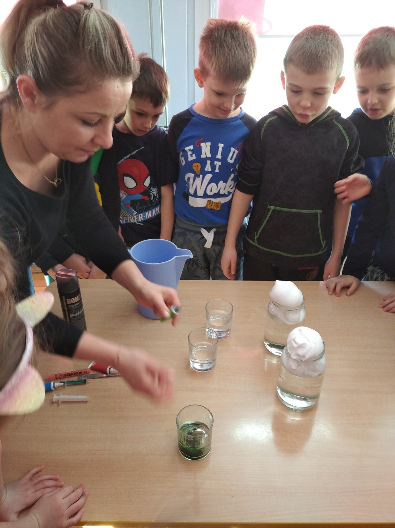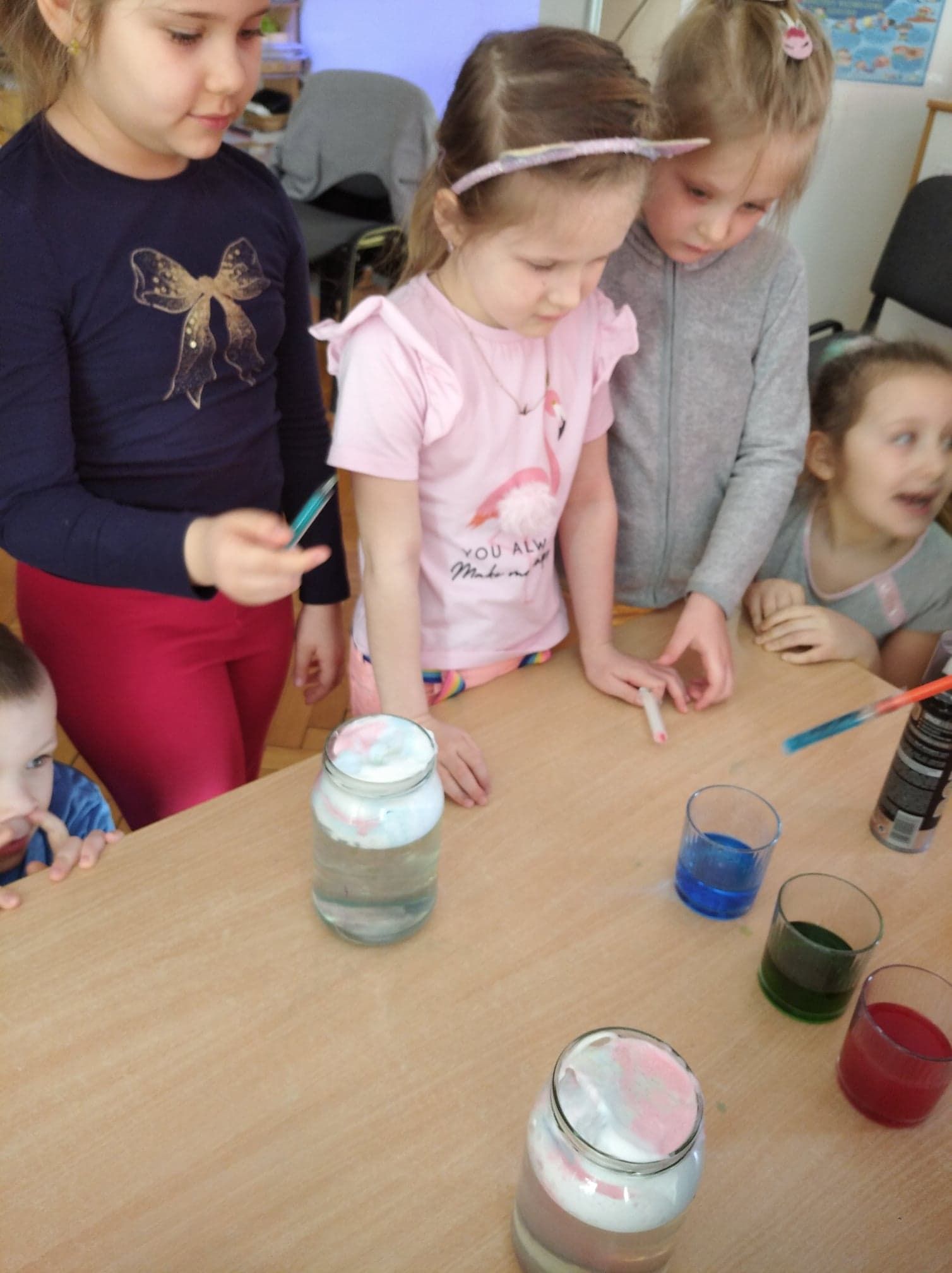 Dzieci kochają zabawy na śniegu i wszelkie zimowe aktywności na powietrzu. Pani Zima postanowiła nas odwiedzić i sprawiła nam wielką radość. Wykorzystując okazję z pojawienia się śniegu 10.03. 2022 r. dzieci z grupy ,,Motylki” dbając o zdrowie i hartując organizm wybrały się na przedszkolny plac zabaw. Wreszcie mogliśmy urządzić zabawy na śniegu. Dzieci oddały się zimowej zabawie wykazując się pomysłowością w szaleństwach na śniegu. Śnieg nikomu nie przeszkadzał, dzieci miały dużo frajdy, a do przedszkola wróciliśmy z szerokimi uśmiechami. 11.03.2022 r. ,,Motylki” robiły zabawy badawcze z wodą, wykonywały doświadczenia związane z parowaniem i skraplaniem. Odkrywanie, eksperymentowanie, doświadczanie to świetna zabawa. Dzieci rozwiązywały zagadki słowne, stworzyły mapę pojęciową ,,Do czego potrzebna jest woda? Omówiły proces krążenia wody w przyrodzie na podstawie plakatu i filmu edukacyjnego. Zabawy badawcze dostarczyły dzieciom duże ilości nowych przeżyć i wrażeń , doskonaląc koncentrację uwagi oraz cierpliwość w czekaniu na swoją kolej. Największą fascynację wywołał „Kolorowy deszcz” z pianką do golenia. Przedszkolaki spróbowały również zrobić ,,Deszcz w słoiku” wykorzystując wrzątek i kostki lodu . Obserwowały i wyciągały wnioski z prowadzonych doświadczeń. Wszystkim zajęcia bardzo się podobały, dlatego mamy nadzieję, że już niedługo uda nam się podobne powtórzyć.