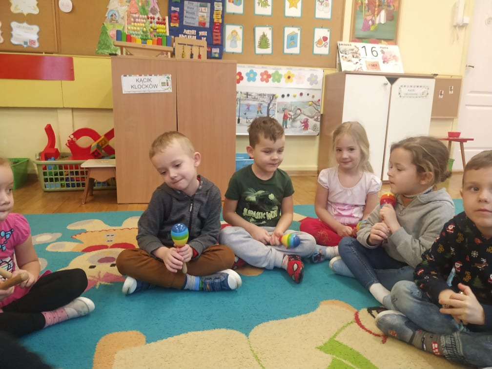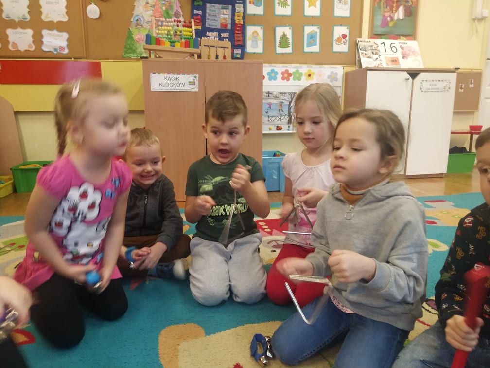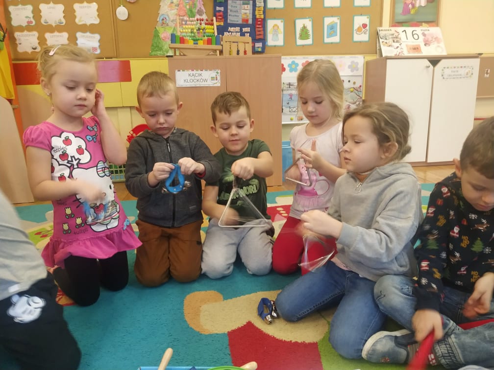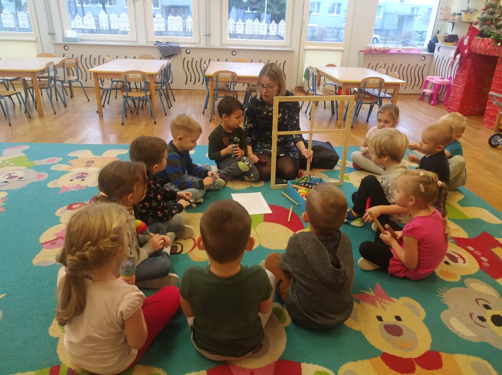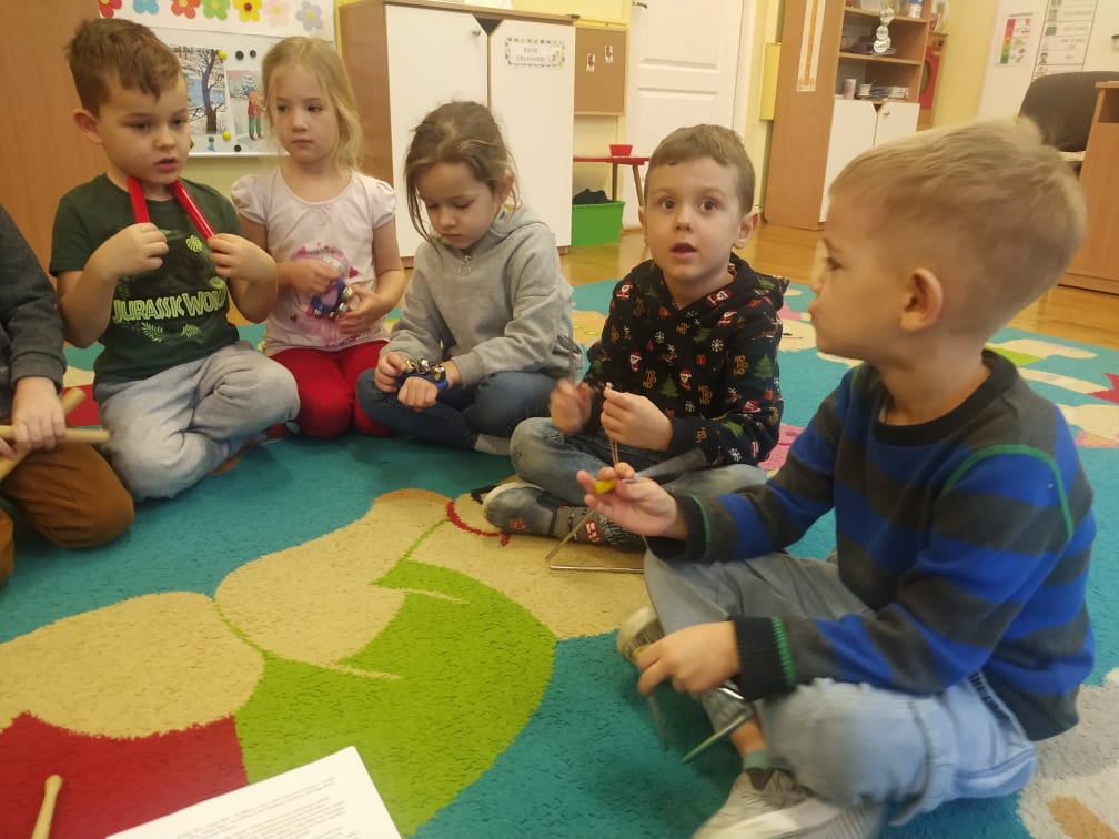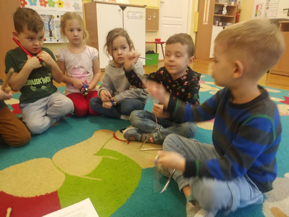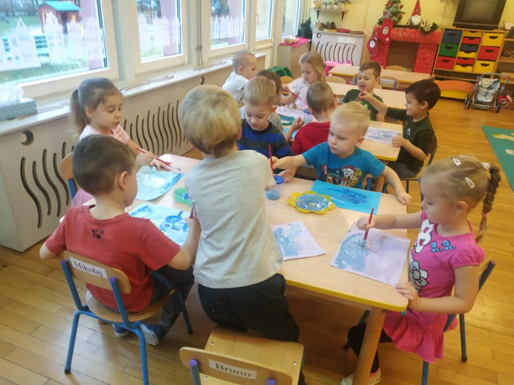 Przedszkolaki bardzo lubią zabawy i zajęcia z wykorzystaniem instrumentów muzycznych. Ta forma korzystnie wpływa na wszechstronny rozwój dziecka, pozwala rozwijać wrodzone zdolności muzyczne dziecka, przygotowuje dzieci do dalszej edukacji, nie tylko muzycznej – kształcąc m.in. uwagę słuchową, koncentrację uwagi oraz pamięć, sprawia też wiele radości. Przedszkolaki z niecierpliwością czekają na zabawy na śniegu, a póki co, muzykowały do piosenki „Biała Pani Zima“, zgadywały, na jakim instrumencie gra nauczyciel, czy tworzyły „echo instrumentalne“. Na koniec słuchając piosenki namalowały piękne zimowe pejzaże, wykorzystując technikę „mokre w mokrym“.