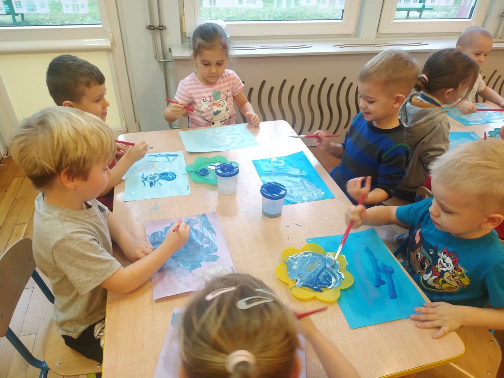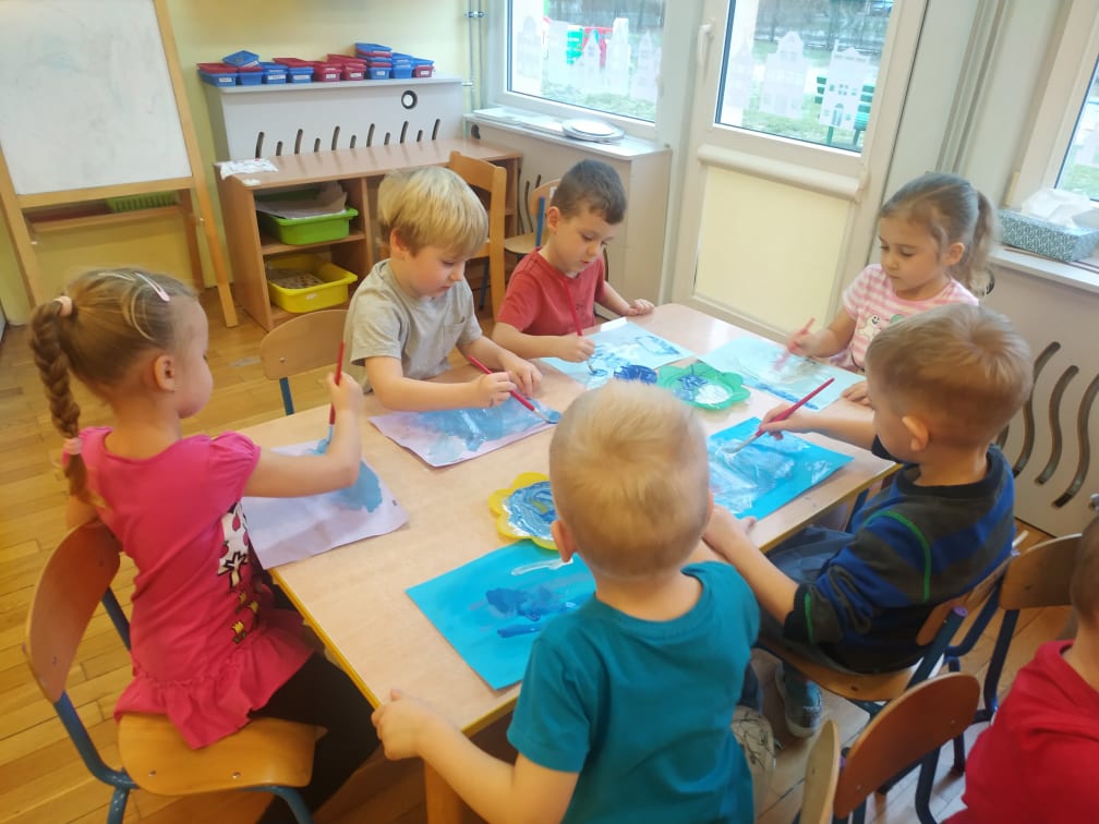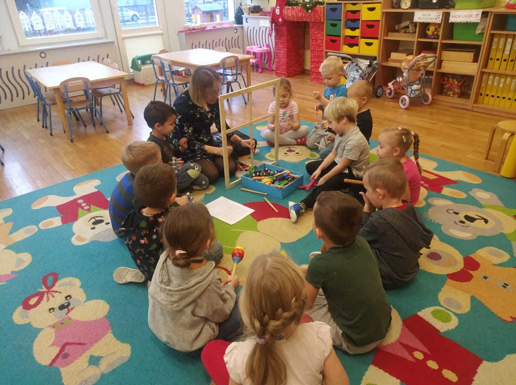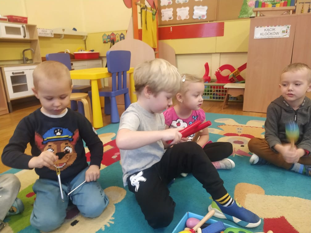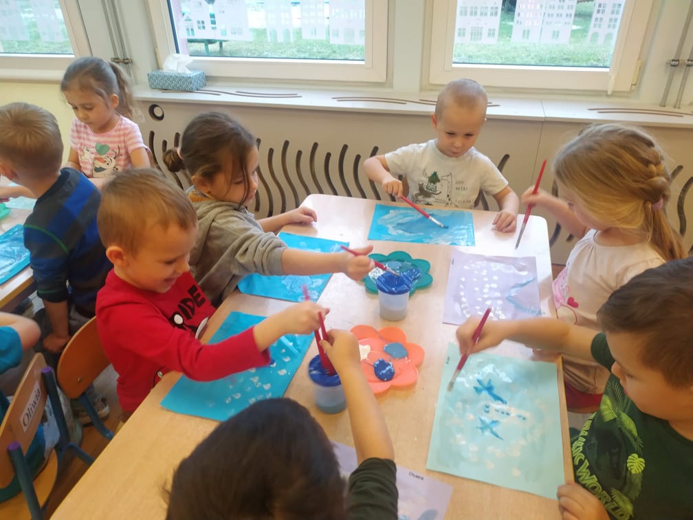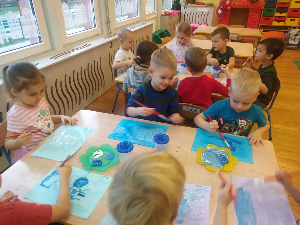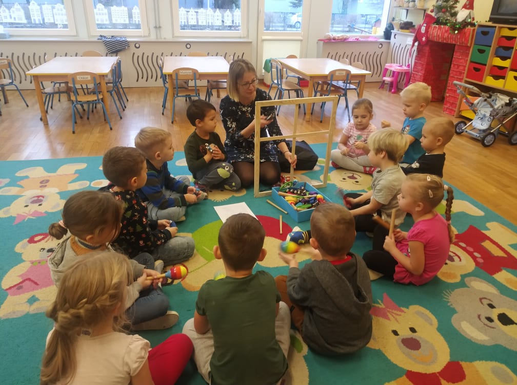 Przedszkolaki bardzo lubią zabawy i zajęcia z wykorzystaniem instrumentów muzycznych. Ta forma korzystnie wpływa na wszechstronny rozwój dziecka, pozwala rozwijać wrodzone zdolności muzyczne dziecka, przygotowuje dzieci do dalszej edukacji, nie tylko muzycznej – kształcąc m.in. uwagę słuchową, koncentrację uwagi oraz pamięć, sprawia też wiele radości. Przedszkolaki z niecierpliwością czekają na zabawy na śniegu, a póki co, muzykowały do piosenki „Biała Pani Zima“, zgadywały, na jakim instrumencie gra nauczyciel, czy tworzyły „echo instrumentalne“. Na koniec słuchając piosenki namalowały piękne zimowe pejzaże, wykorzystując technikę „mokre w mokrym“.