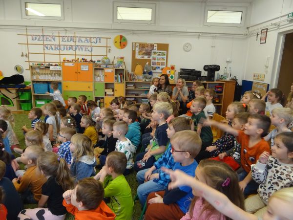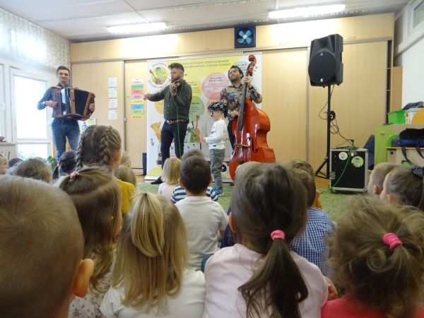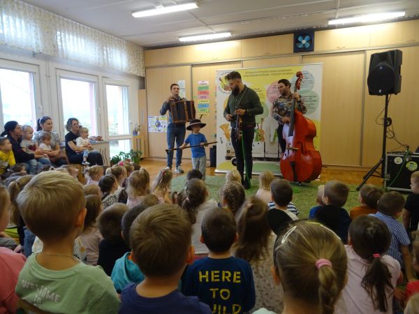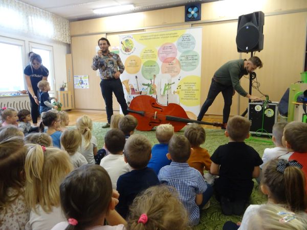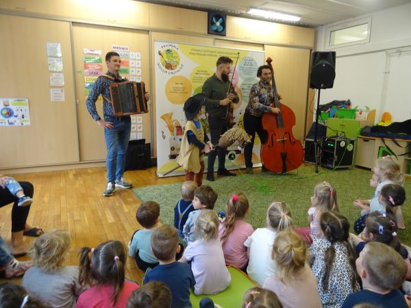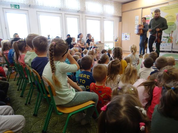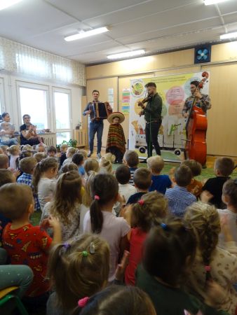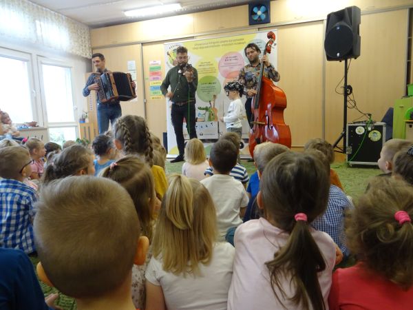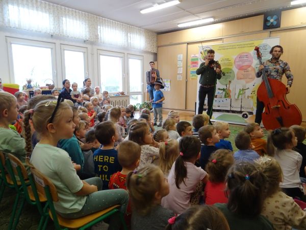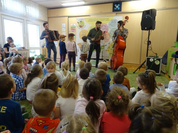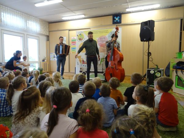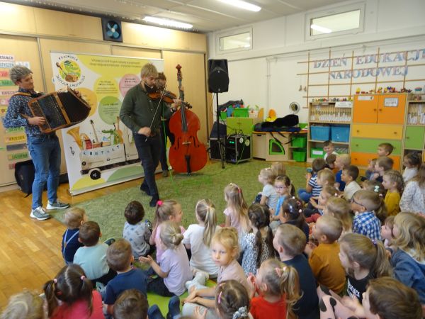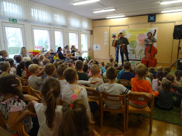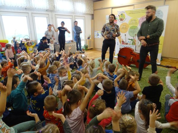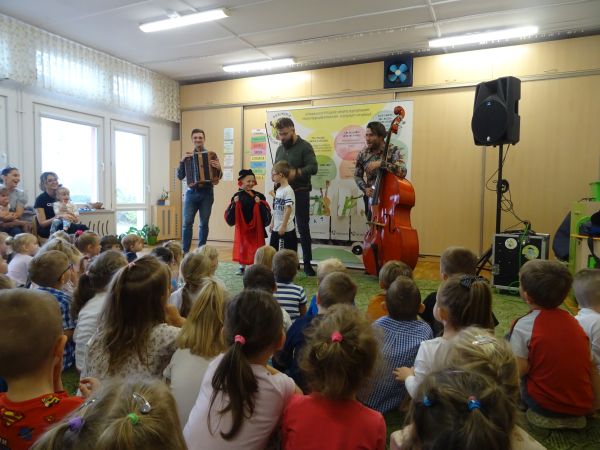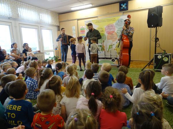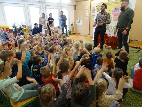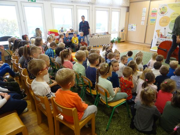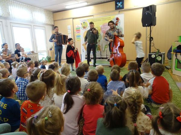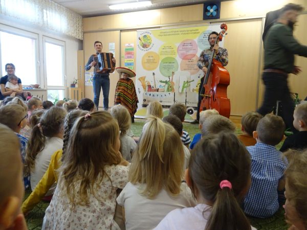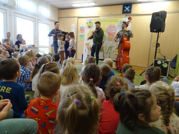 26.10.2022 r. nasze przedszkole odwiedzili znani i lubiani przez wszystkich muzycy z grupy „Jaszczur i Przyjaciele“. Przedszkolaki obejrzały audycję muzyczną, dzięki której mogły odbyć „Muzyczną podróż dookoła świata samolotem“. Dzieci przeniosły się w muzyczny świat Polski, Hiszpanii, Francji, Ukrainy, Meksyku, Ameryki. Dzieci podczas audycji poznały wygląd i brzmienie takich instrumentów jak: akordeon, kontrabas i skrzypce. Podczas muzycznego spotkania dzieci nie tylko słuchały muzyki, ale także angażowały się w wykonywanie różnych zadań. Audycja wszystkim bardzo się podobała i z niecierpliwością czekamy na kolejną.