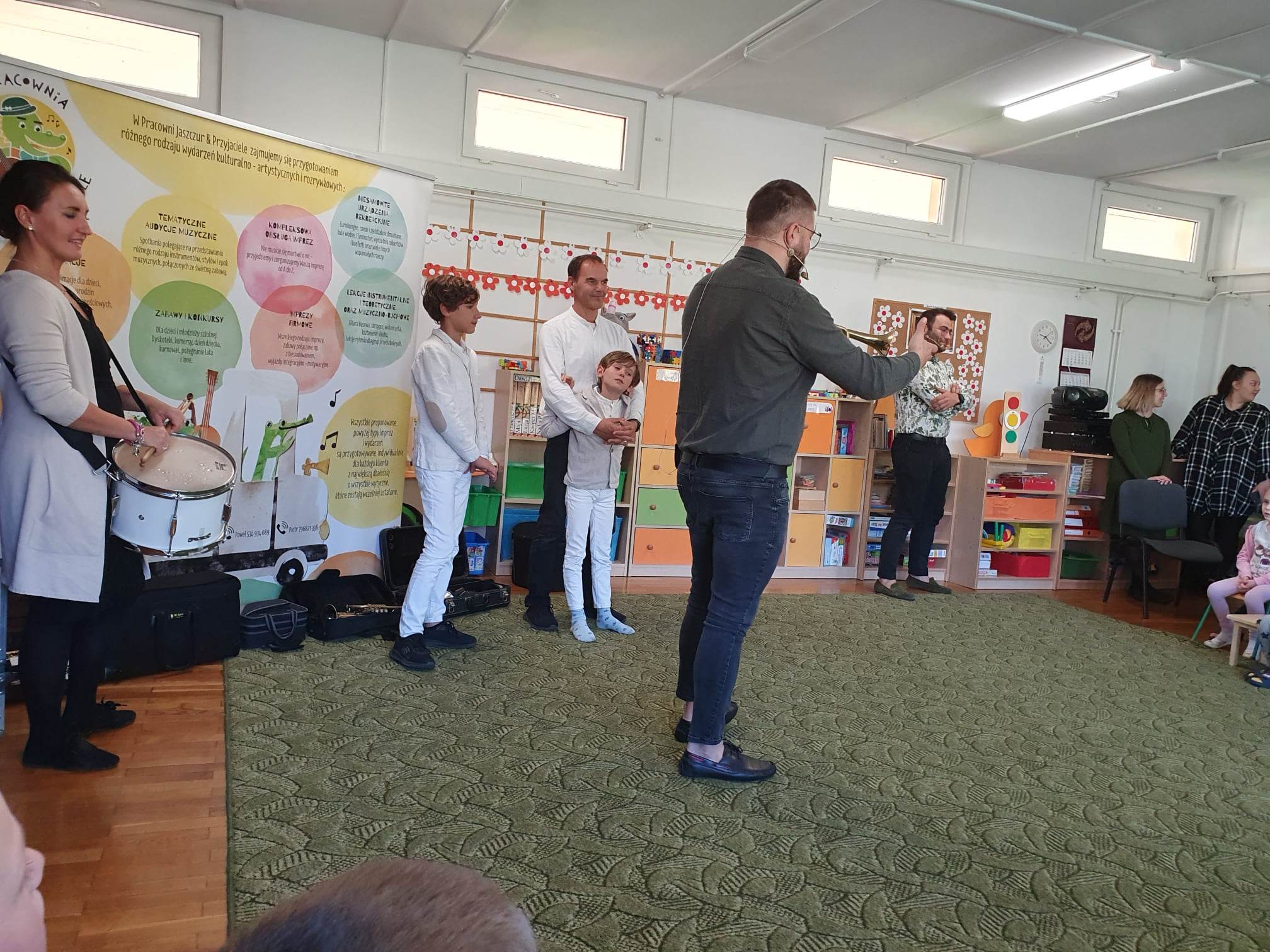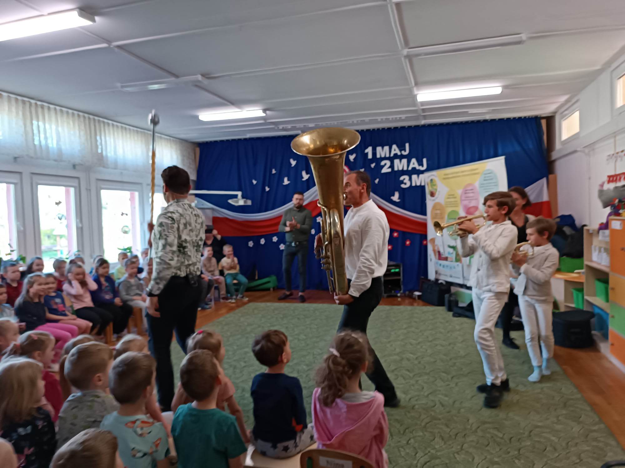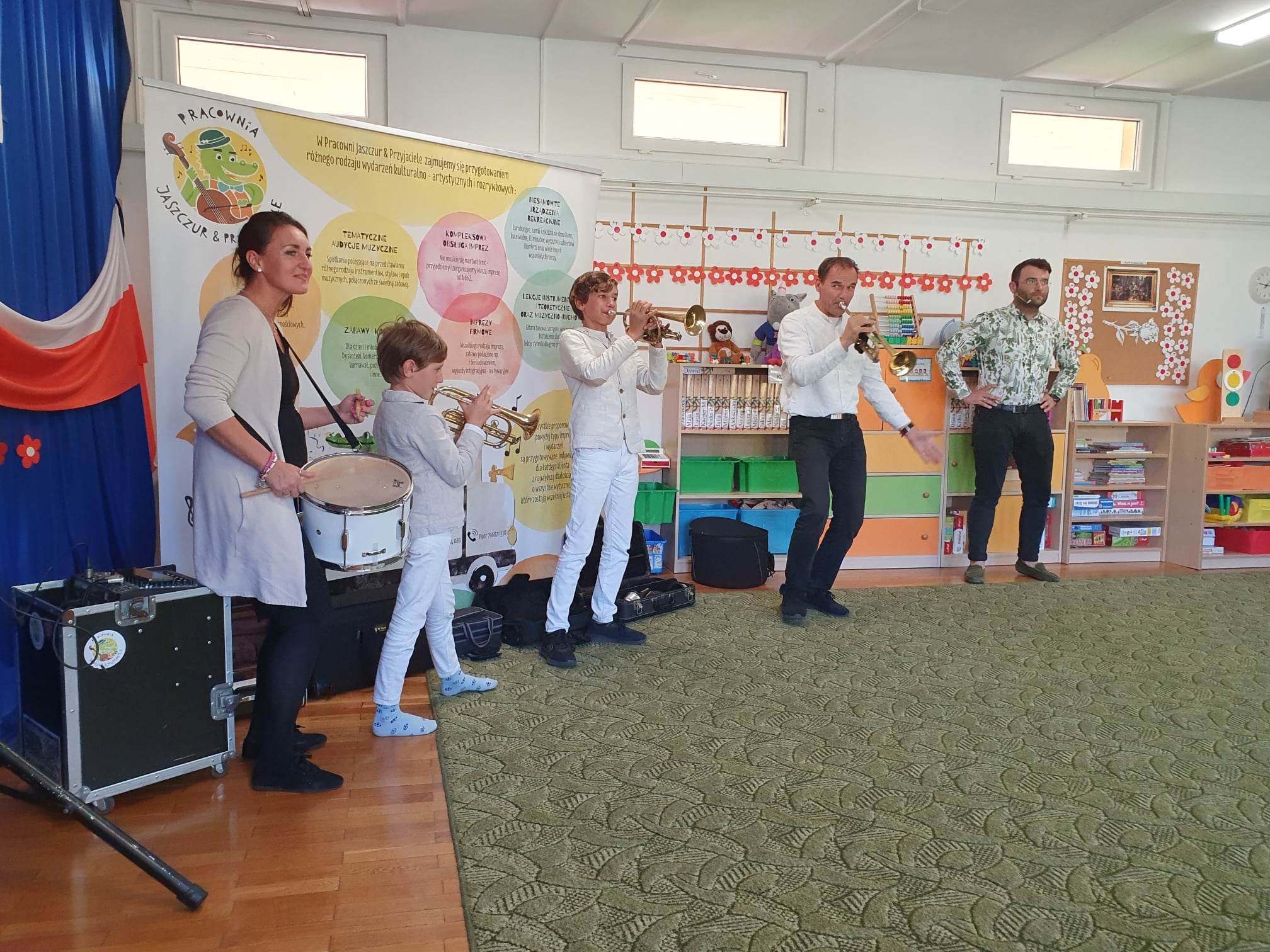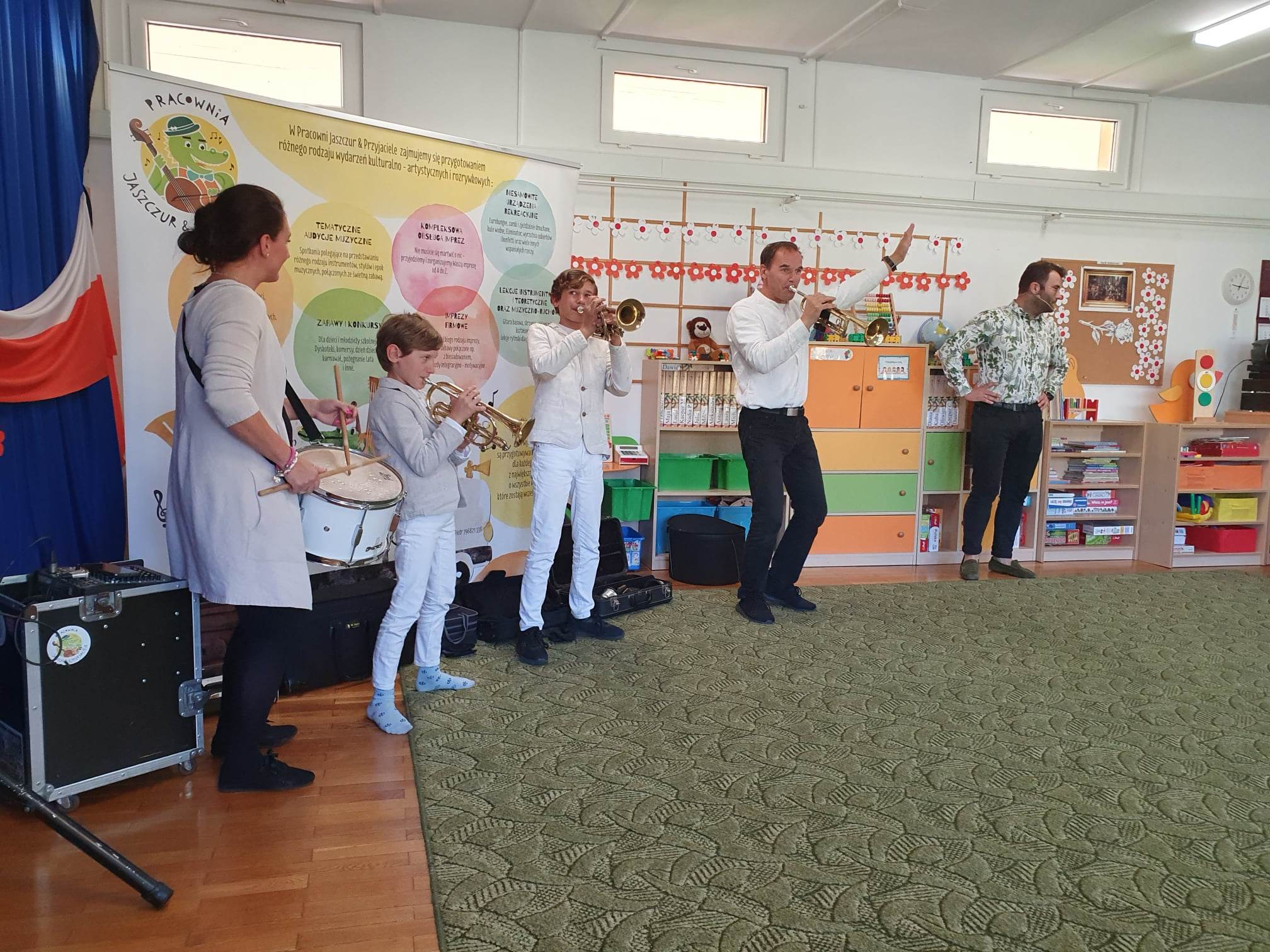 27.04.2023 r. do naszego przedszkola zawitali muzycy z grupy Jaszczur i Przyjaciele wraz z The Brass Family. Tematem przewodnim spotkania z muzyką było poznanie instrumentów dętych blaszanych. Dzieci miały okazję zobaczyć oraz posłuchać gry na całej „rodzinie” trąbek m.in. trąbce basowej, trąbce kieszonkowej czy tubie. Dowiedziały się również co to takiego buława i do czego służy oraz jak nazywa się osoba prowadząca orkiestrę dętą. Wszystkie poznane przez przedszkolaków typy trąbek, różnią się barwą dźwięku oraz wielkością instrumentu. Spotkania z Pracownią Jaszczur i Przyjaciele są zawsze okazją nie tylko do wzbogacenia wiedzy dzieci, obcowania z instrumentami i muzykami profesjonalnie zajmującymi się muzyką, dają też możliwość rozbudzenia wrażliwości muzycznej u dzieci i aktywnego ich udziału w zajęciach.
