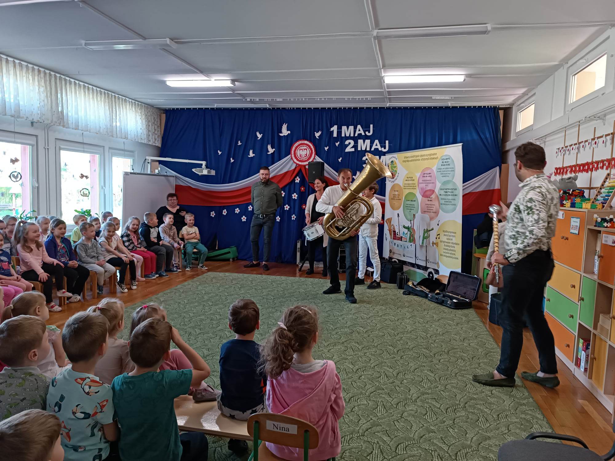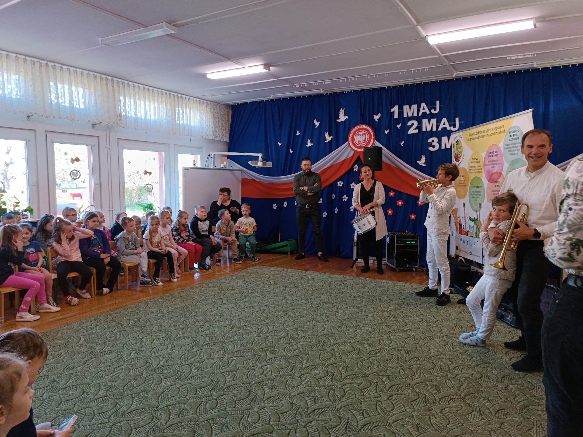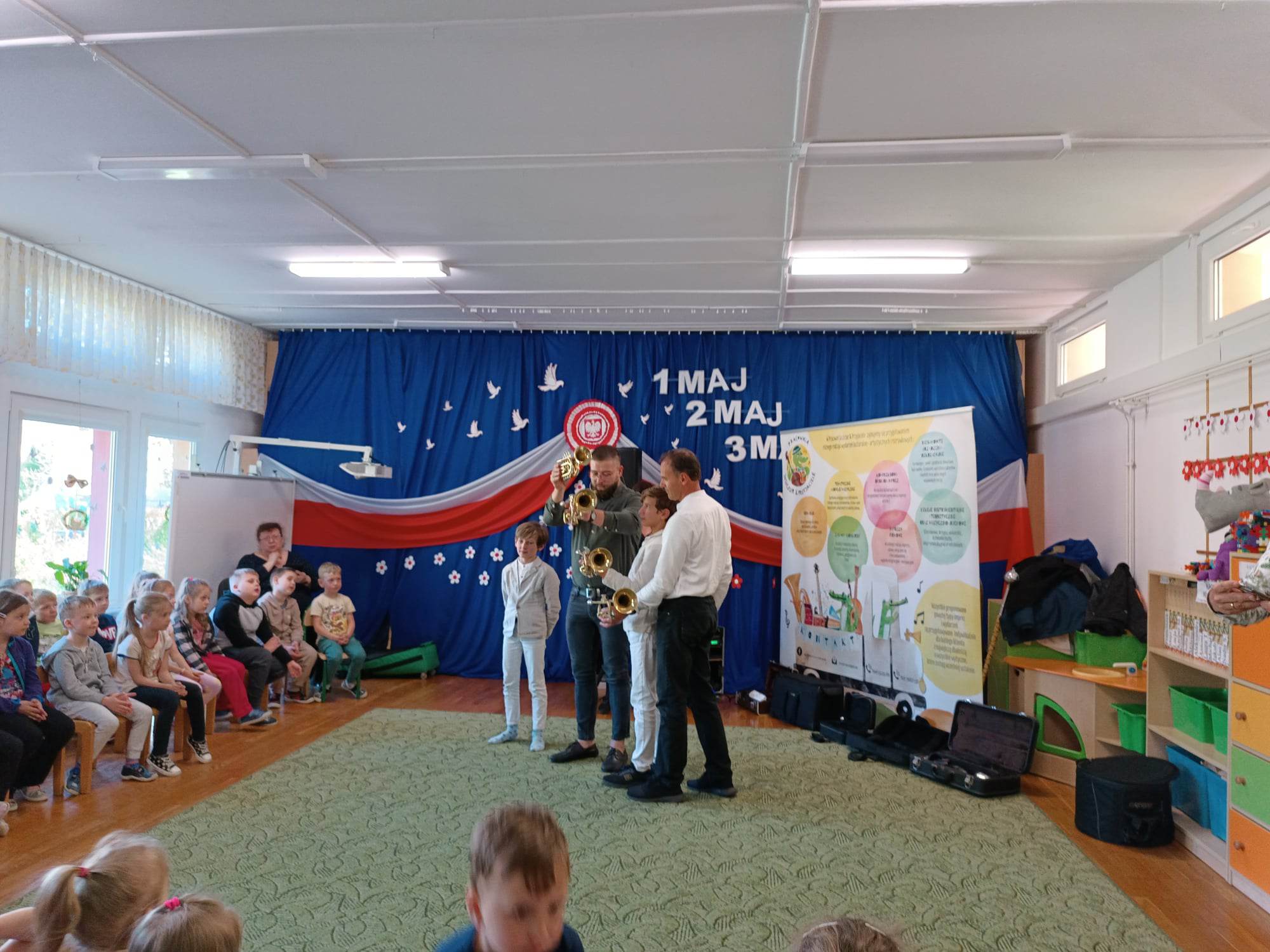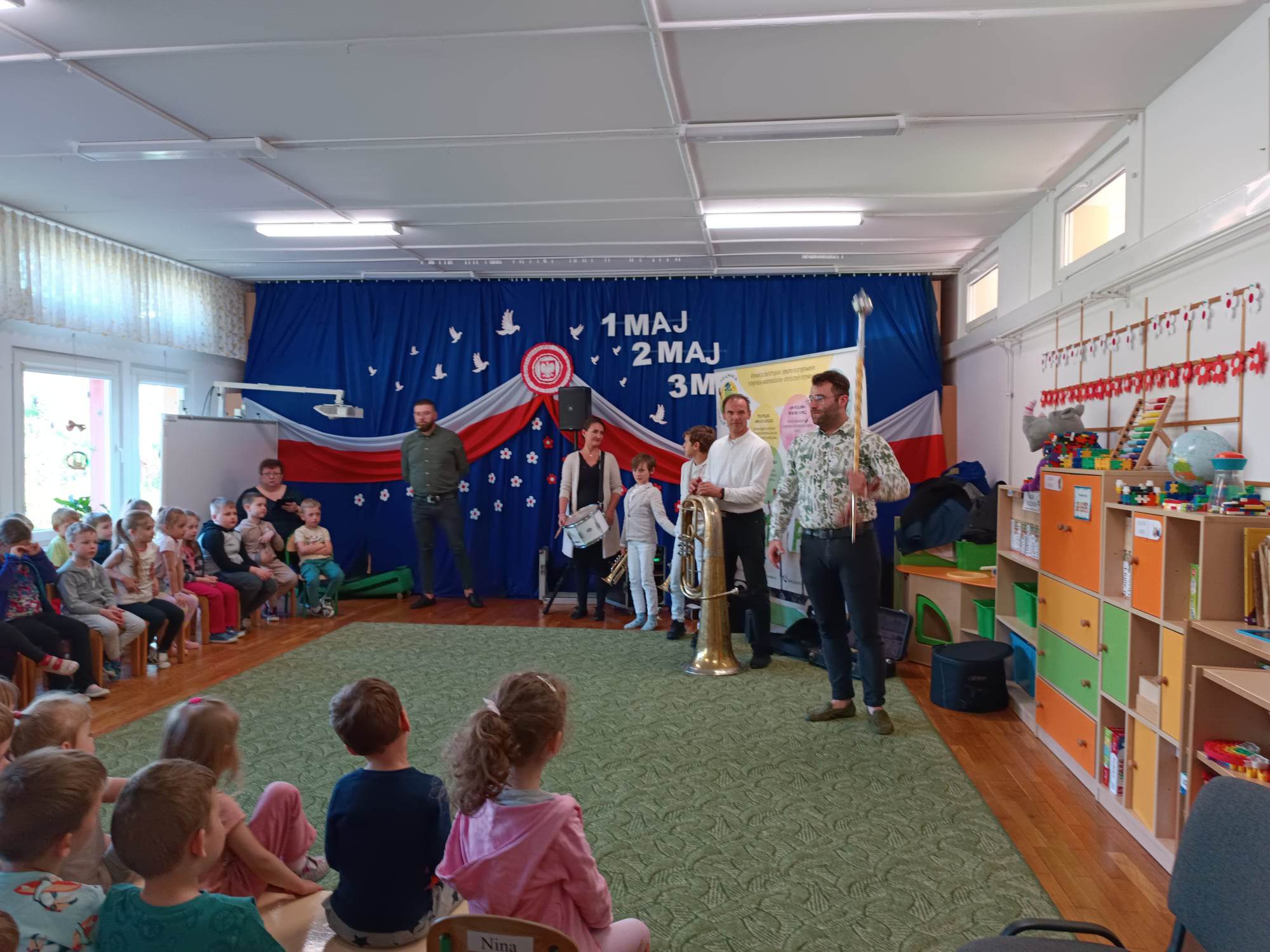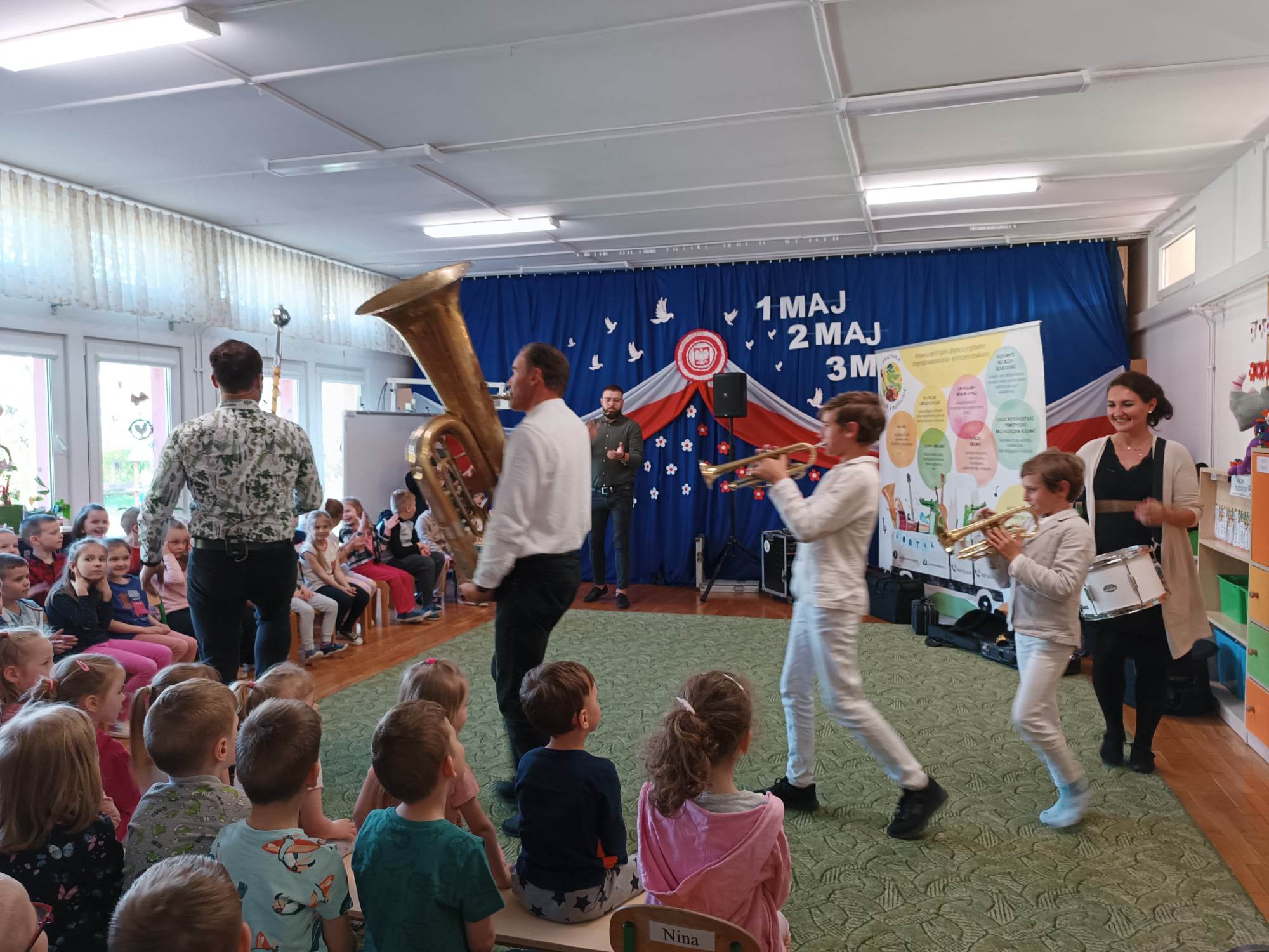27.04.2023 r. do naszego przedszkola zawitali muzycy z grupy Jaszczur i Przyjaciele wraz z The Brass Family. Tematem przewodnim spotkania z muzyką było poznanie instrumentów dętych blaszanych. Dzieci miały okazję zobaczyć oraz posłuchać gry na całej „rodzinie” trąbek m.in. trąbce basowej, trąbce kieszonkowej czy tubie. Dowiedziały się również co to takiego buława i do czego służy oraz jak nazywa się osoba prowadząca orkiestrę dętą. Wszystkie poznane przez przedszkolaków typy trąbek, różnią się barwą dźwięku oraz wielkością instrumentu. Spotkania z Pracownią Jaszczur i Przyjaciele są zawsze okazją nie tylko do wzbogacenia wiedzy dzieci, obcowania z instrumentami i muzykami profesjonalnie zajmującymi się muzyką, dają też możliwość rozbudzenia wrażliwości muzycznej u dzieci i aktywnego ich udziału w zajęciach.