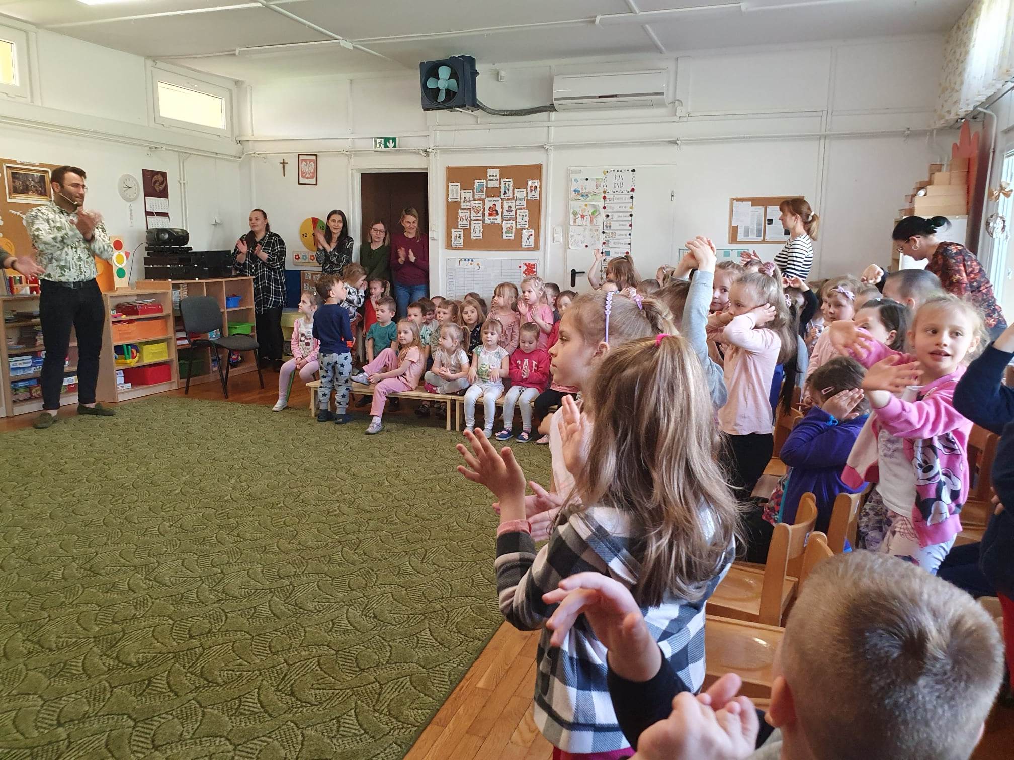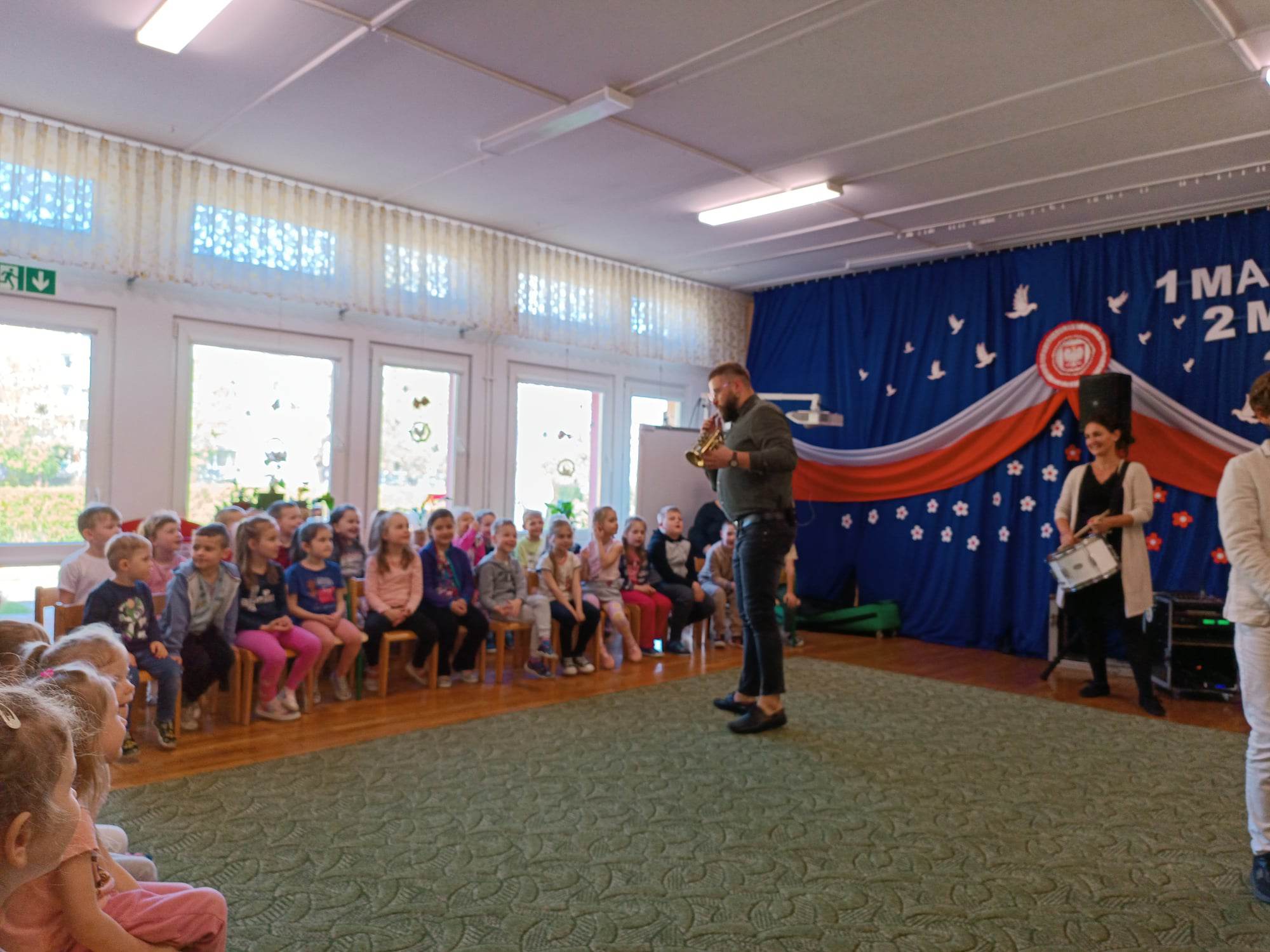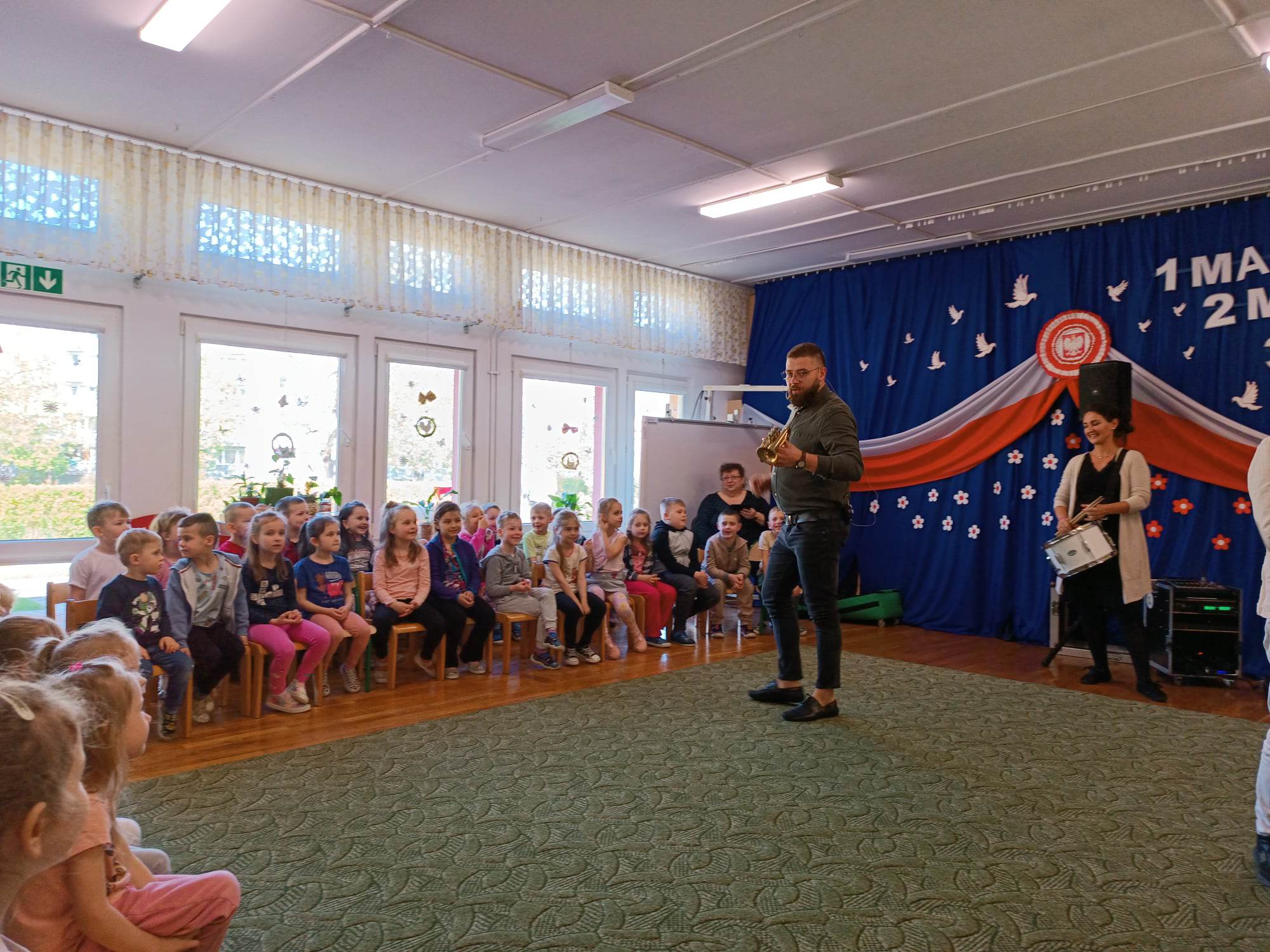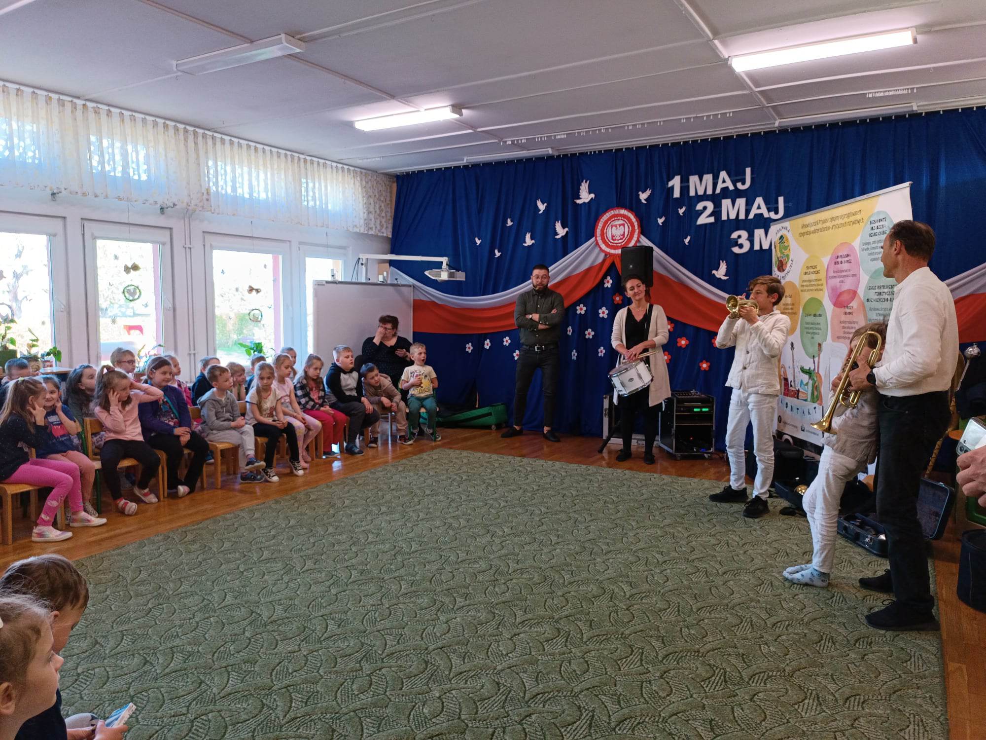 27.04.2023 r. do naszego przedszkola zawitali muzycy z grupy Jaszczur i Przyjaciele wraz z The Brass Family. Tematem przewodnim spotkania z muzyką było poznanie instrumentów dętych blaszanych. Dzieci miały okazję zobaczyć oraz posłuchać gry na całej „rodzinie” trąbek m.in. trąbce basowej, trąbce kieszonkowej czy tubie. Dowiedziały się również co to takiego buława i do czego służy oraz jak nazywa się osoba prowadząca orkiestrę dętą. Wszystkie poznane przez przedszkolaków typy trąbek, różnią się barwą dźwięku oraz wielkością instrumentu. Spotkania z Pracownią Jaszczur i Przyjaciele są zawsze okazją nie tylko do wzbogacenia wiedzy dzieci, obcowania z instrumentami i muzykami profesjonalnie zajmującymi się muzyką, dają też możliwość rozbudzenia wrażliwości muzycznej u dzieci i aktywnego ich udziału w zajęciach.