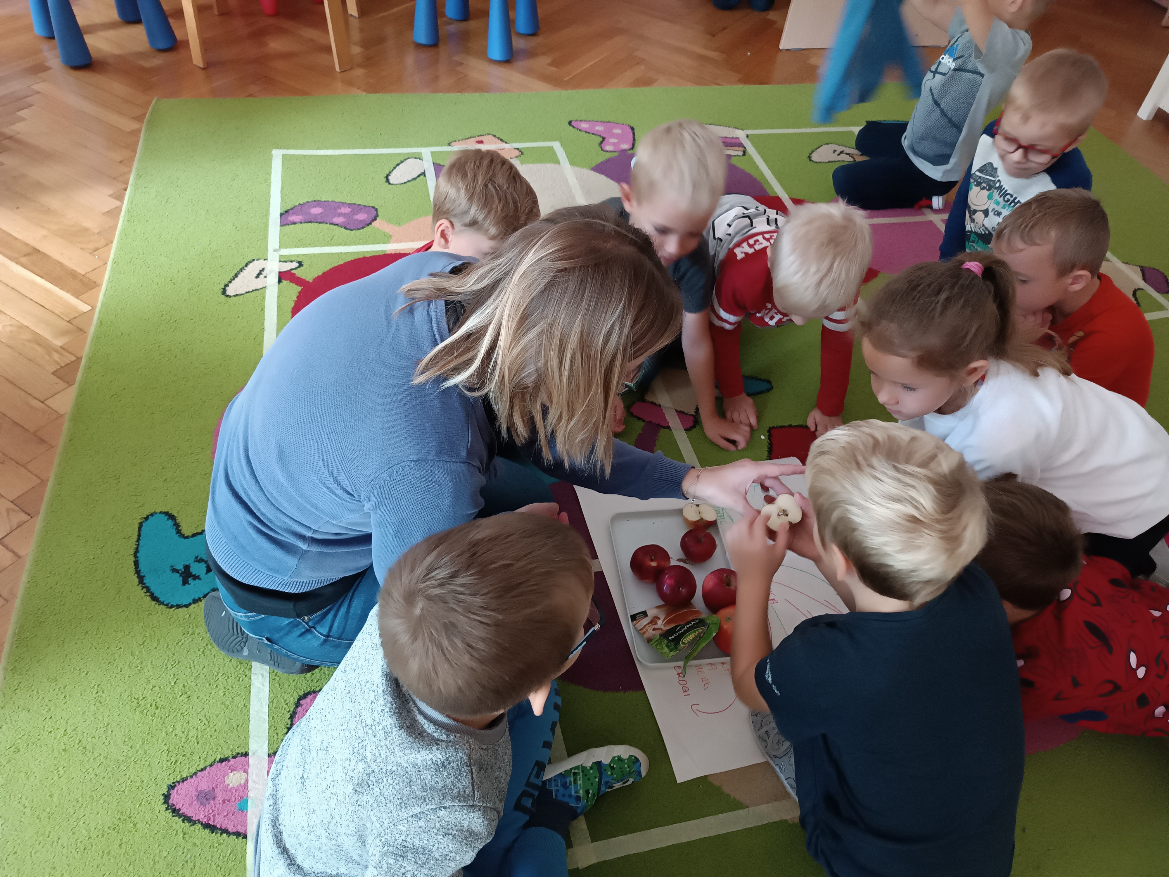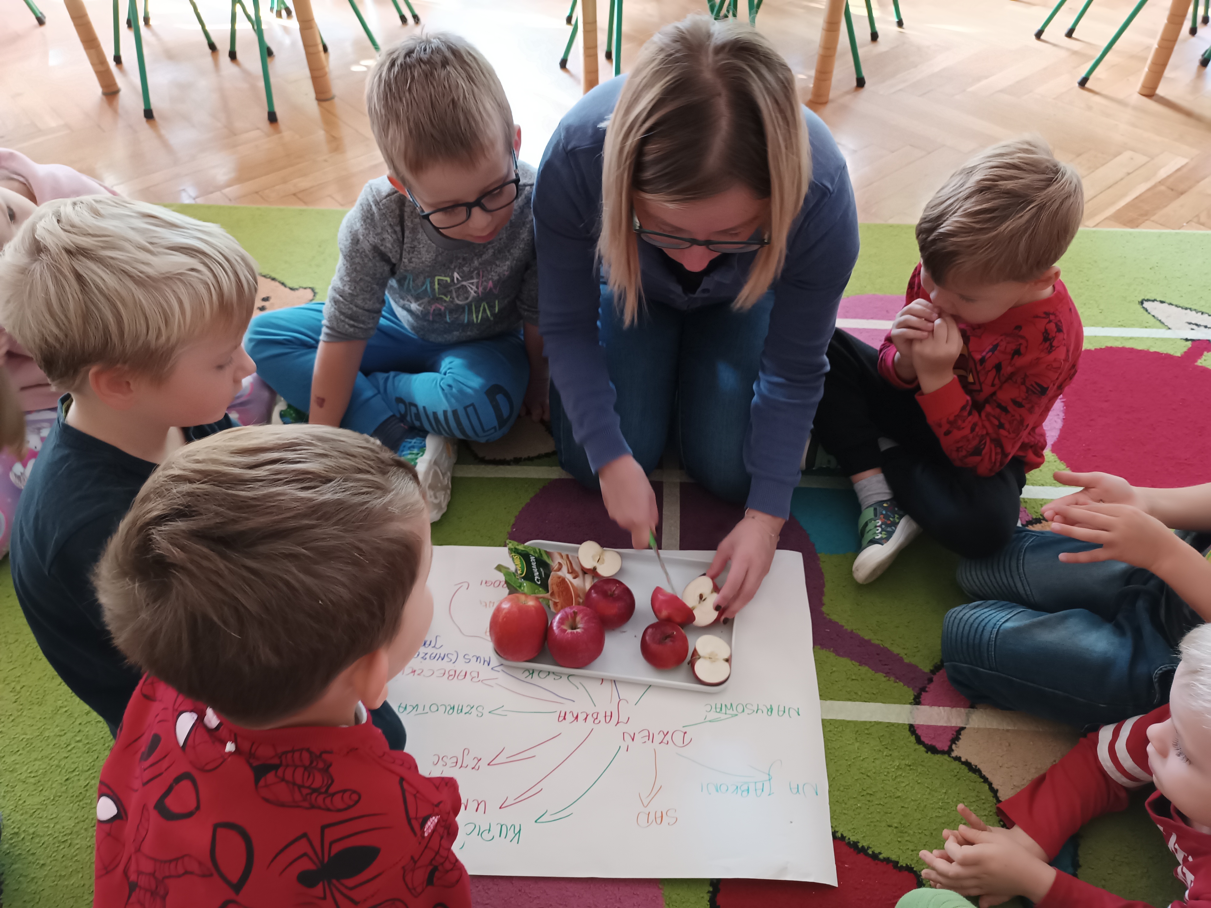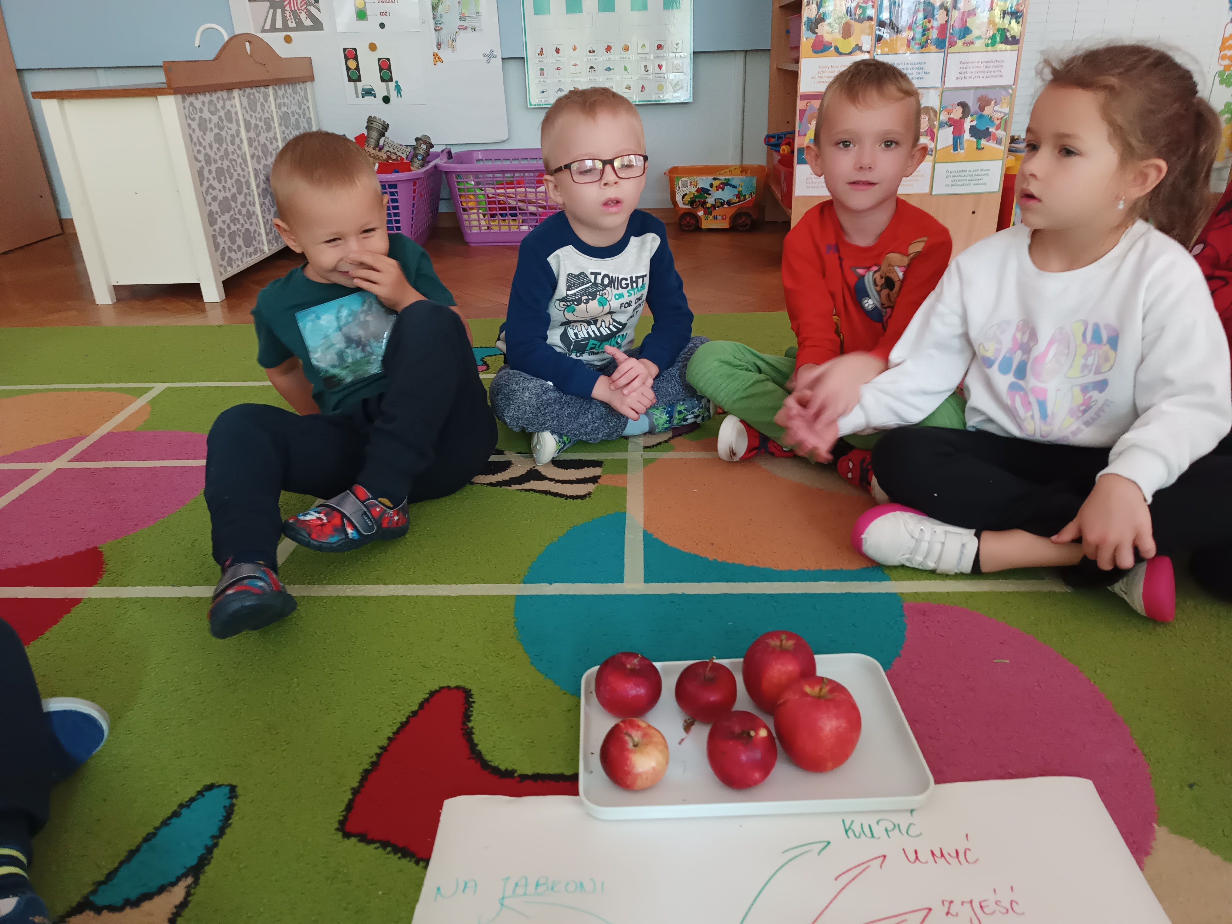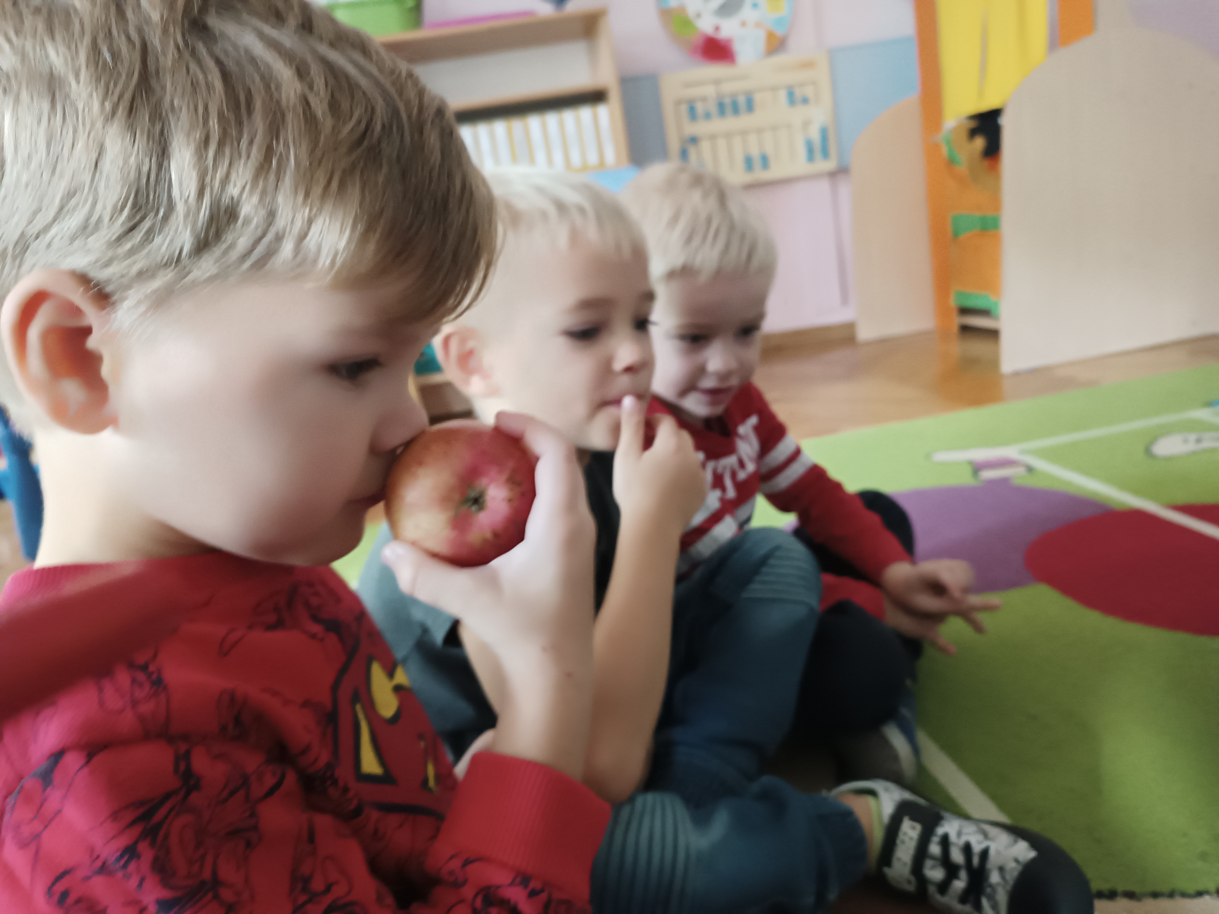 28.09. przypada Światowy Dzień Jabłka. Ze względu na fakt, że w naszym przedszkolu uważa się, że zdrowie, właściwe nawyki żywieniowe są ważne, obchodziliśmy to święto i my. Przedszkolaki rozmawiały o tym, jak ważne jest jedzenie owoców, co można zrobić z jabłek, jak należy je przygotować do spożycia, poznały wartości odżywcze tego owocu i dowiedziały się, dlaczego warto jeść jabłka ze skórką, oczywiście po wcześniejszym umyciu. Święta takie, jak Dzień Jabłka są najlepszą okazją do kształtowania prawidłowych nawyków żywieniowych. Zachęcamy też Państwa, by w domach, jak najczęściej, proponować dzieciom owoce i warzywa.