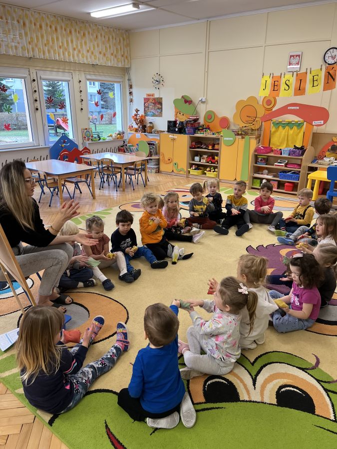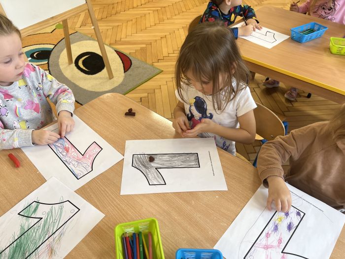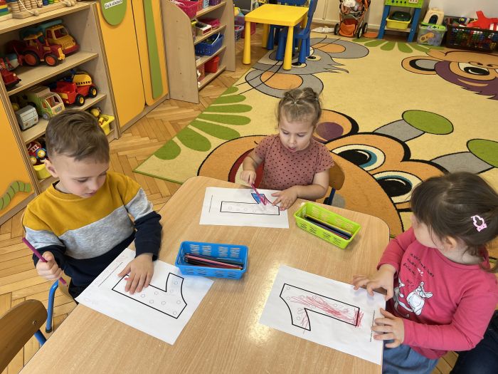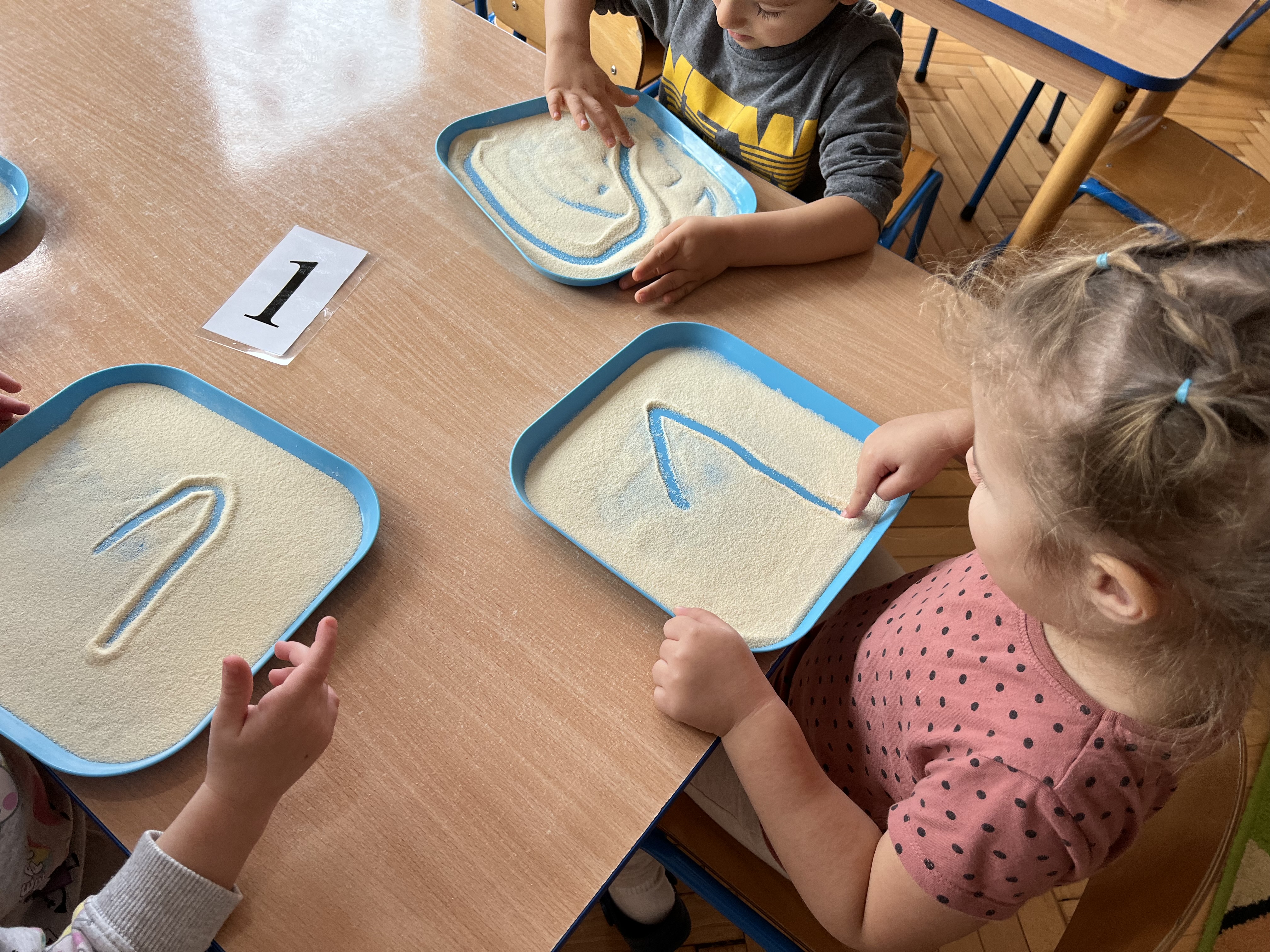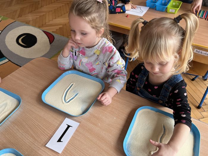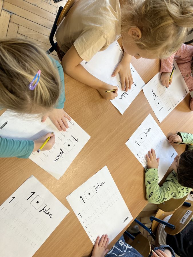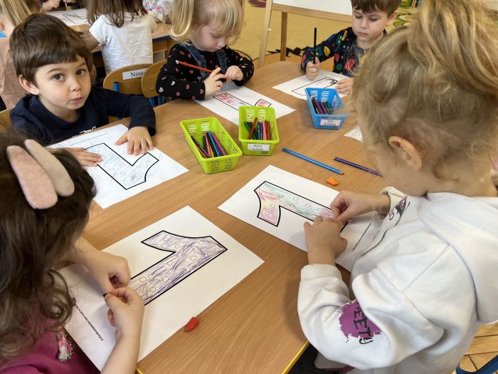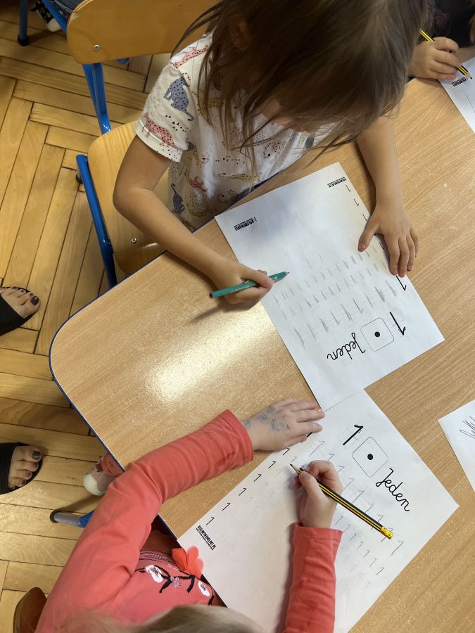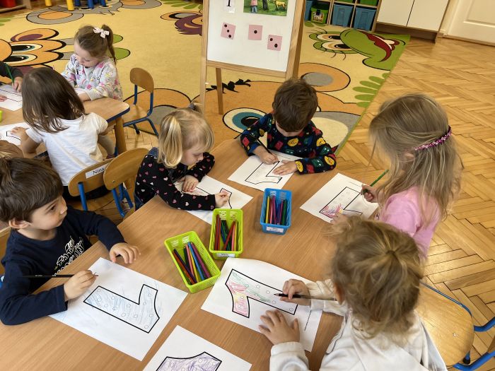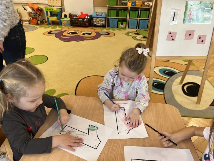 Podczas zajęć "Krasnalki" poznały znak graficzny cyfry 1, ucząc się wierszyka, który jest skorelowany z wprowadzonym wzorem graficznym cyfry 1. Poznały jej kształt biorąc udział w zabawach ruchowo-wzrokowo-słuchowych angażujących zmysły dziecka: wystukiwały rytm wiersza na woreczkach gimnastycznych, wodziły palcem po znaku graficznym cyfry 1 z jednoczesnym mówieniem wiersza, tworzyły zbiory składające się z jednego elementu, przeliczały patyczki skupiając się na konkretach, pisały cyfrę 1 na specjalnych tackach z kaszą odtwarzając samodzielnie jej wzór, wykonały pracę plastyczną pt. "Jak wygląda cyfra 1", kolorując i lepiąc plasteliną wzór graficzny cyfry. Ponadto, dzieci podejmowały próby pisania cyfry 1 po śladzie, ćwicząc małą motorykę.