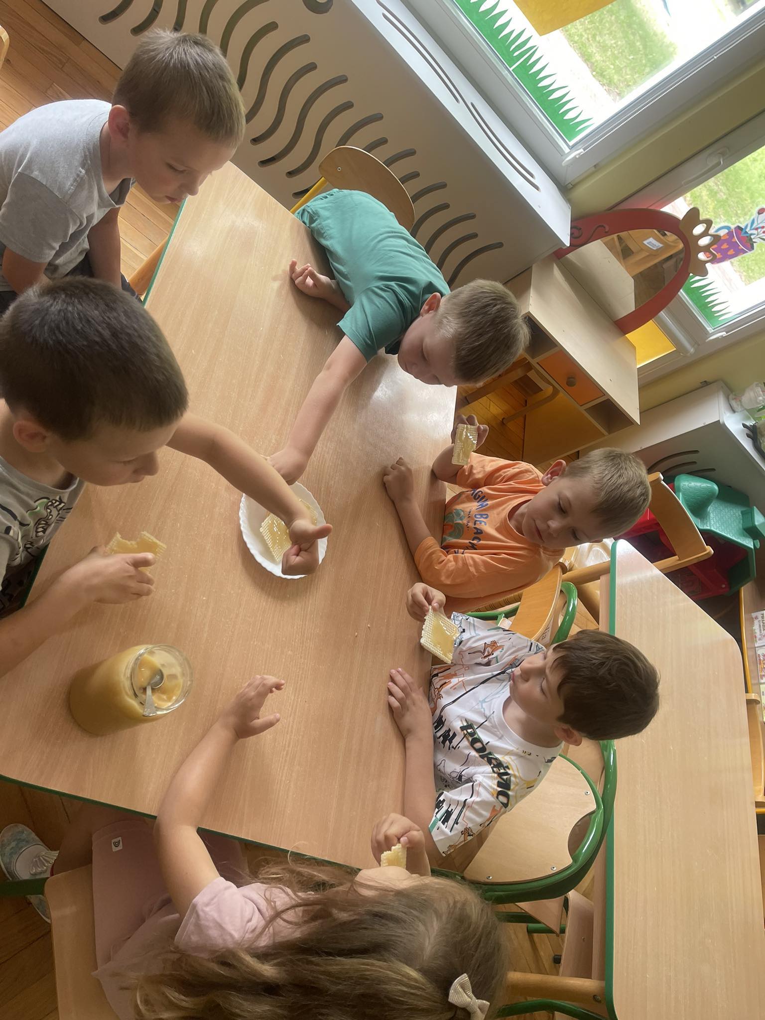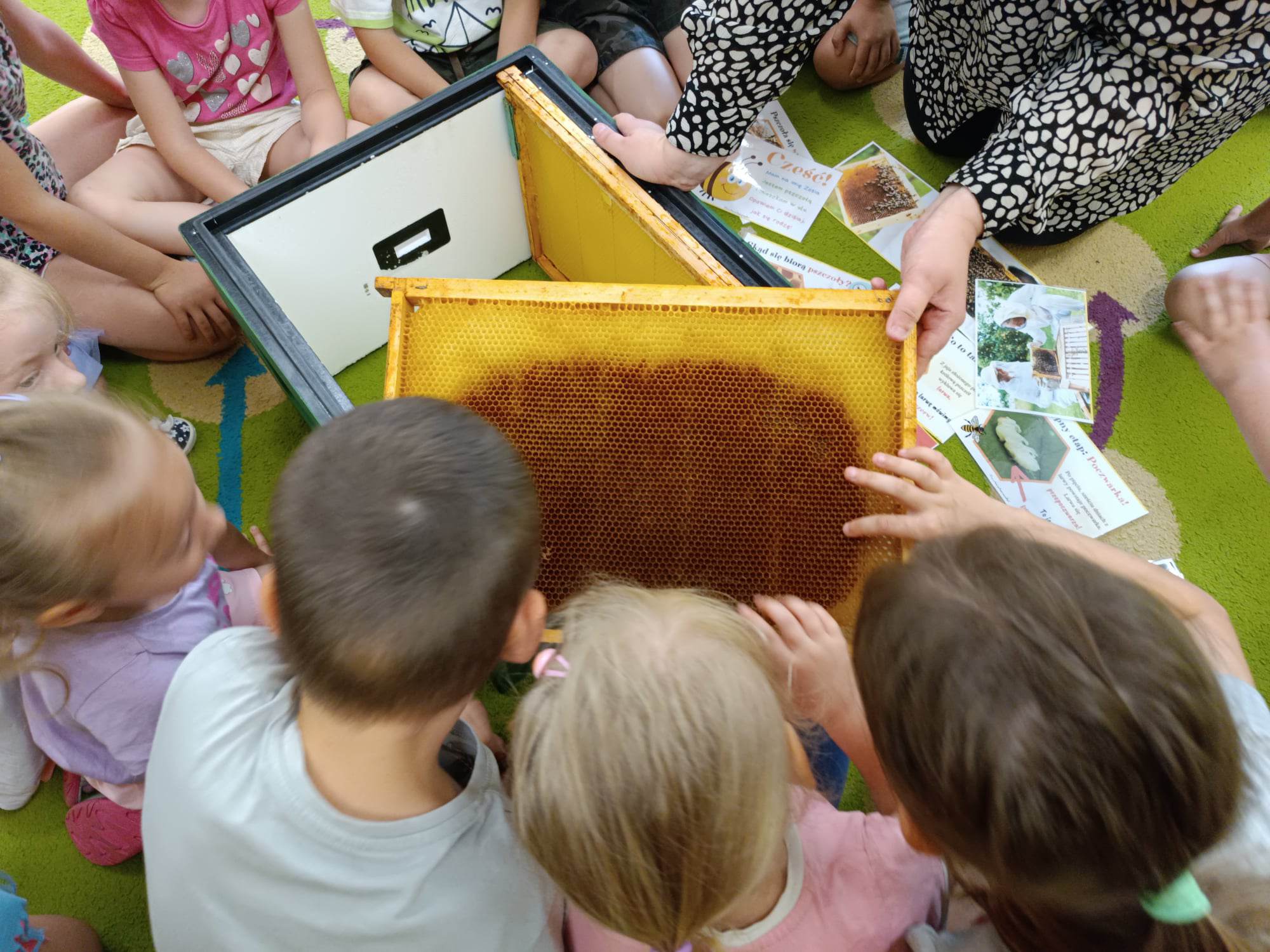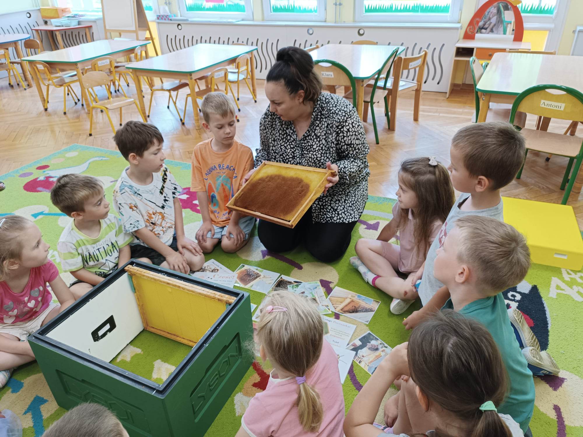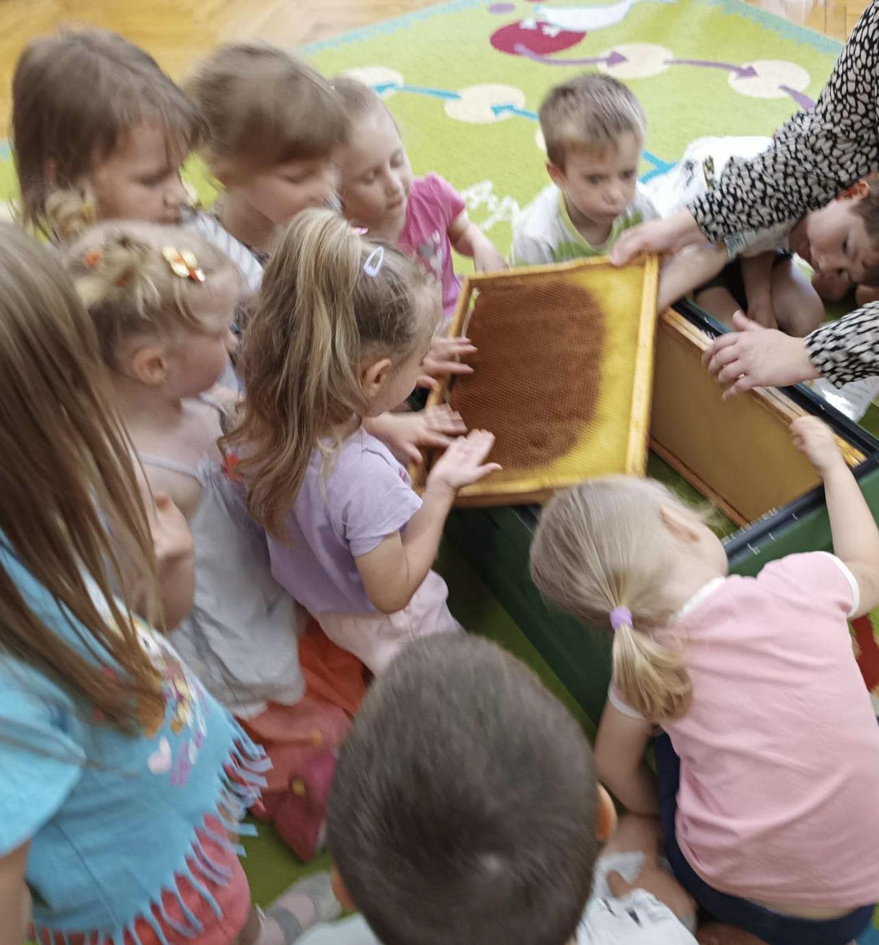 Dzieci z grupy „Biedronki“ aktywnie uczestniczyły w zajęciach poświęconych pszczołom. Przedszkolaki dowiedziały się jakie znaczenie ma praca pszczół dla świata przyrody, poznały cykl życia pszczoły oraz etapy powstawania miodu. Miały okazję zobaczyć prawdziwy ul, ramki oraz strój pszczelarza. Na zajęciach odbył się pszczeli koncert, dzieci zaprezentowały grę na instrumentach, a zabawy ruchowe i działania matematyczne podkreśliły atrakcyjność zajęć. Nie mogło również zabraknąć degustacji miodu, który bardzo im smakował.