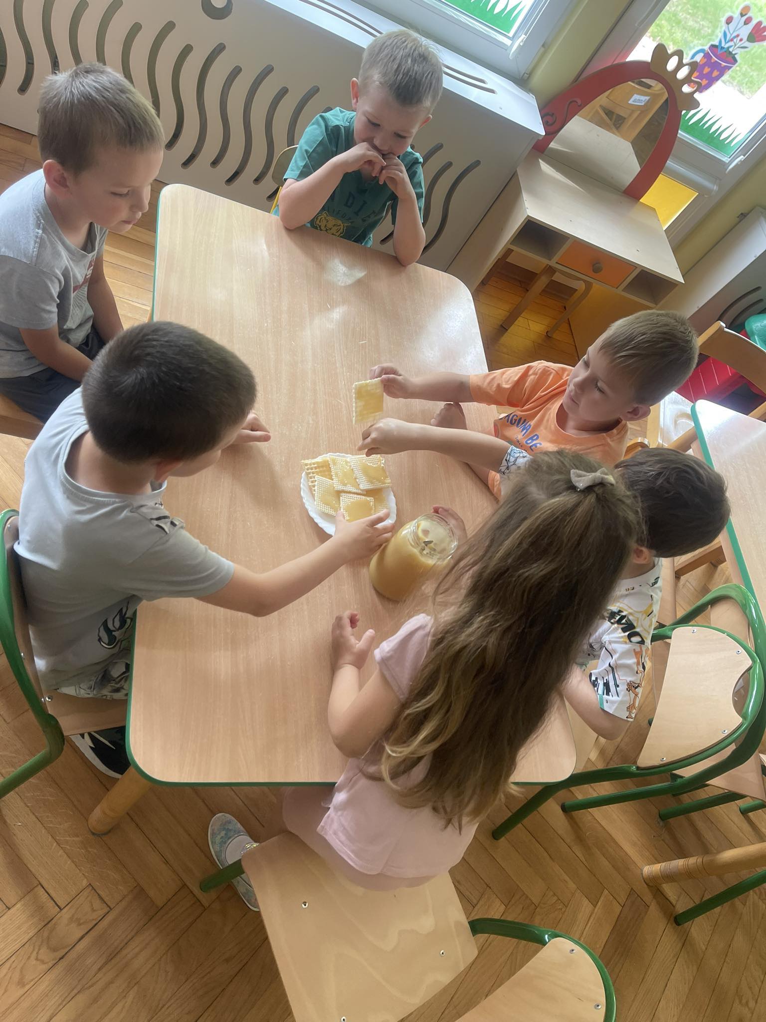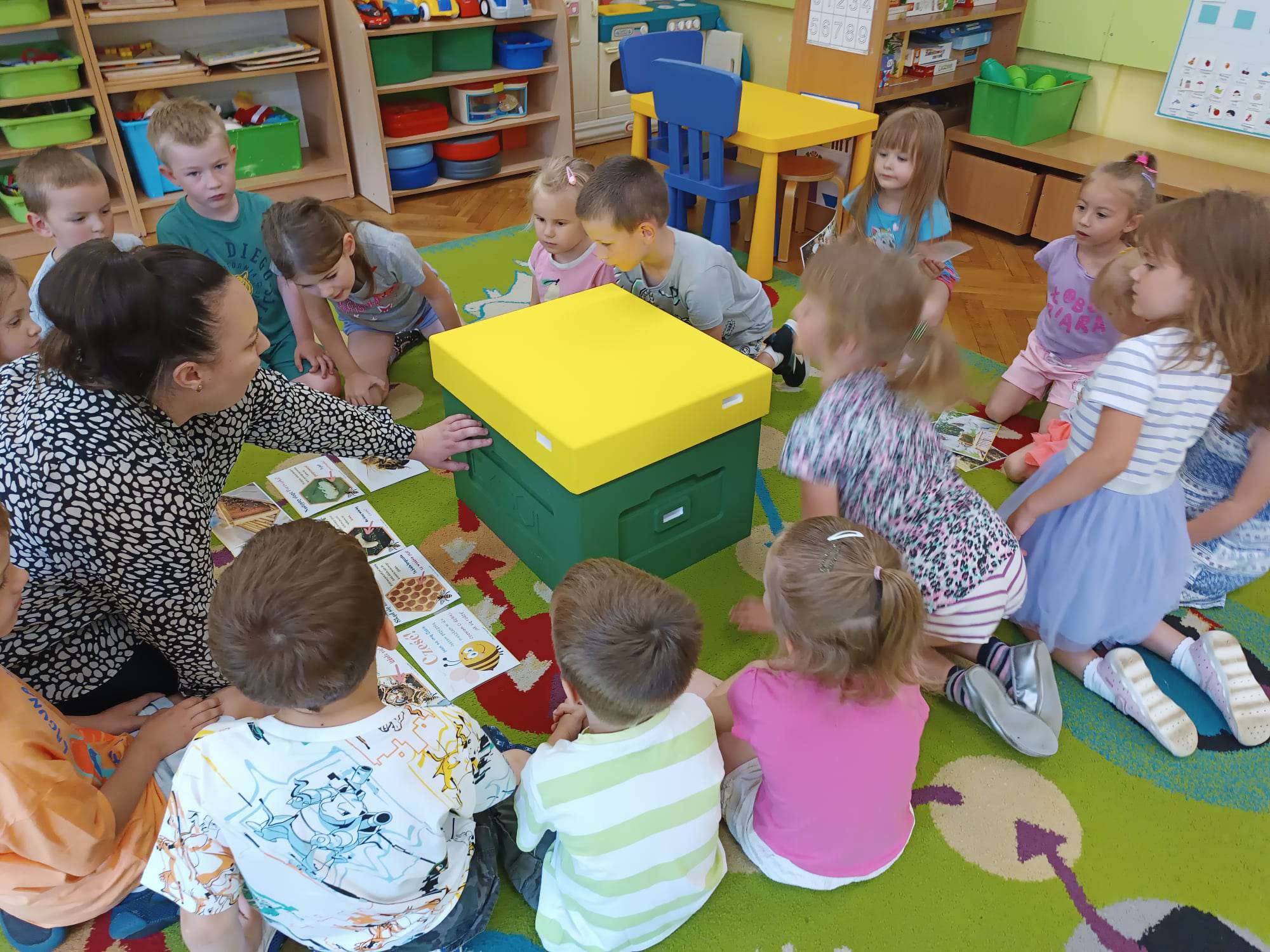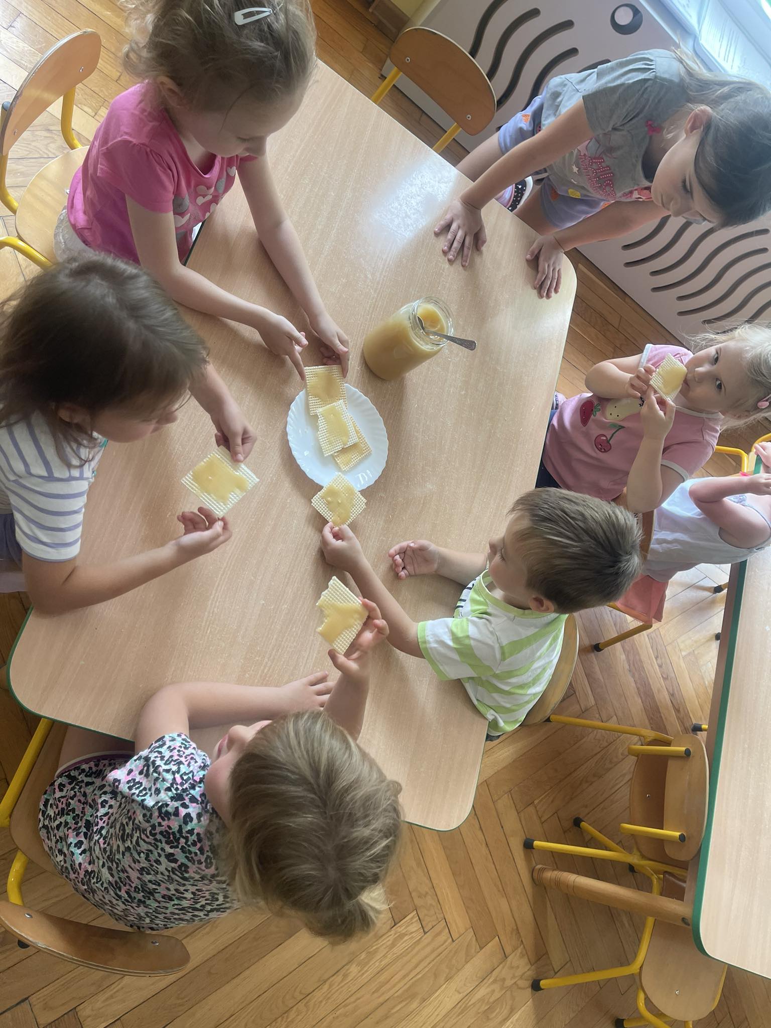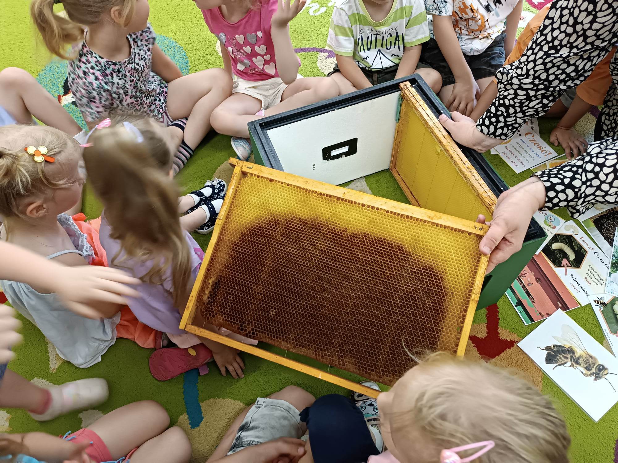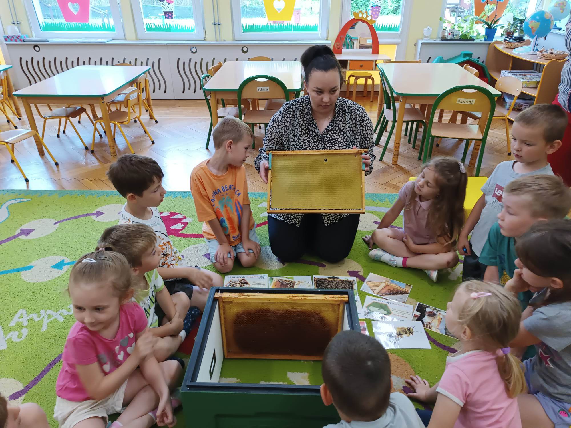 Dzieci z grupy „Biedronki“ aktywnie uczestniczyły w zajęciach poświęconych pszczołom. Przedszkolaki dowiedziały się jakie znaczenie ma praca pszczół dla świata przyrody, poznały cykl życia pszczoły oraz etapy powstawania miodu. Miały okazję zobaczyć prawdziwy ul, ramki oraz strój pszczelarza. Na zajęciach odbył się pszczeli koncert, dzieci zaprezentowały grę na instrumentach, a zabawy ruchowe i działania matematyczne podkreśliły atrakcyjność zajęć. Nie mogło również zabraknąć degustacji miodu, który bardzo im smakował.